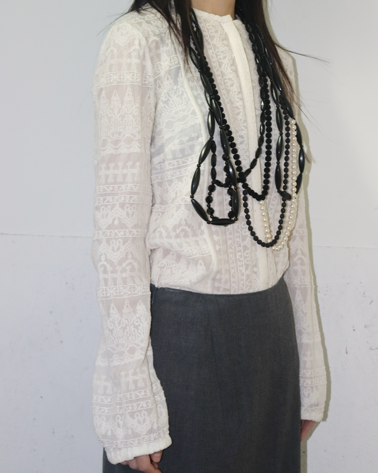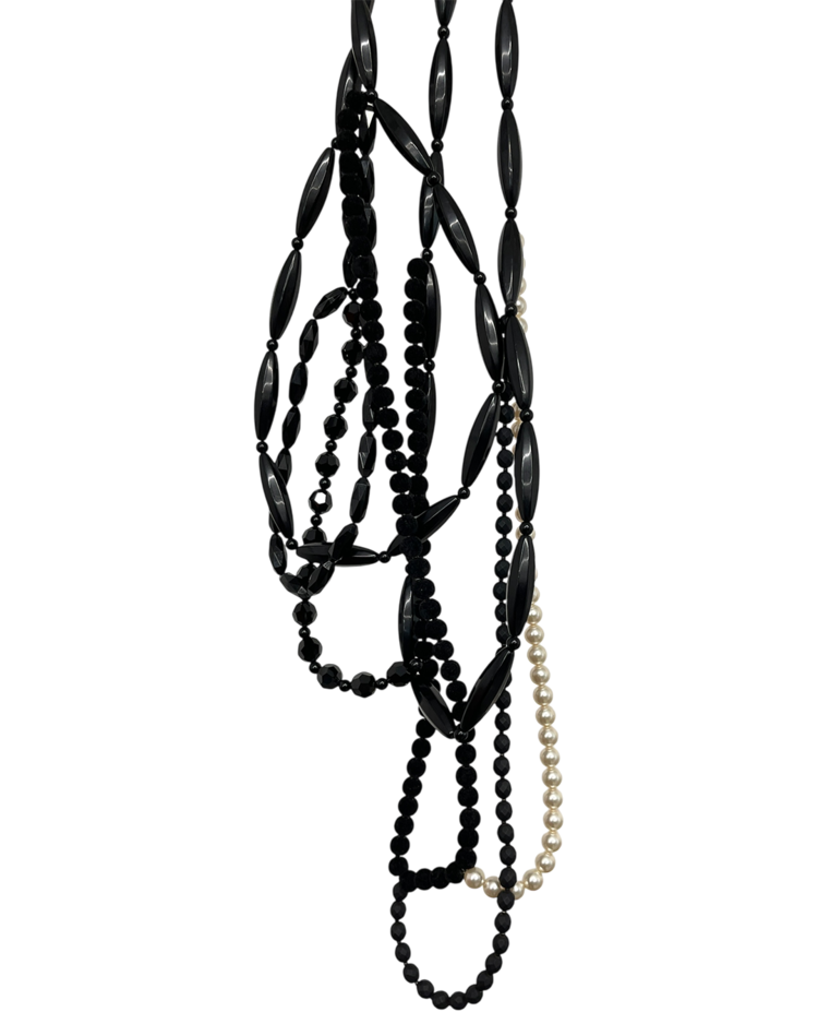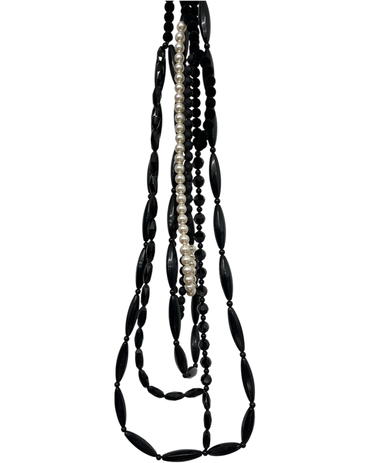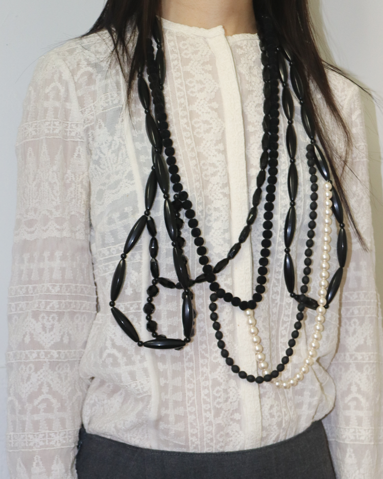 혁신적인 해체주의 미학으로 유명한 일본 브랜드 꼼데가르송의 제품입니다. 진주와 블랙 비즈가 레이어드 형태로 엮여 조화를 이루며, 체인을 두 겹으로 겹쳐서 착용하는 방식입니다. 클래식함과 실험적인 감각이 동시에 느껴지는 제품입니다.