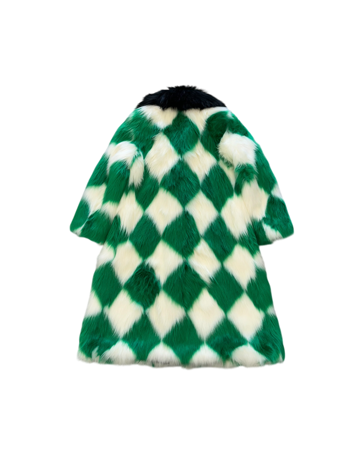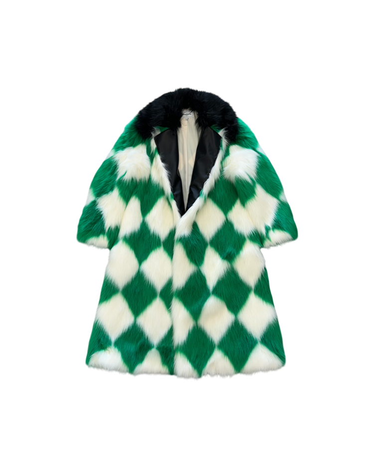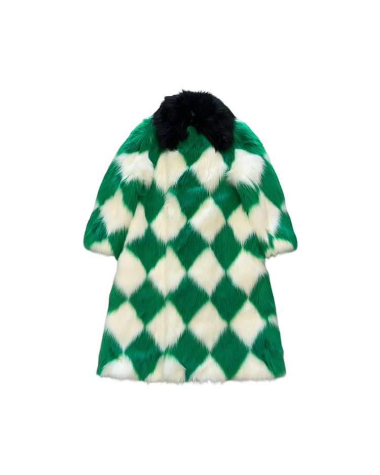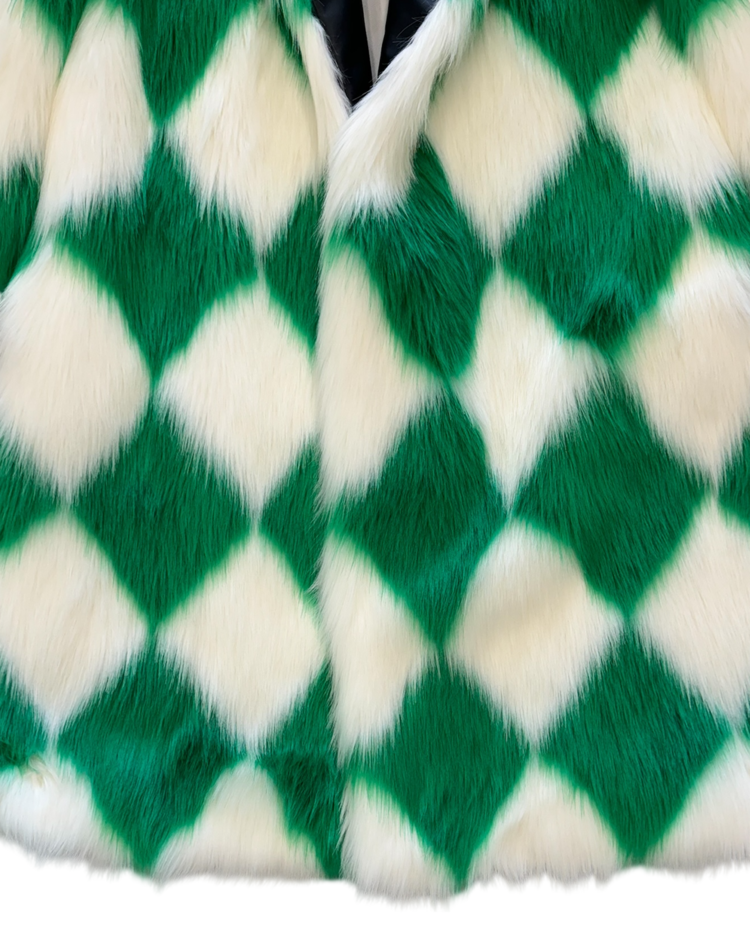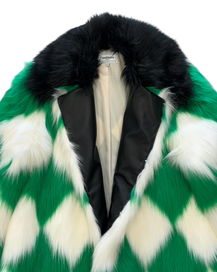 모로코적 낭만과 70's 글래머, 스포츠 무드를 결합한 감각적인 컬렉션을 전개하는 파리 기반 브랜드 카사블랑카의 제품입니다. 21A/W RTW에서 선보인 피스로, 선명한 그린과 화이트 컬러의 다이아몬드 패턴이 반복되며 시각적으로 강한 임팩트를 제공합니다. 여유 있는 실루엣과 퍼의 볼륨감으로 화려한 무드를 연출할 수 있는 아이템입니다.