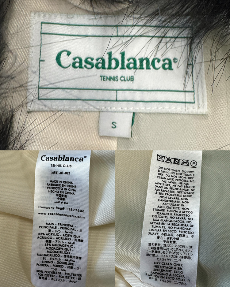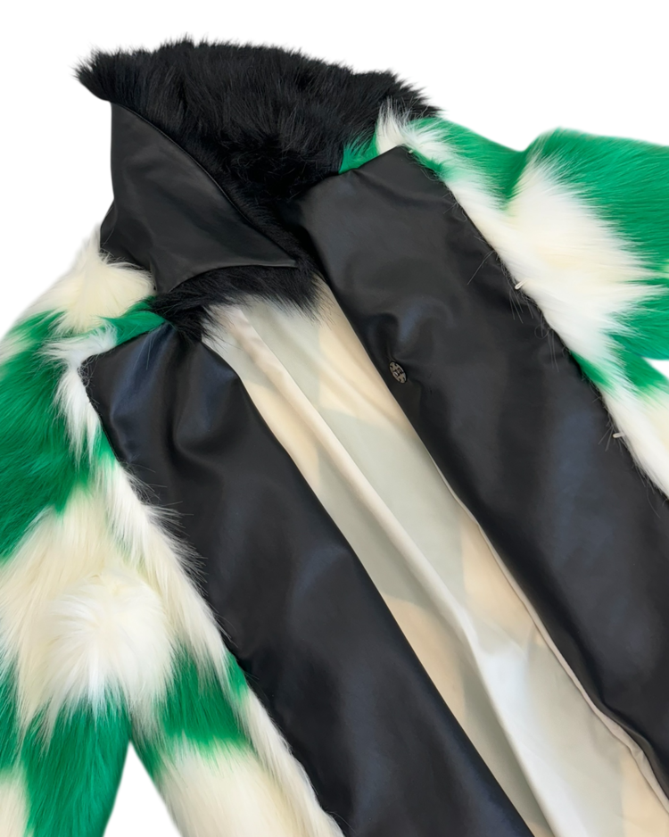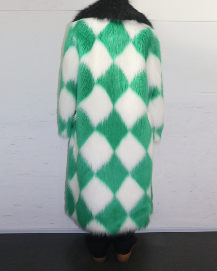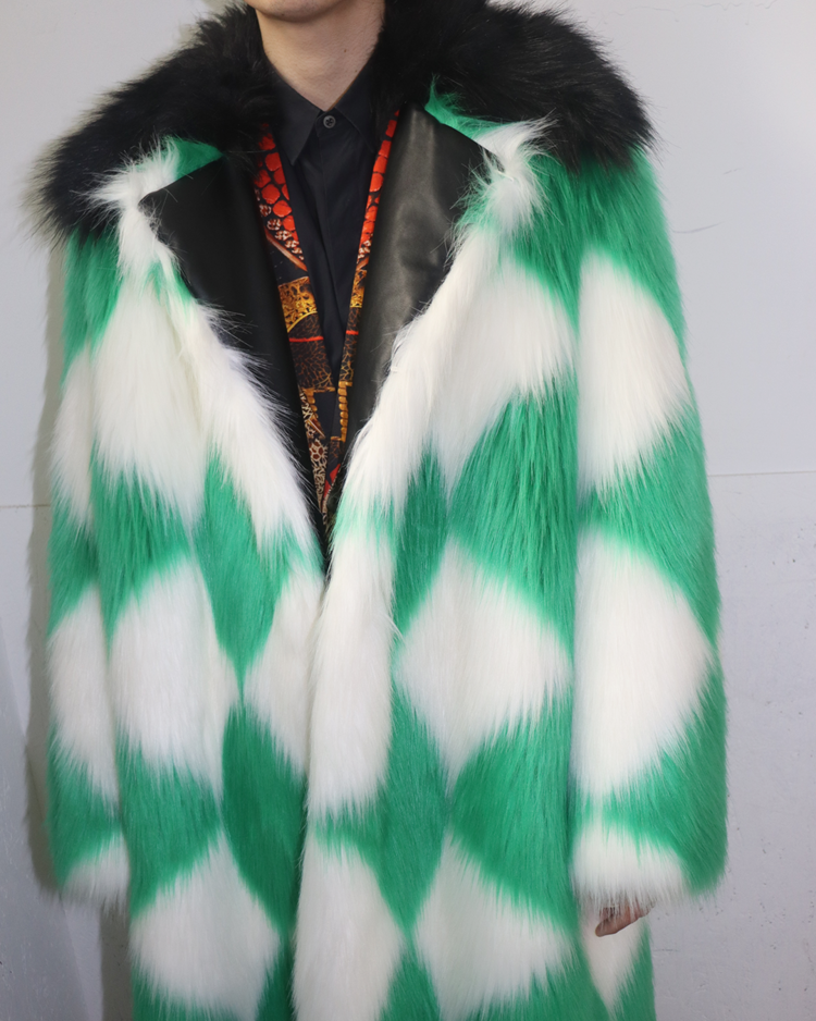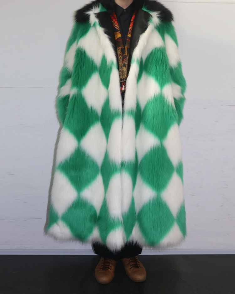 모로코적 낭만과 70's 글래머, 스포츠 무드를 결합한 감각적인 컬렉션을 전개하는 파리 기반 브랜드 카사블랑카의 제품입니다. 21A/W RTW에서 선보인 피스로, 선명한 그린과 화이트 컬러의 다이아몬드 패턴이 반복되며 시각적으로 강한 임팩트를 제공합니다. 여유 있는 실루엣과 퍼의 볼륨감으로 화려한 무드를 연출할 수 있는 아이템입니다.