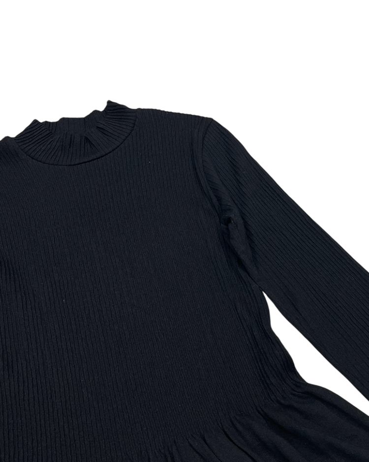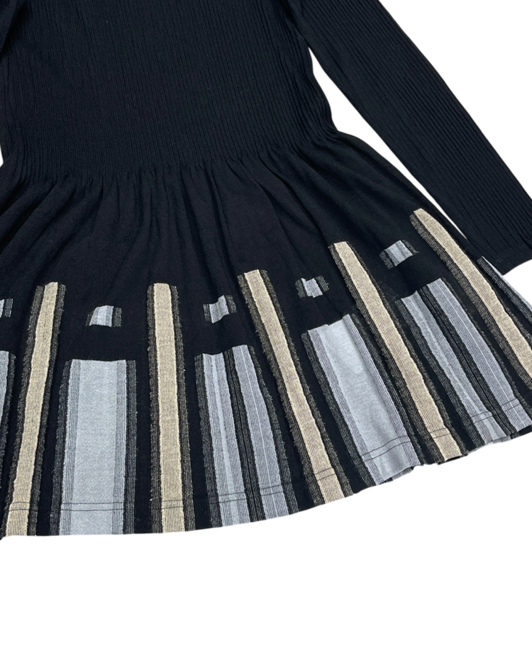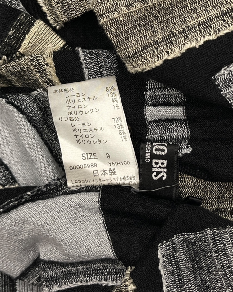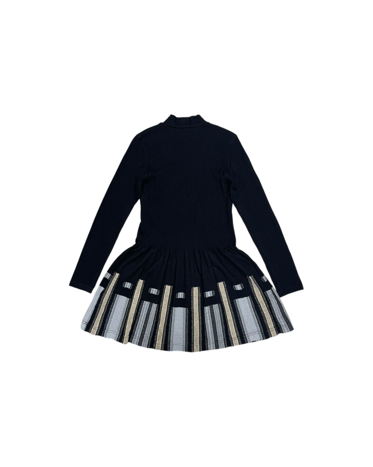 여성 기성복에 큰 영향을 주었던 브랜드 히로코 코시노의 제품입니다. 탑 부분은 부드러운 니트 조직으로 몸에 맞게 핏되며, 플레어 스커트 디자인이 여성스러움을 강조합니다. 하단의 스트라이프 패널은 단조로운 니트에 변화를 주며, 우아한 텍스처와 컬러 조합으로 시선을 끌어냅니다.