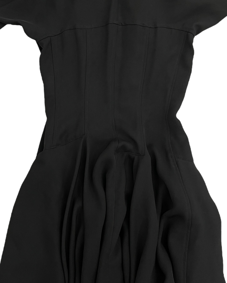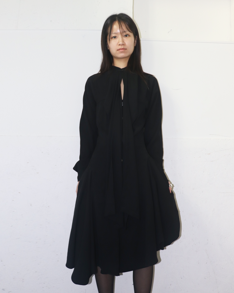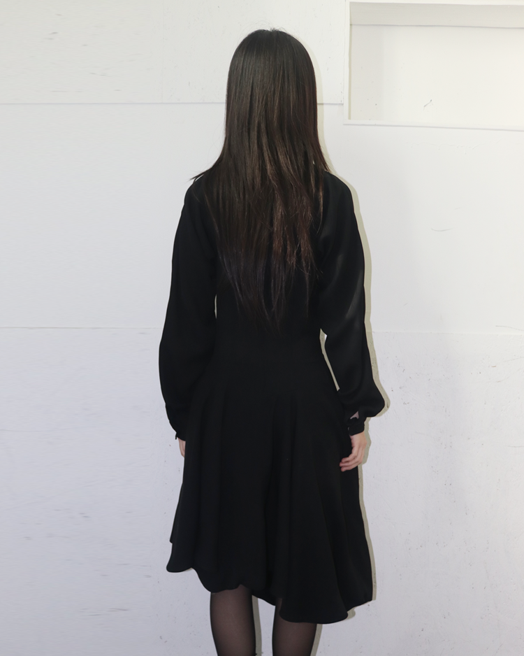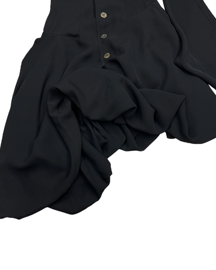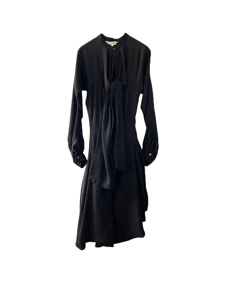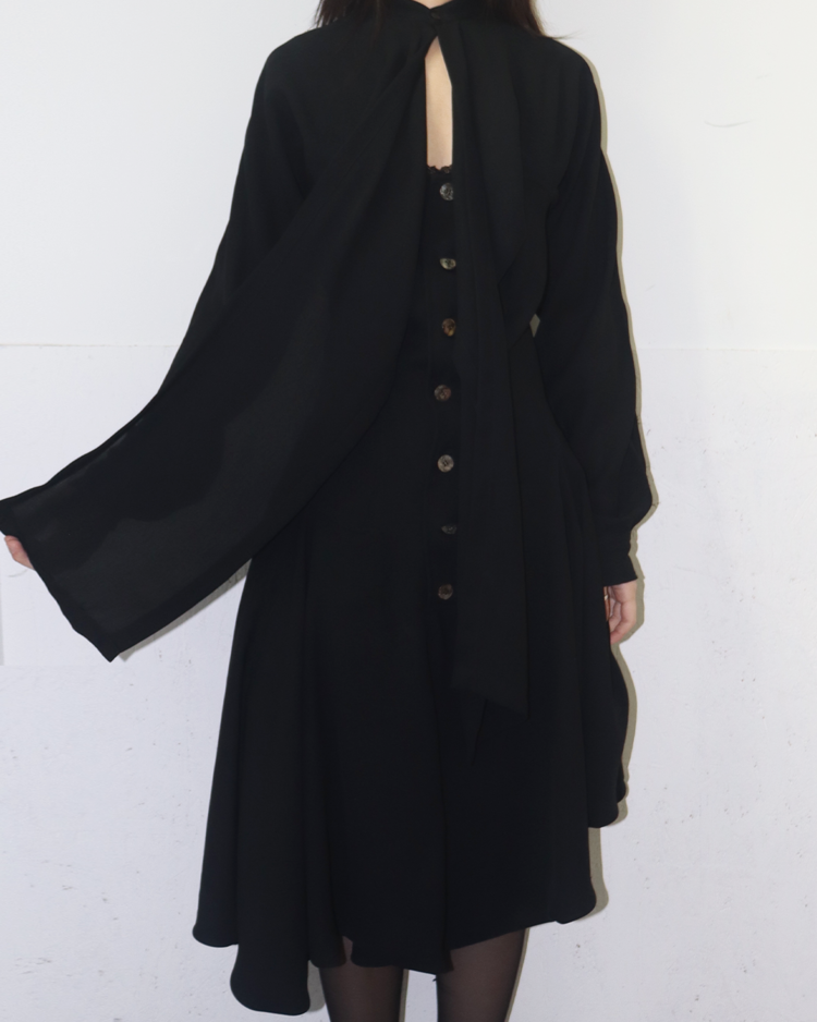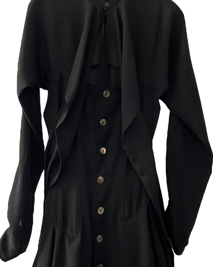혁신적인 해체주의 미학으로 알려진 일본 브랜드 꼼데가르송의 제품입니다. 넥 라인에서 이어지는 긴 스카프형 드레이프가 인상적이며, 버튼으로 구성된 내부 원피스 형태가 이중 구조를 이룹니다. 비대칭적으로 떨어지는 밑단과 웨이스트 절개 라인이 볼륨감을 강조하며, 미니멀하지만 섬세한 절제미를 담아냈습니다. 꼼데가르송의 특유의 조형미가 응축된 아카이브 피스입니다.