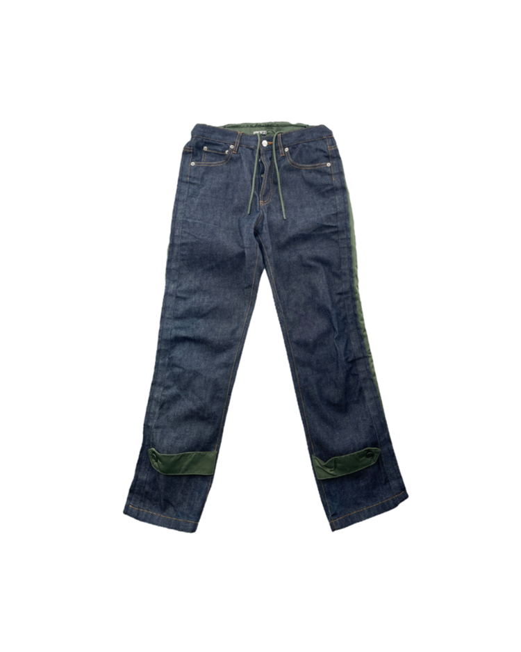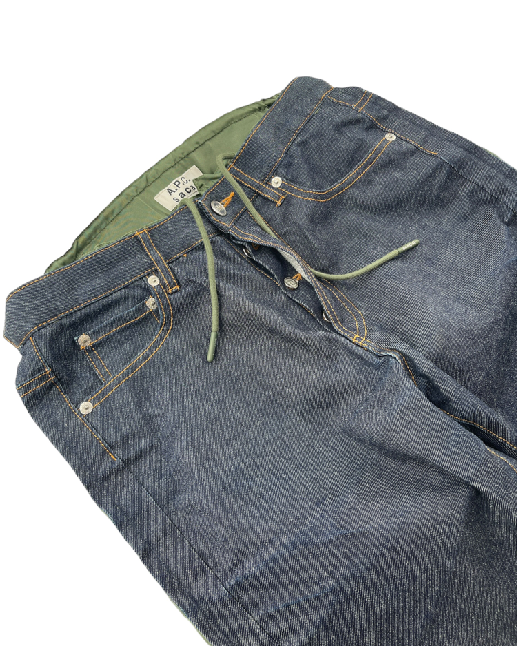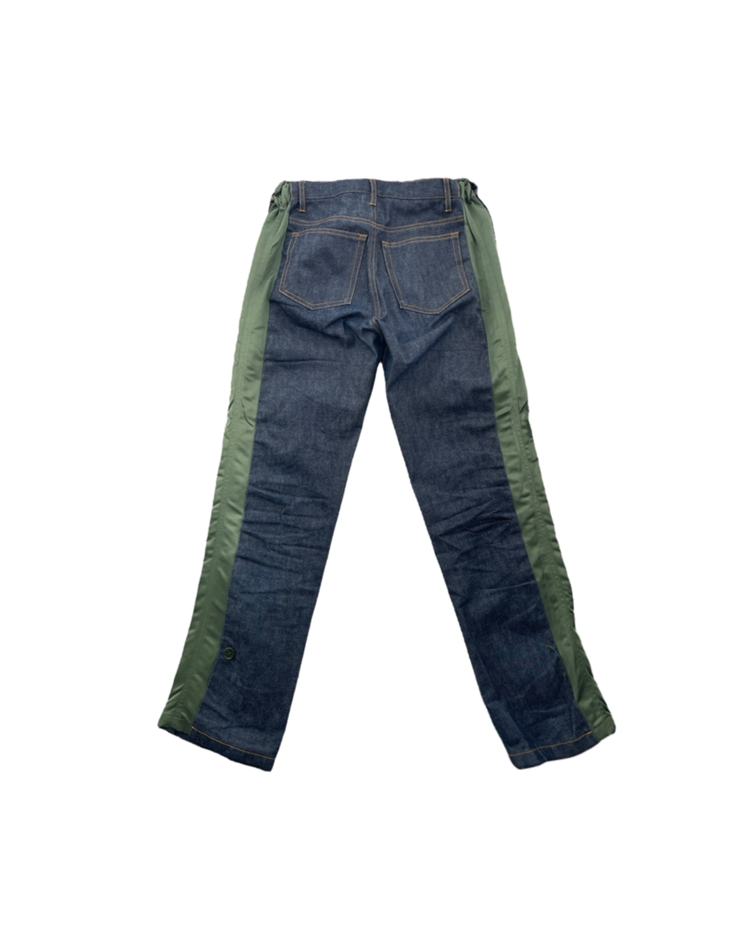 밀리터리 베이스의 나일론 소재와 데님과의 결합으로, 사카이의 해체주의적 디테일이 돋보이는 아페쎄 사와의 협업 데님 팬츠입니다.