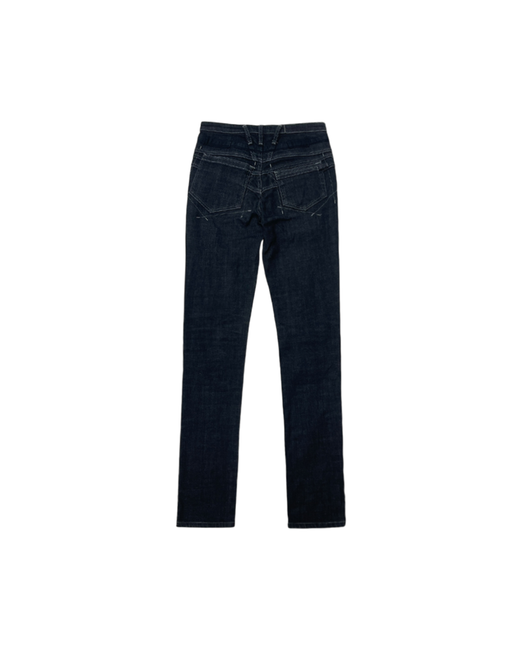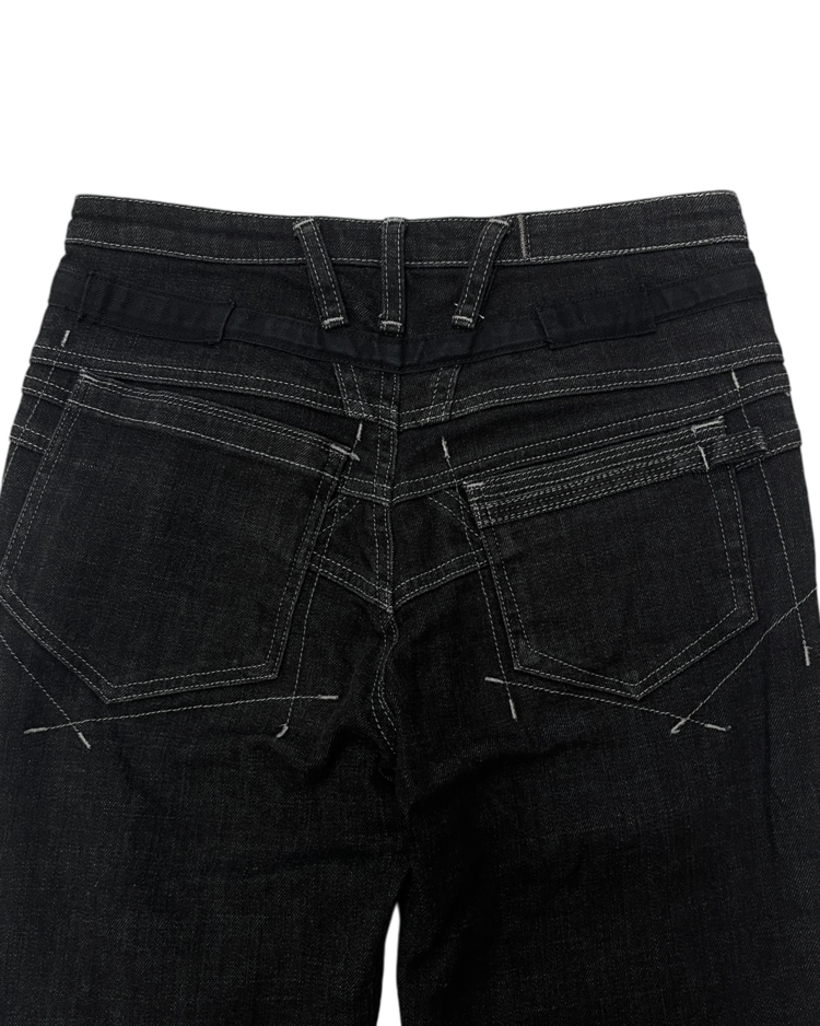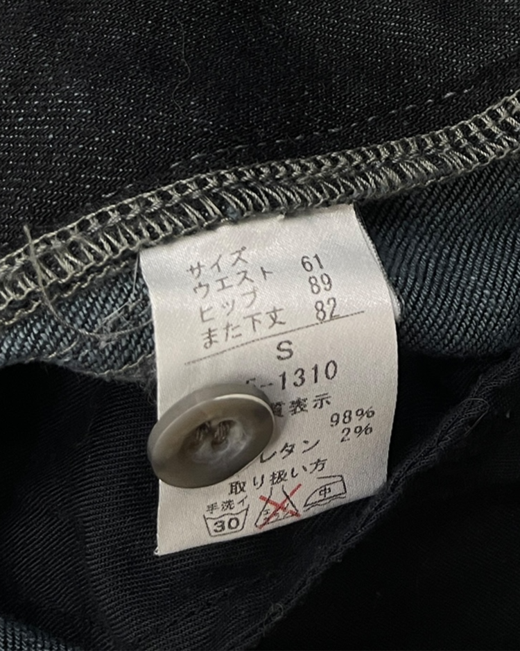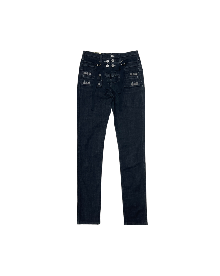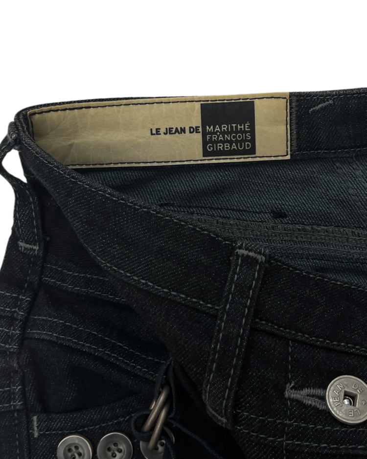 유러피안 캐주얼 브랜드 마리떼 프랑소와 저버의 데님 팬츠입니다. 전면부 버튼과 스트랩 디테일이 매력적인 제품입니다.