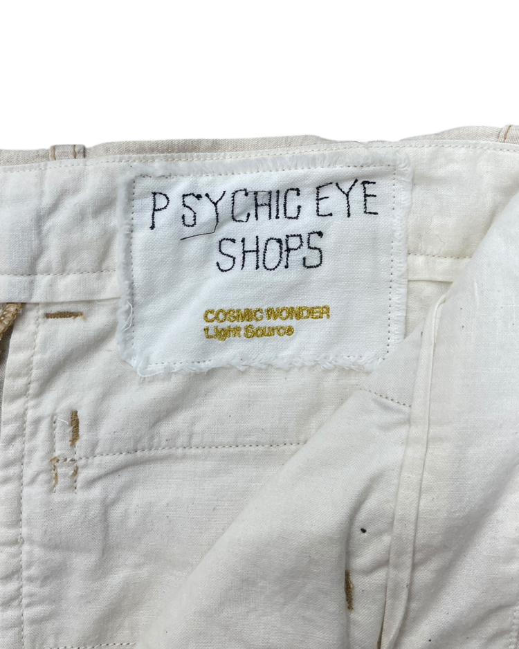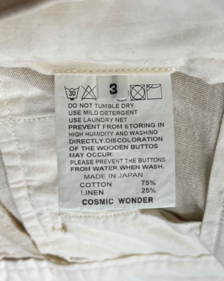 예술가인 유키노리 마에다가 전개하는 종합 예술 프로그램 코스믹 원더의 제품입니다. 양 쪽 무릎의 패치가 매력적인 제품입니다.