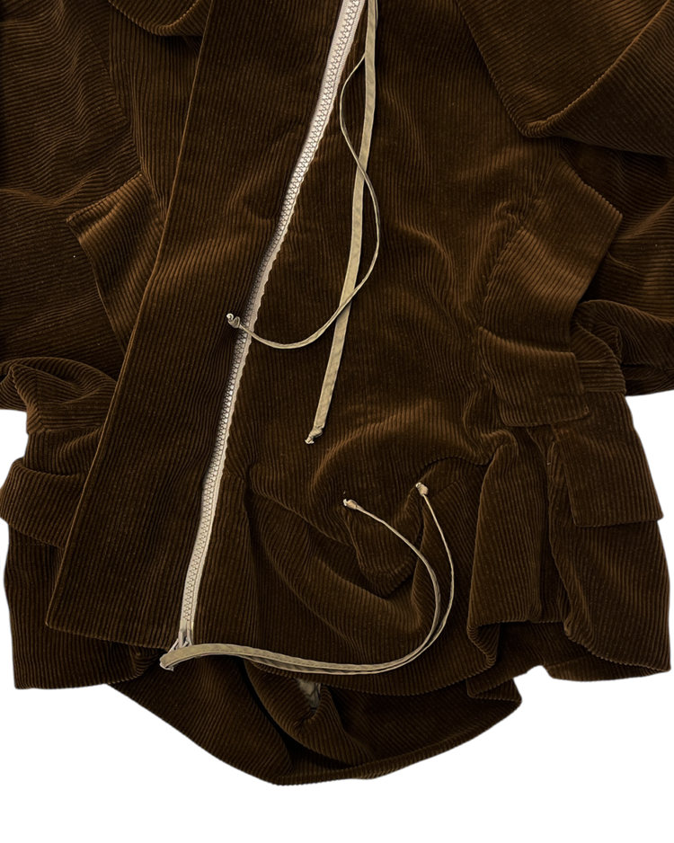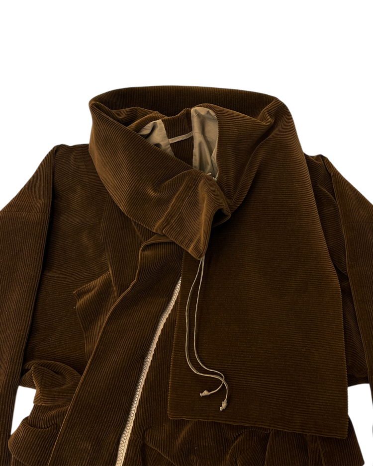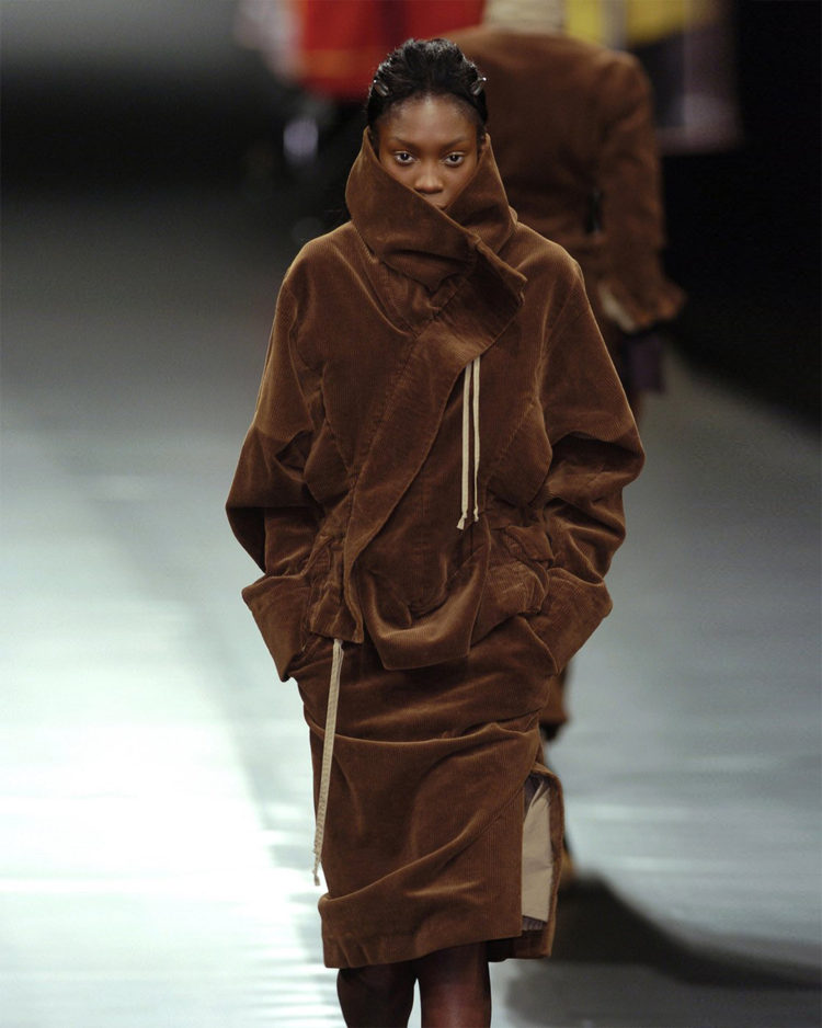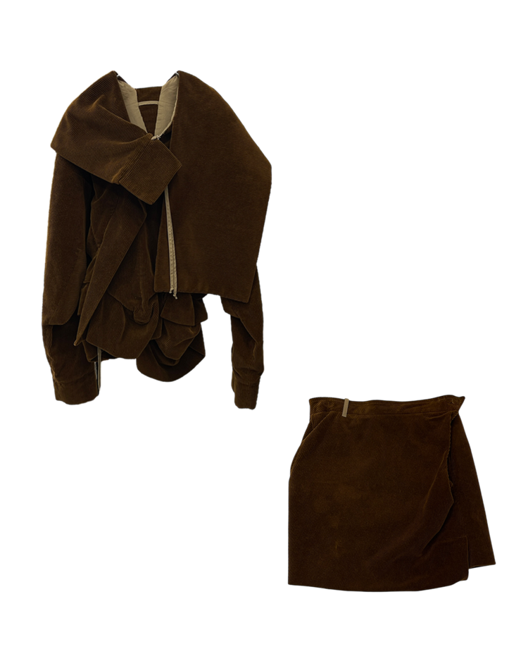 락 펑크 기반 브랜드 비비안 웨스트우드 2004년 가을 / 겨울 컬렉션 셋업입니다. 비대칭적인 랩 디자인과 구조적인 드레이핑이 매력적이며, 길게 늘어진 드로스트링이 언밸런스한 매력을 극대화 시켜줍니다.