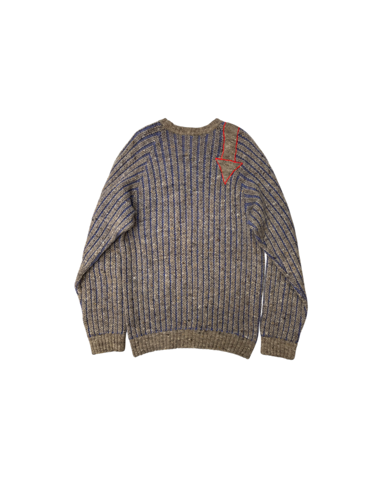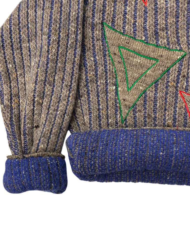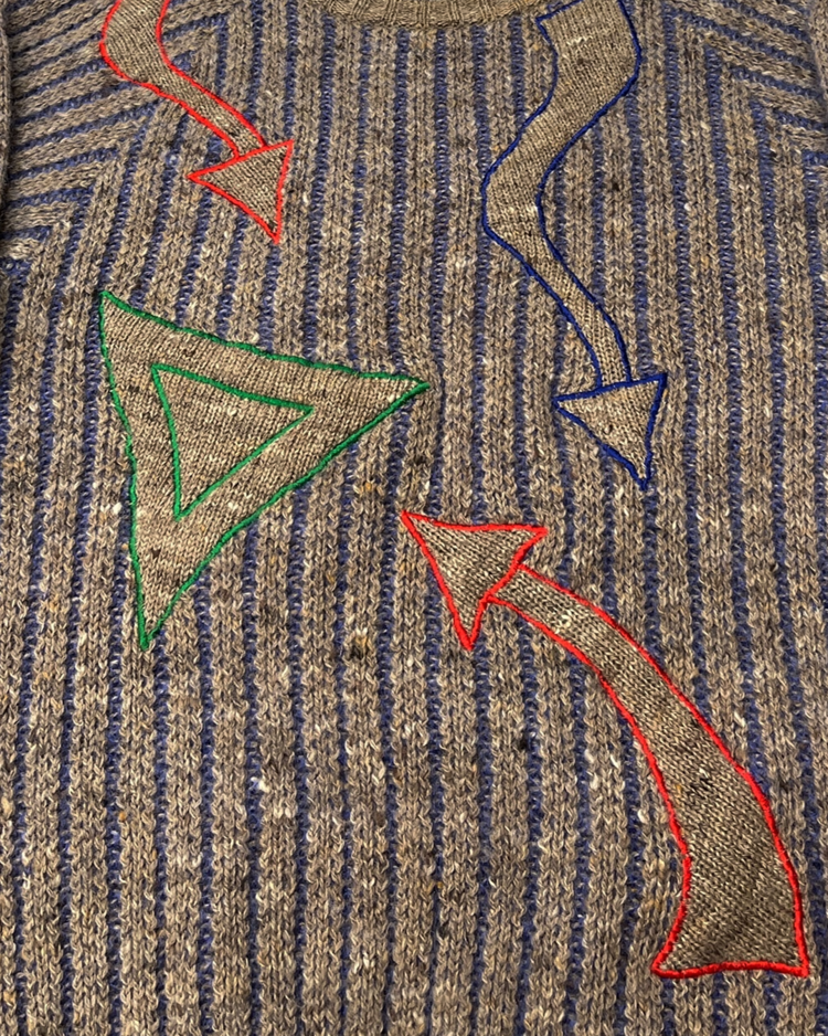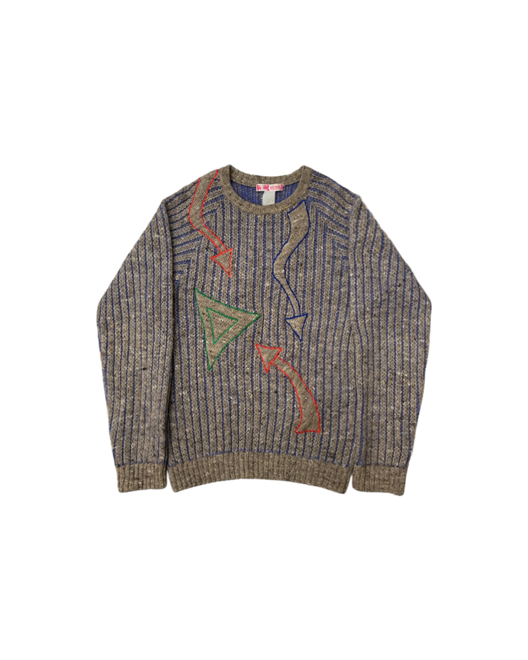 아방가르드한 패턴과 대담한 그래픽 요소가 특징인 간사이 인터내셔널의 제품입니다. 전면부 화살표와 삼각형 그래픽 자수가 입체적인 효과를 주며, 리브드 조직이 매력적인 제품입니다.