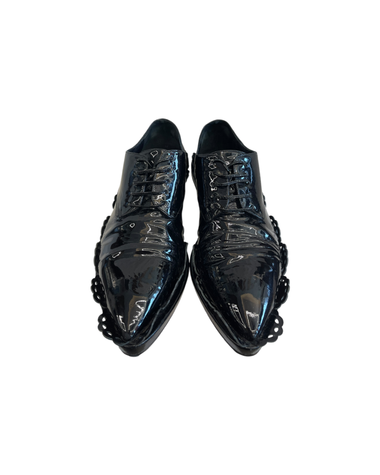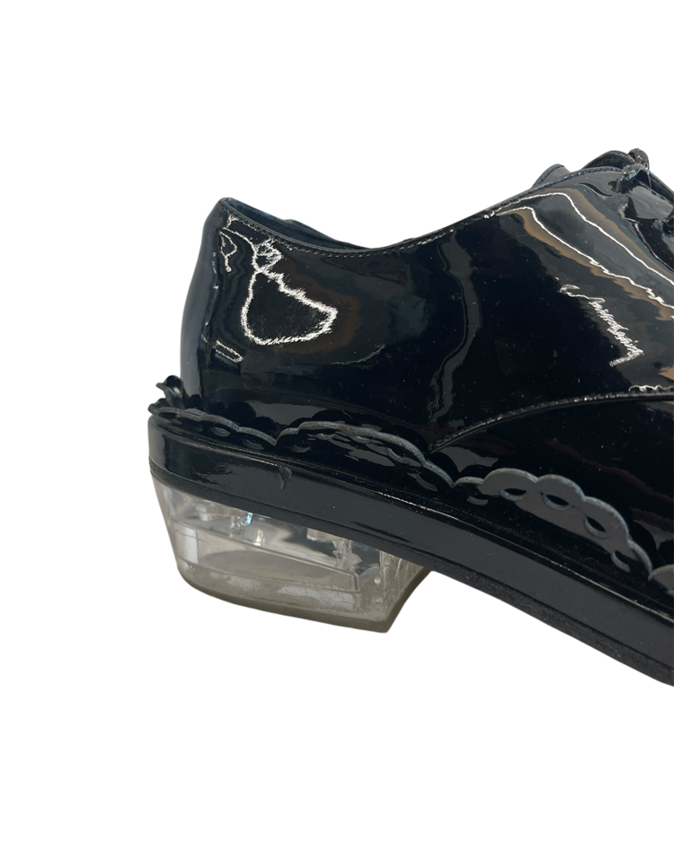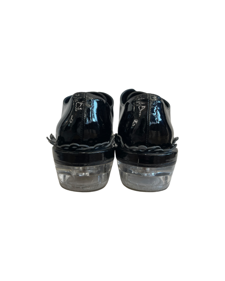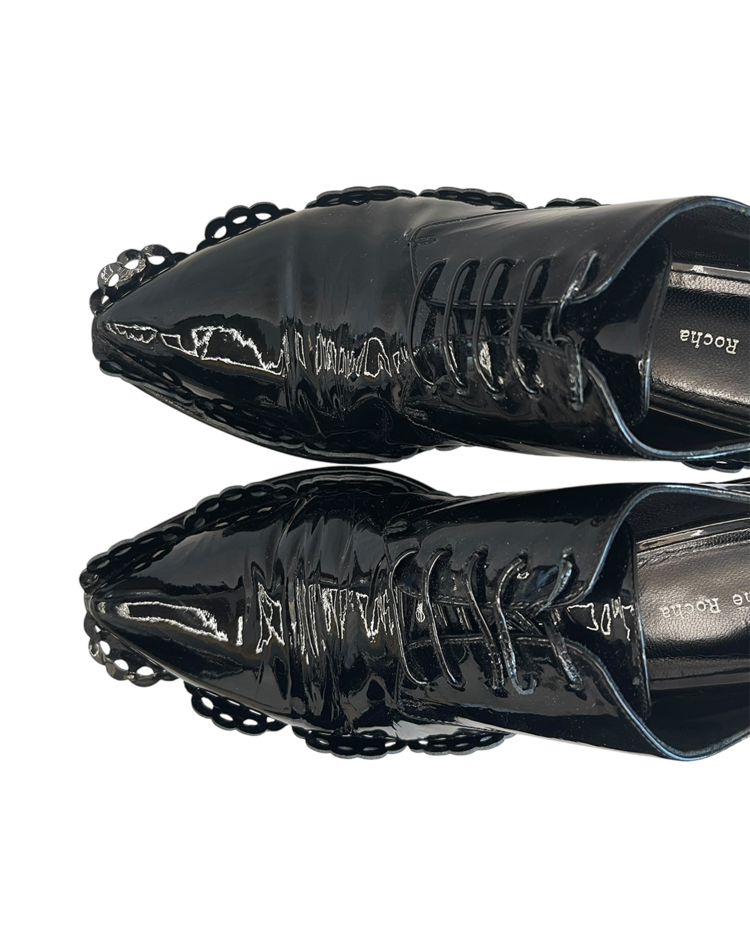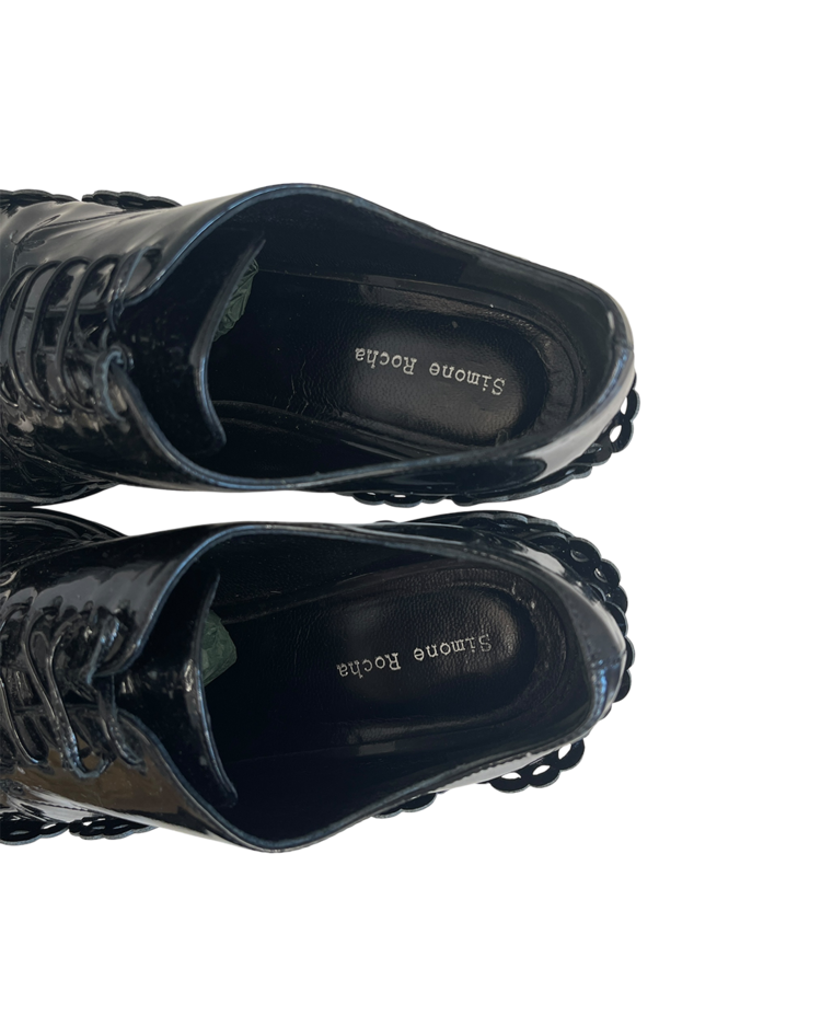 여성스러운 디자인과 구조적인 실루엣이 특징인 시몬 로샤의 더비슈즈입니다. 프릴 모양의 디테일과 투명한 굽이 포인트입니다.