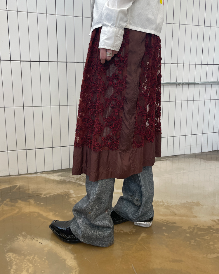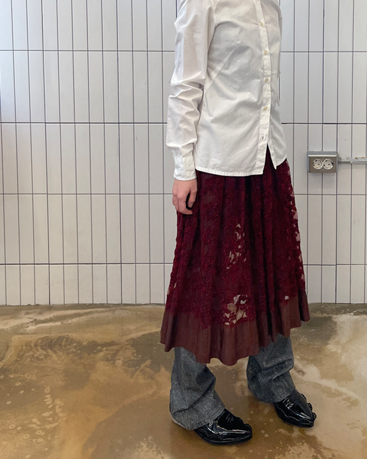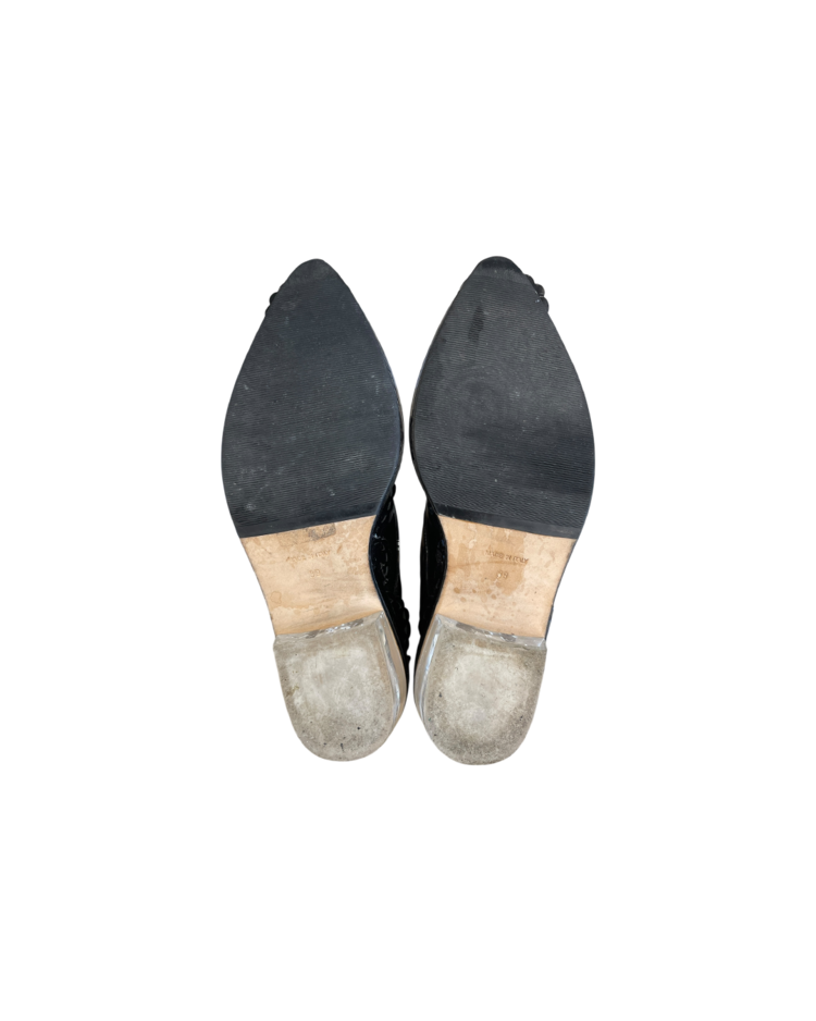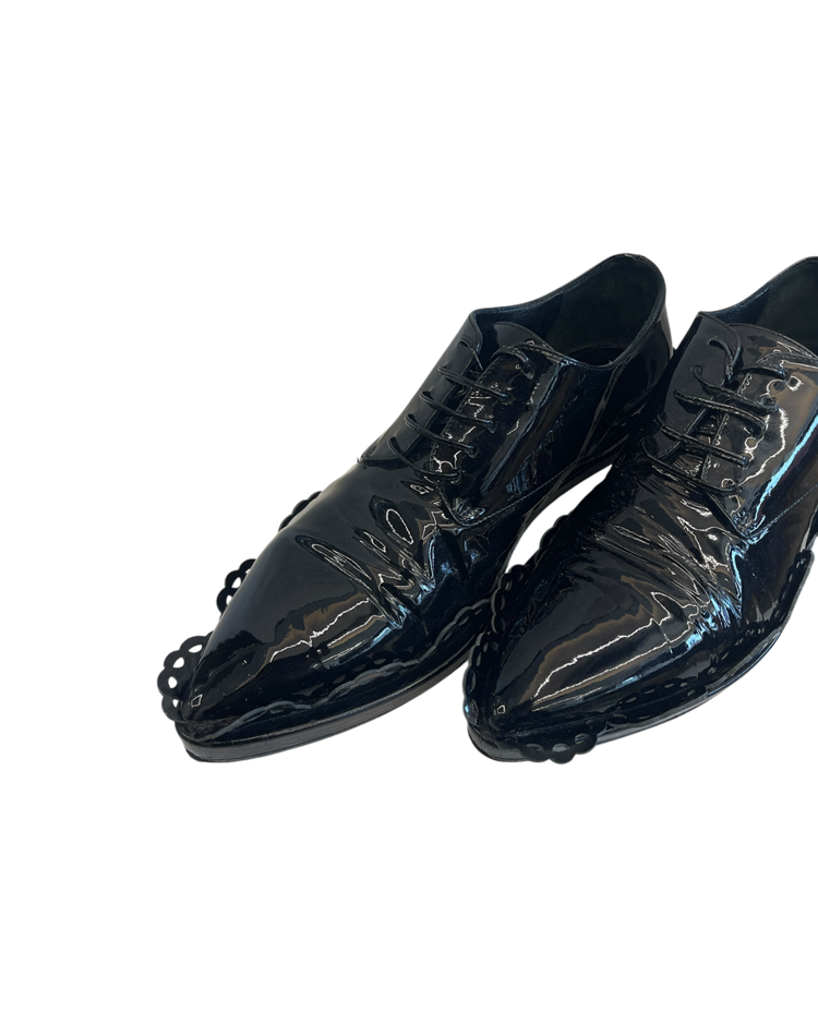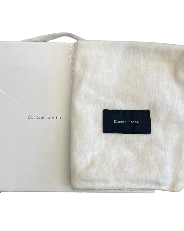 여성스러운 디자인과 구조적인 실루엣이 특징인 시몬 로샤의 더비슈즈입니다. 프릴 모양의 디테일과 투명한 굽이 포인트입니다.