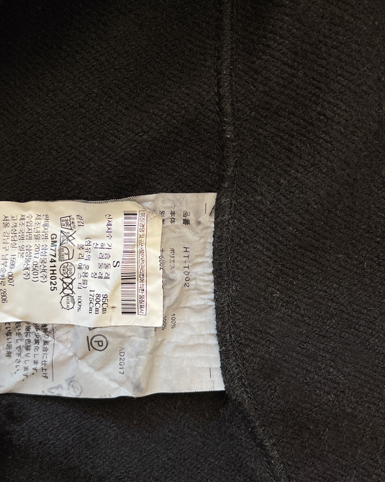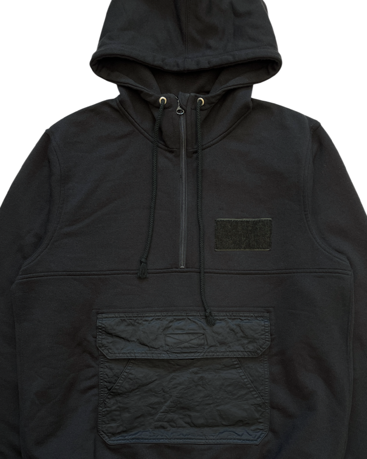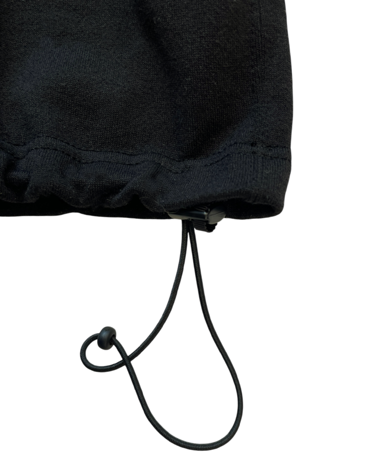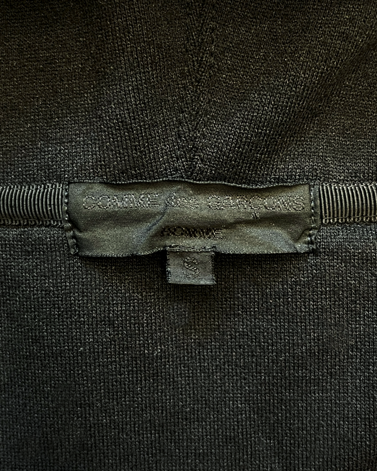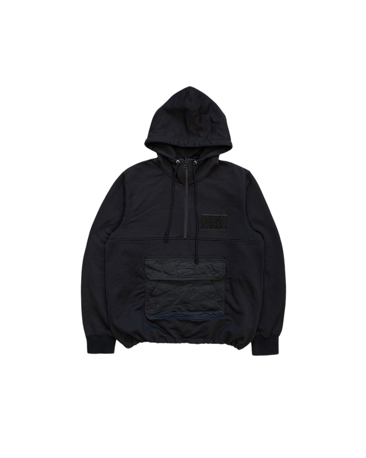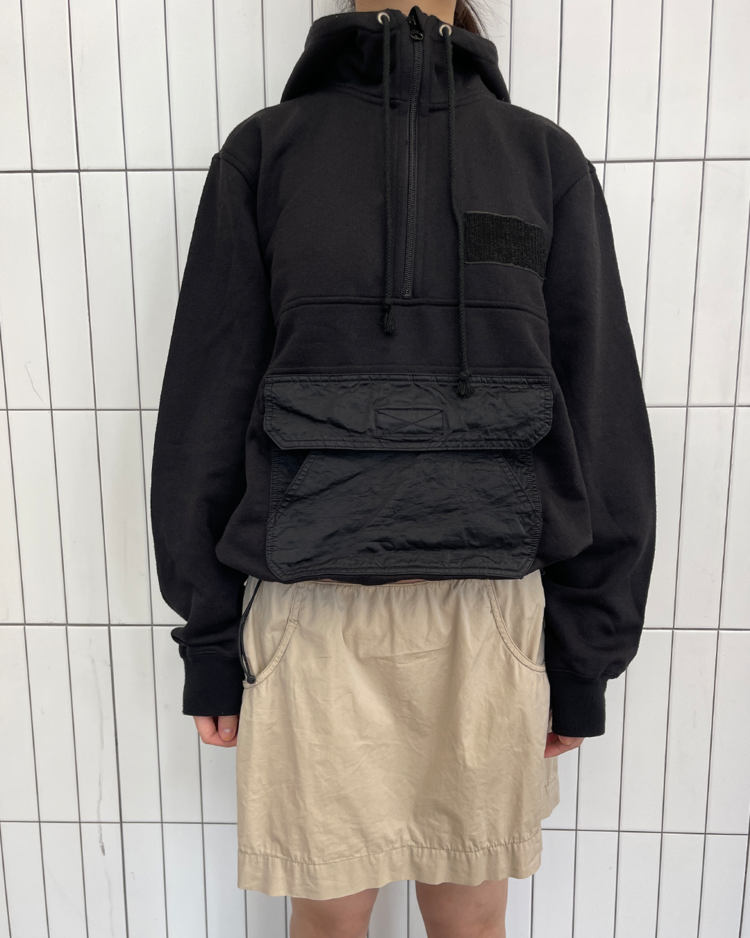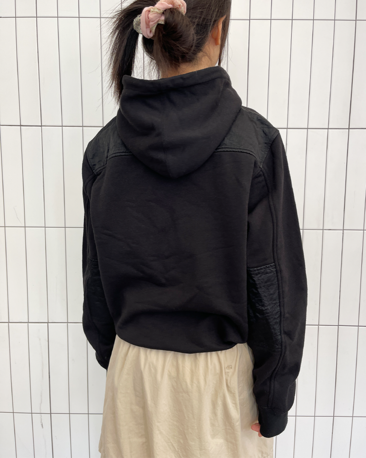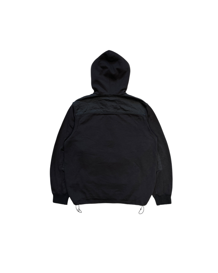 꼼데가르송 옴므의 후드입니다. 나일론 패널이 포인트이며, 밑단을 드로우스트링으로 조절할 수 있습니다.