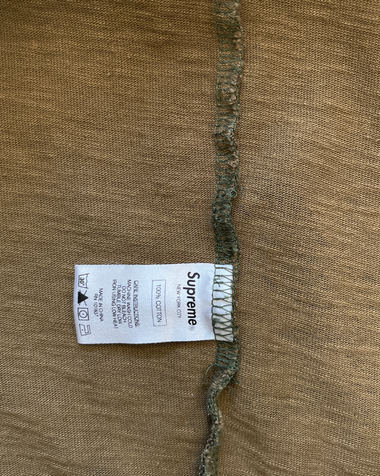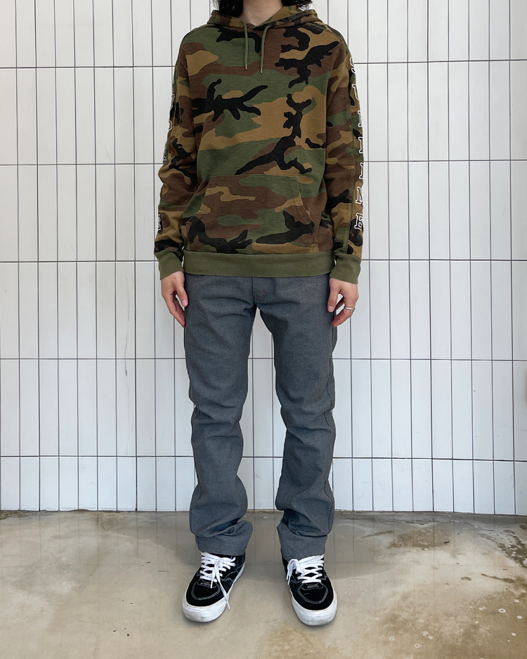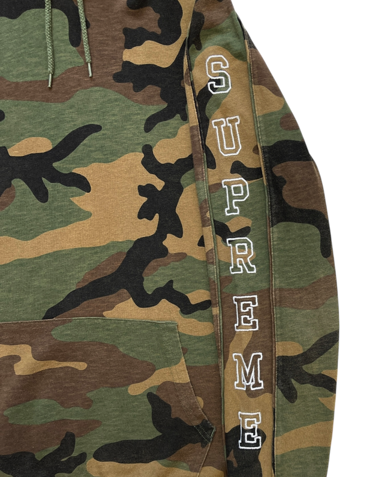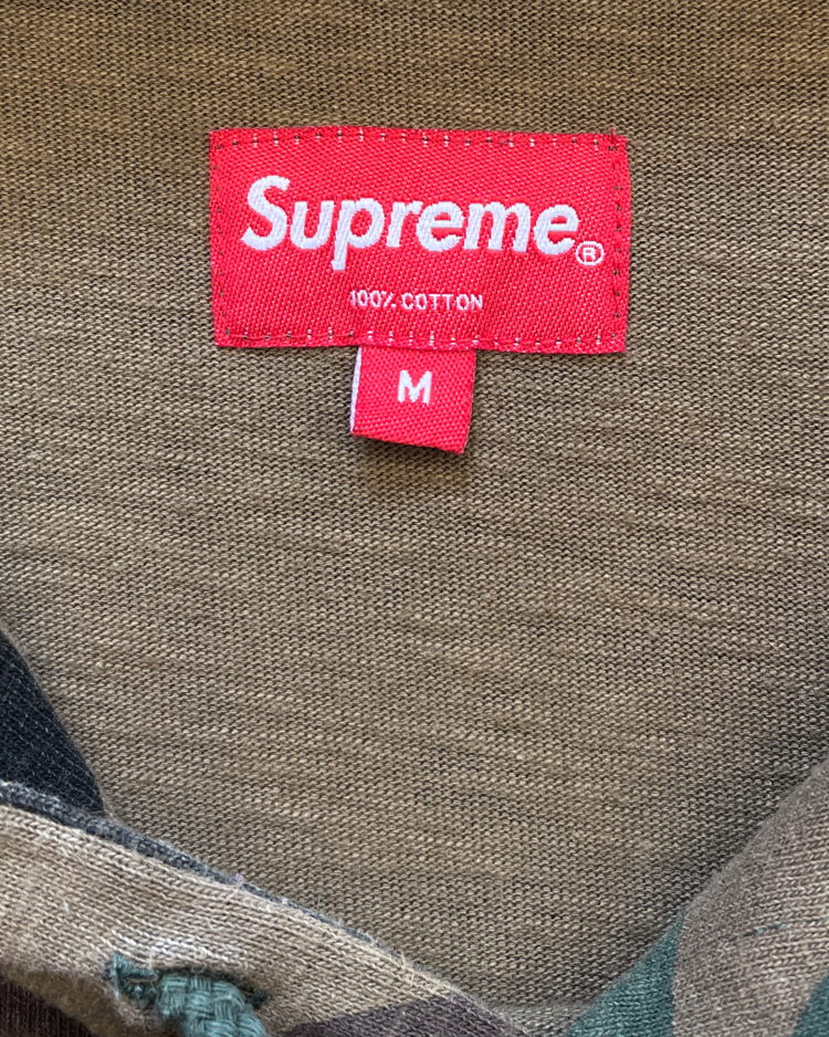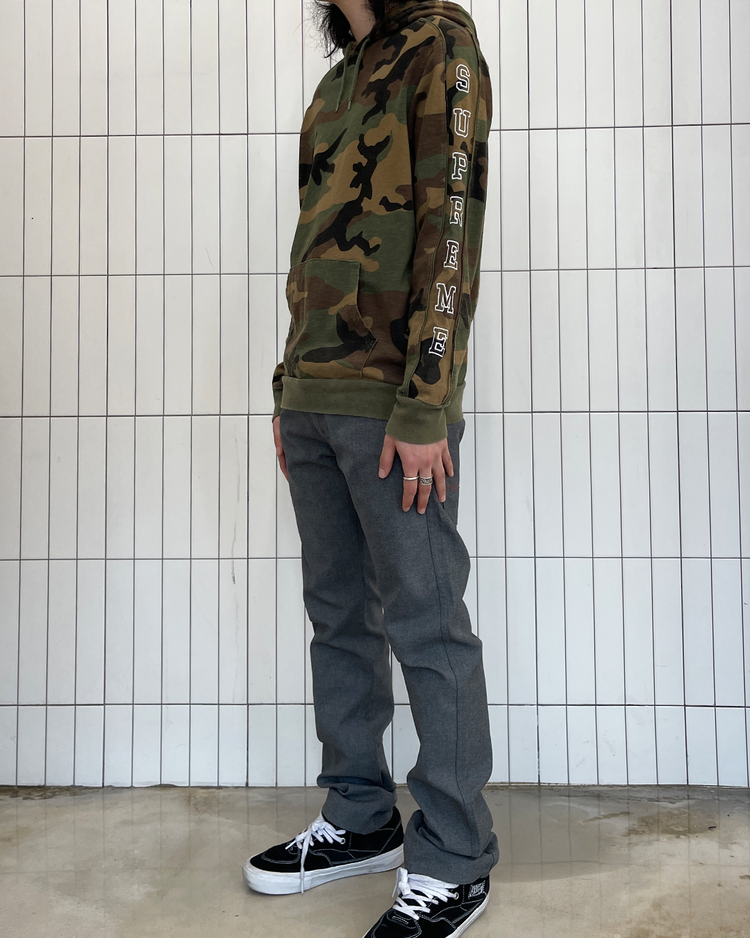 스트리트 패션과 스케이트 문화를 대표하는 뉴욕의 브랜드 슈프림의 제품입니다. 슈프림의 카모 패턴에 팔에 자수가 새겨져 있습니다.
