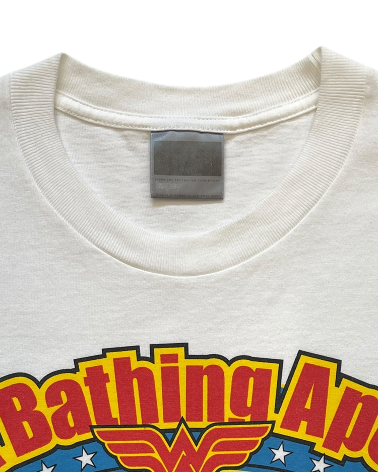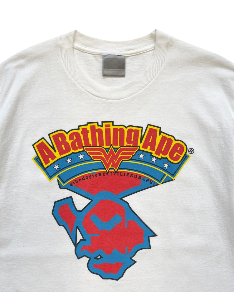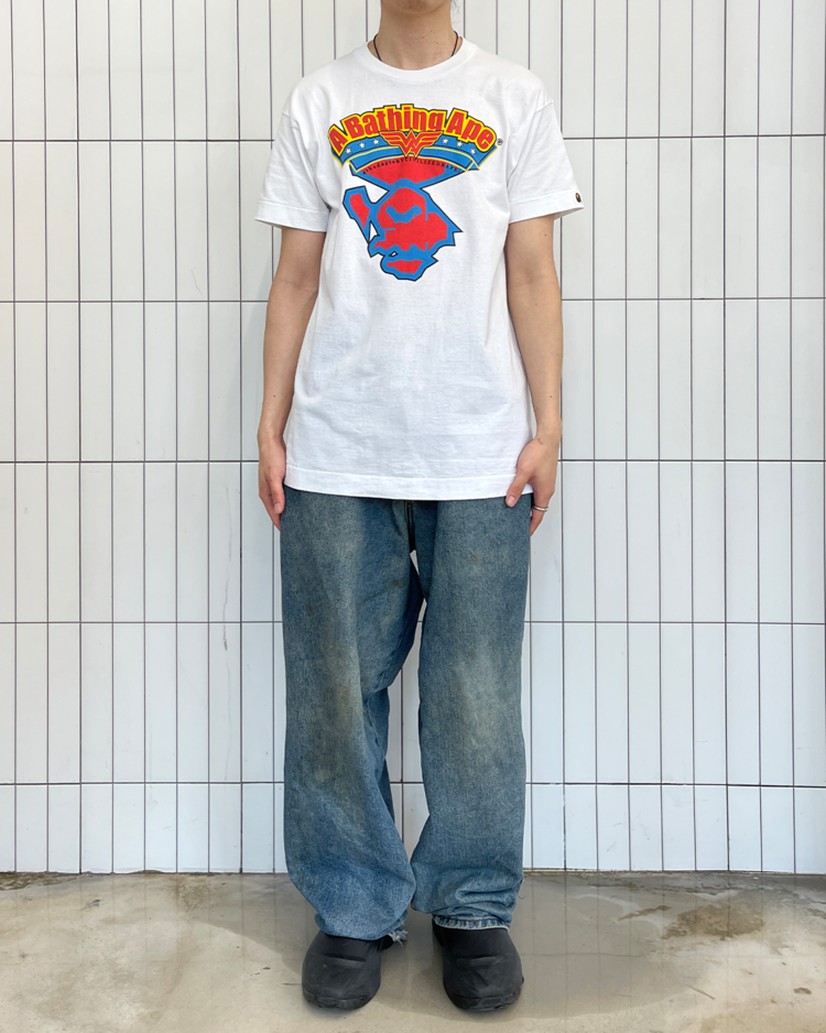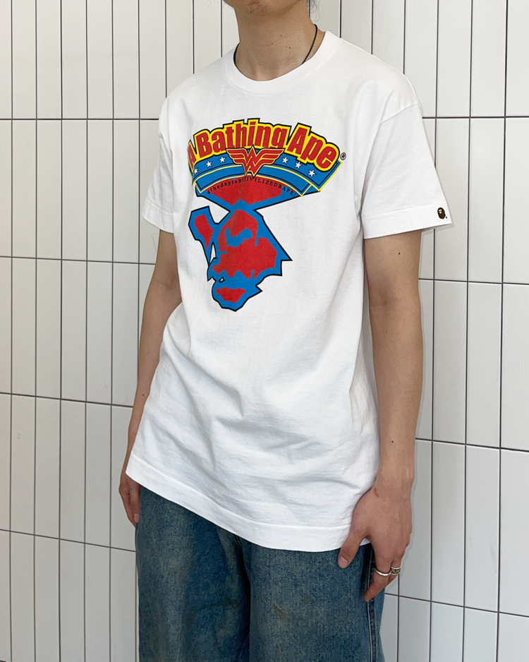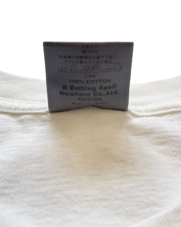 1993년 일본에서 설립되어 힙합 문화와 스트릿 패션에 큰 영향을 끼친 베이프의 티셔츠입니다. 90년대 제품으로 소매와 밑단 싱글 스티치와 옆라인에 봉제선이 없는 방식으로 제작되었습니다.