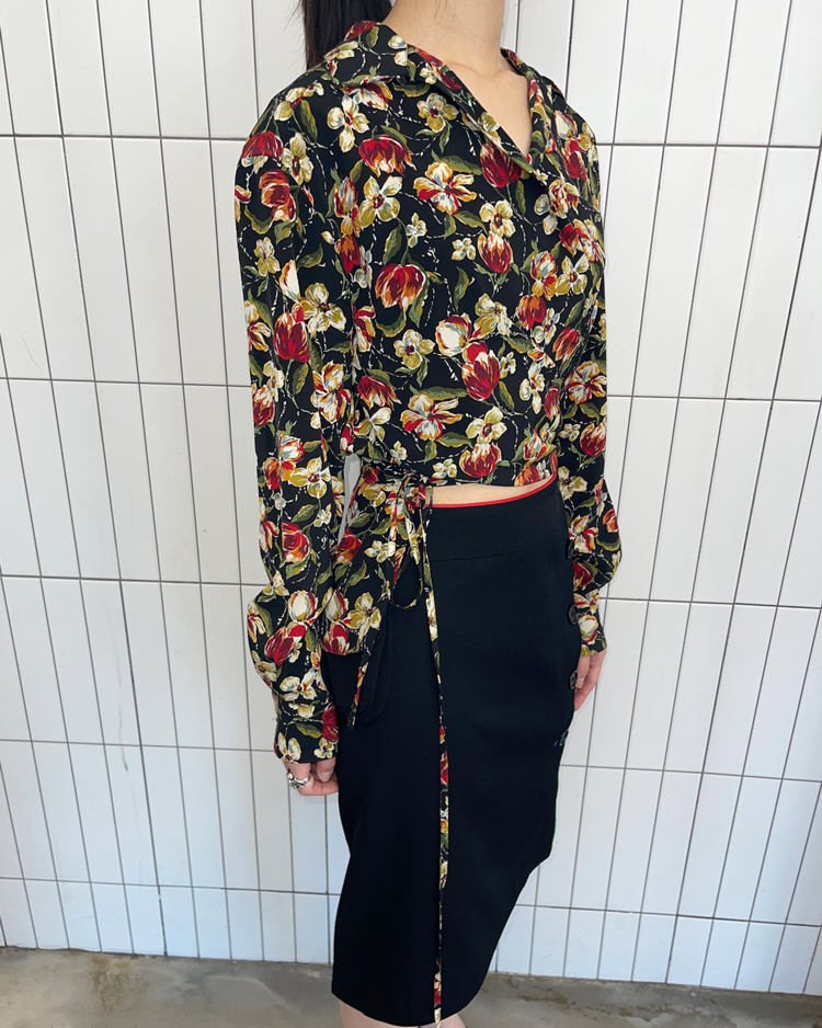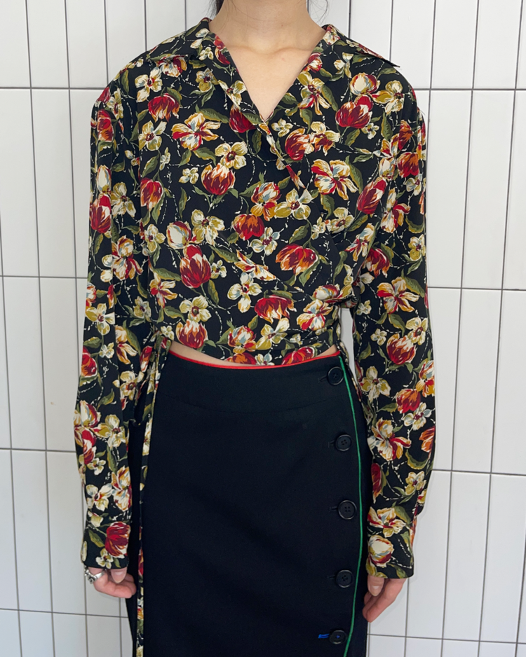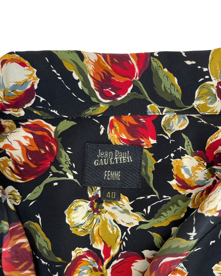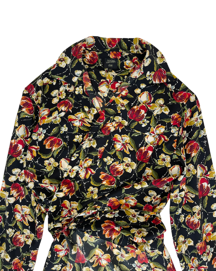 자연스러운 공식을 무너뜨리고 새로운 발상으로 파격적인 컬렉션을 전개하여 패션계의 악동으로 불리는 장 폴 고티에의 제품입니다. 랩 형태로 여며 입는 블라우스로, 러프한 핏을 연출할 수 있습니다. 강렬한 프린트와 색감이 특징입니다.