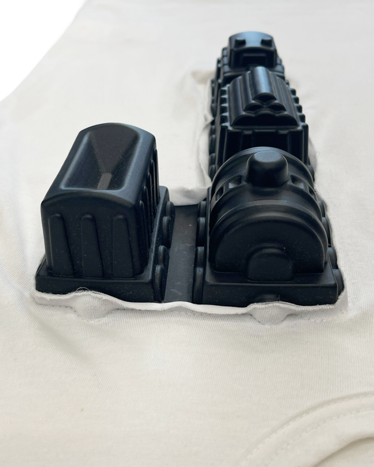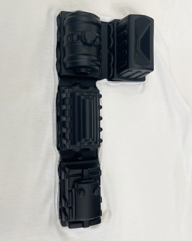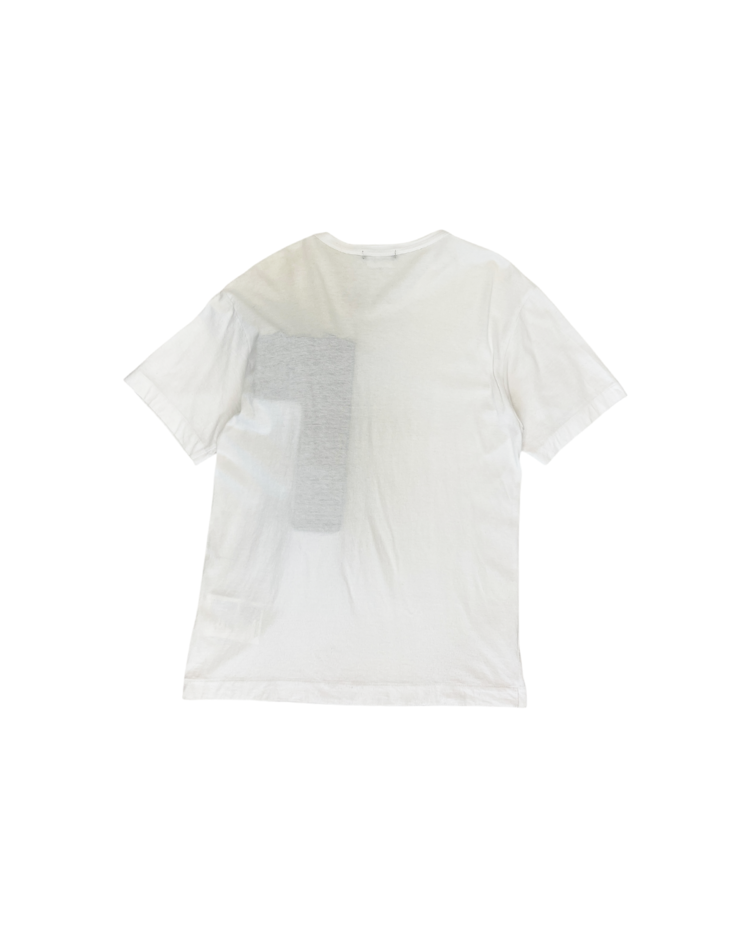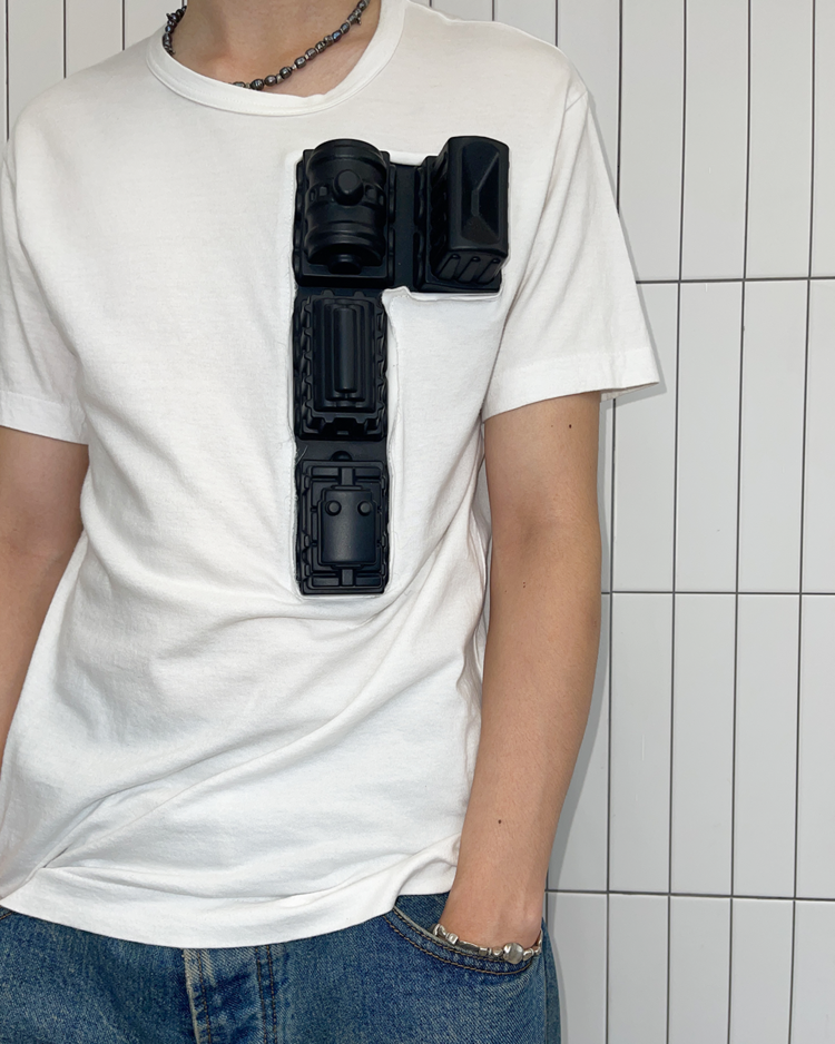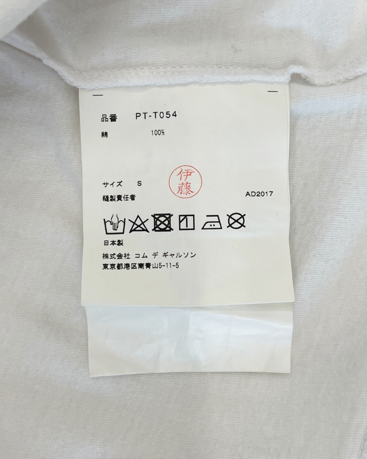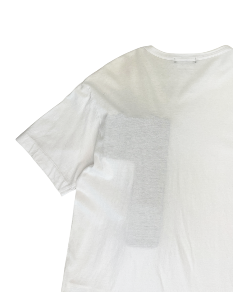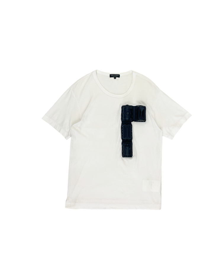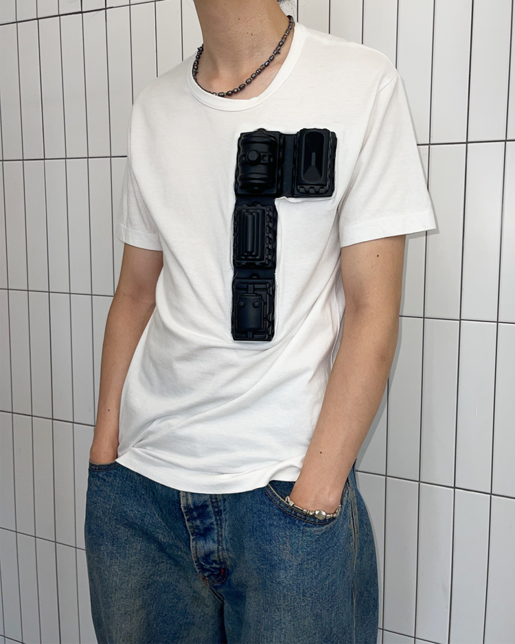 레이 가와쿠보가 전개하는 꼼데가르송의 남성 상위 라인 옴므 플러스의 제품입니다. 실리콘 재질의 열차 디테일이 있는 제품이 있는 티셔츠입니다. 후면부 어깨 부분에 미세한 사용감 존재합니다.