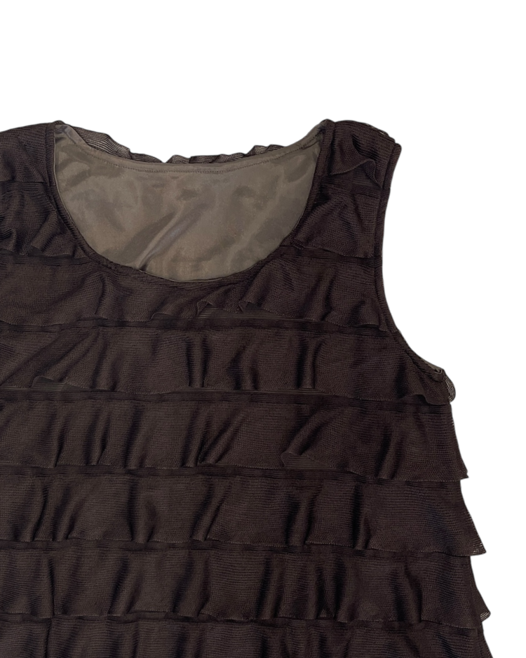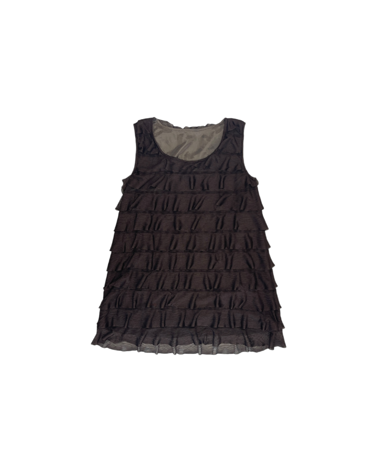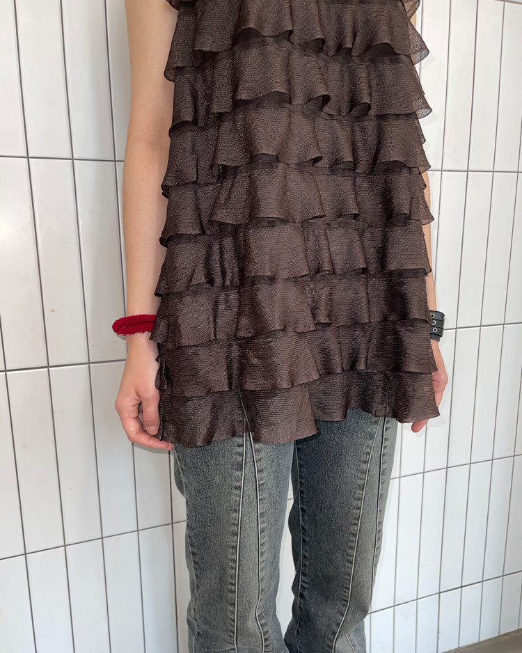 빈티지 프릴 슬리브리스 탑입니다. 은은한 광택감과 프릴 디테일이 매력적인 제품입니다.
