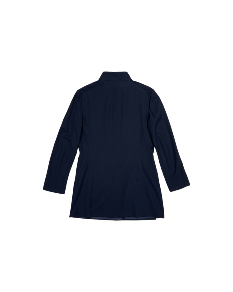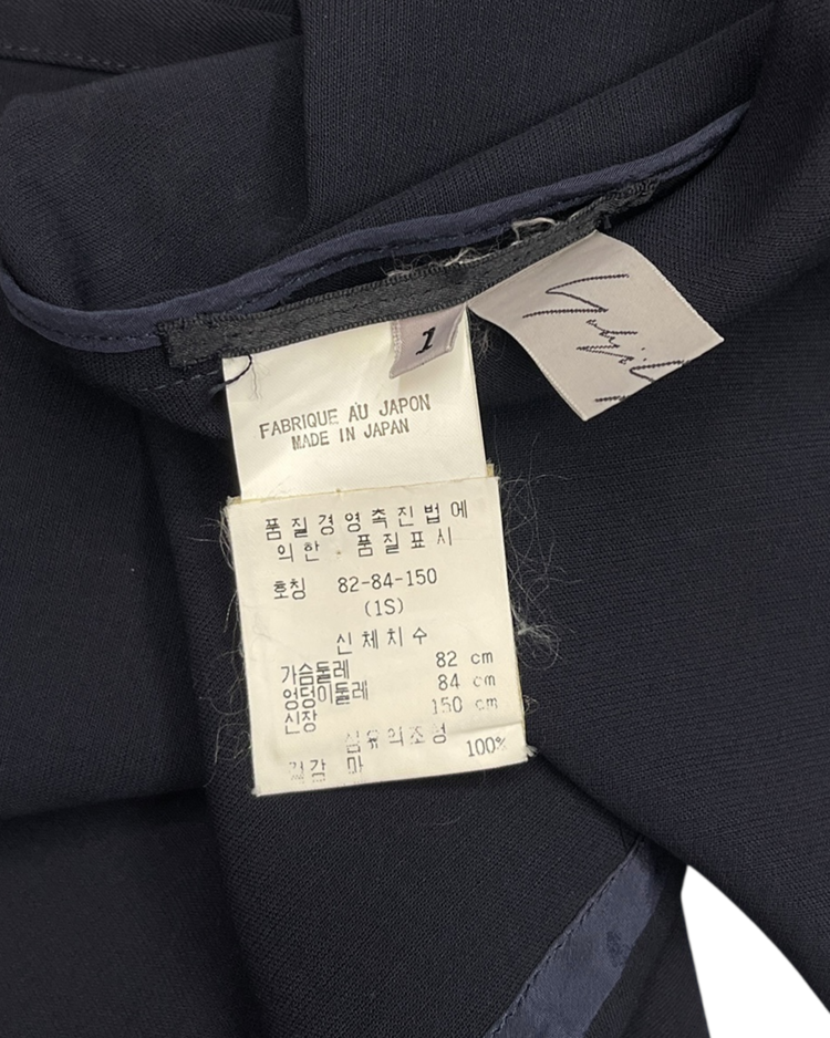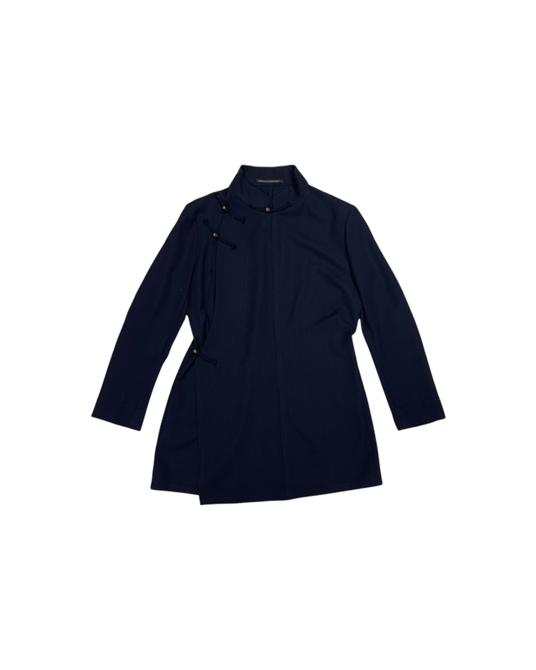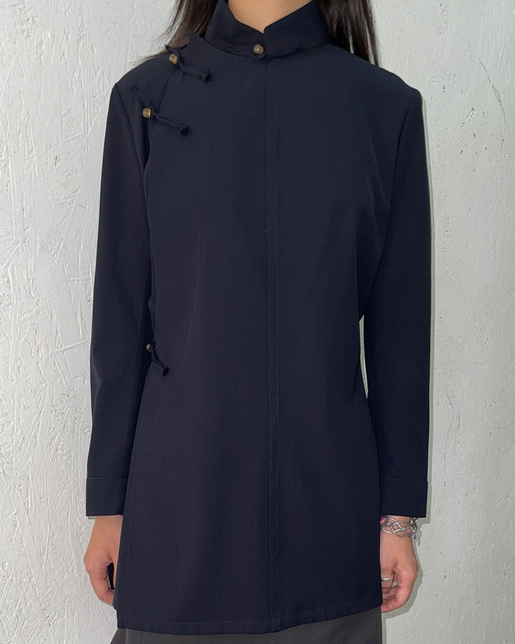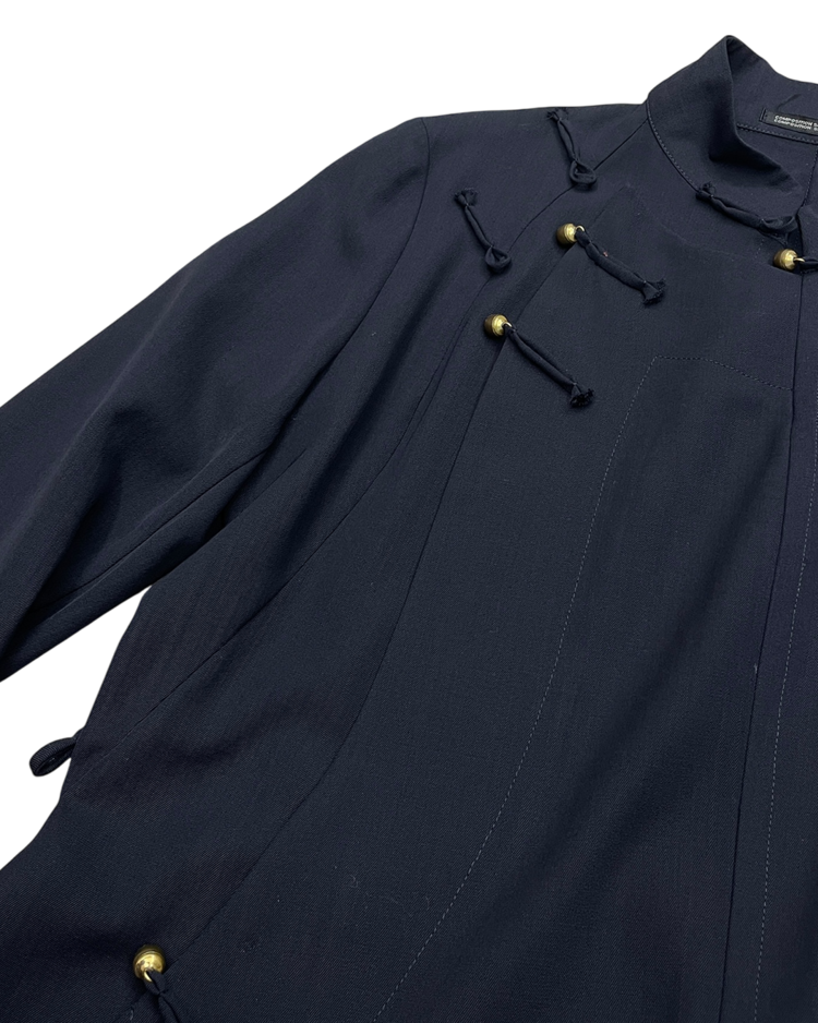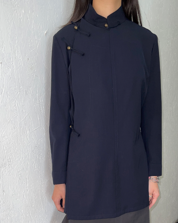 해체주의와 비대칭, 블랙의 미학으로 세계적인 반향을 일으킨 일본을 대표하는 디자이너 요지 야마모토의 아이템입니다. 중국 전통 의복에서 영감을 받은 2002 S/S 시즌 린넨 재킷으로, 곡선형 절개와 수공예 매듭 단추 디테일이 절제된 구조 속 동양적인 미를 담아냈습니다.
