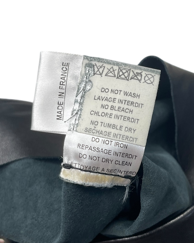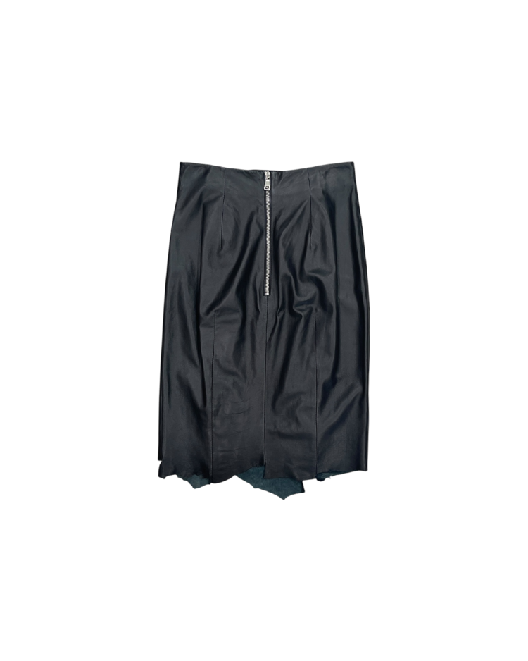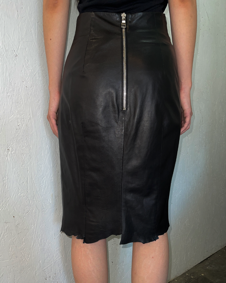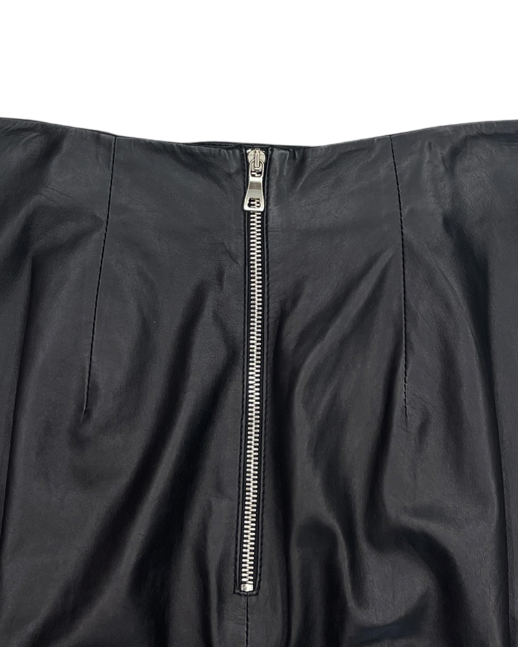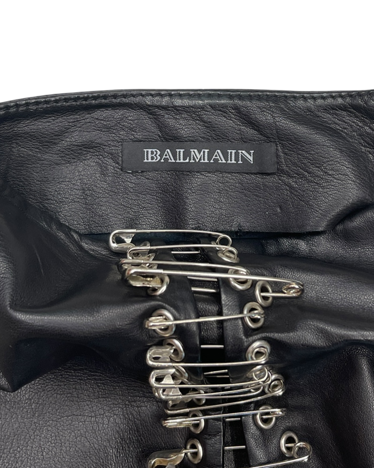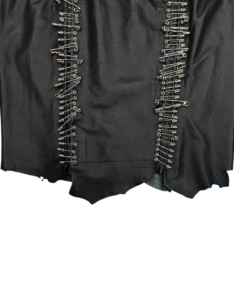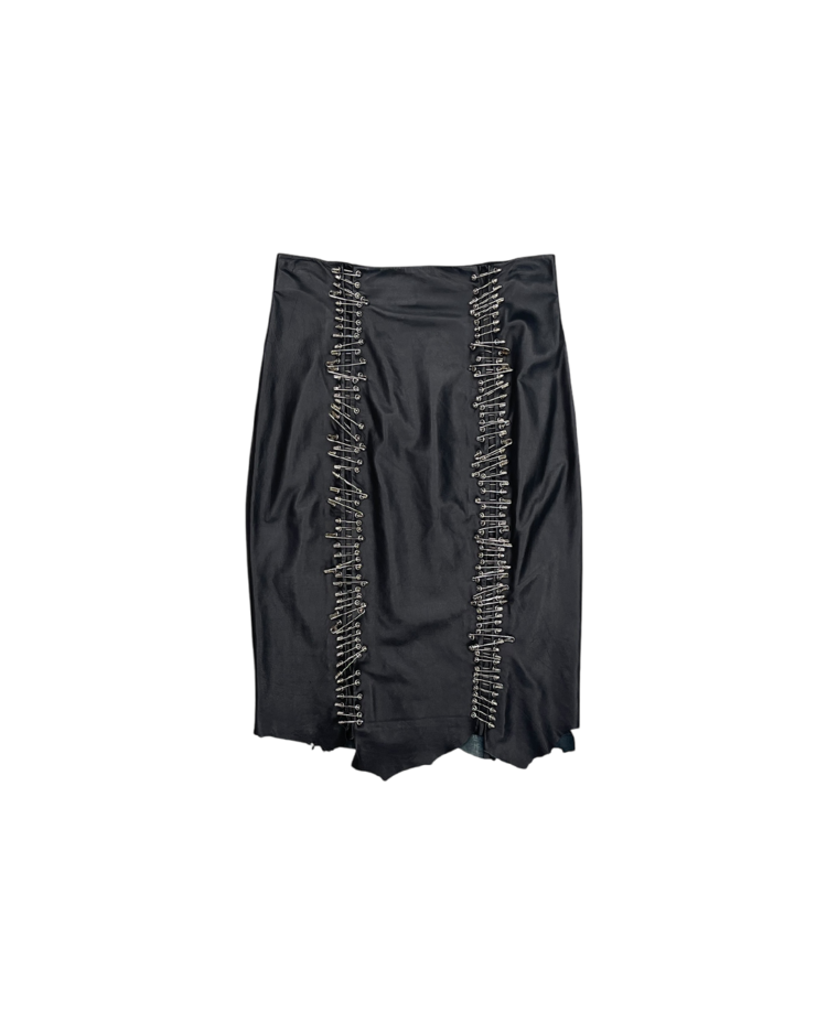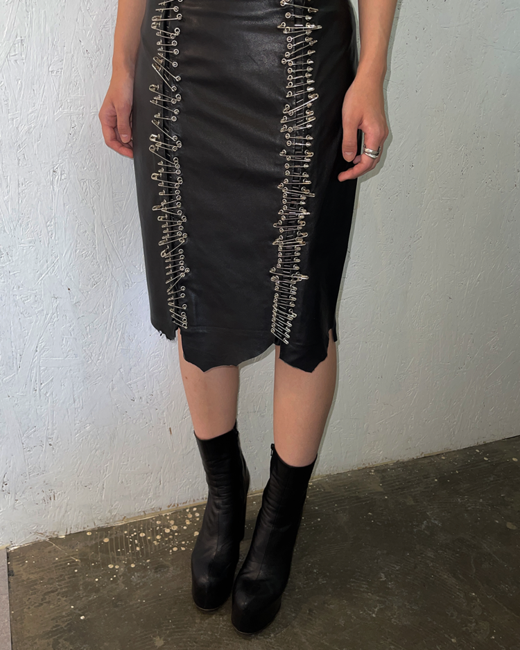 2010년대 초 올리비에 루스테잉의 디렉팅 아래 글래머러스하고 락 시크한 스타일로 재해석된 프랑스 하이엔드 패션 하우스 발망의 제품입니다. 레더 소재에 세이프티 핀 장식을 수직으로 배치해 강렬한 비주얼을 완성한 미디 스커트로 러프한 컷오프 헴 라인이 연출하는 실루엣, 타이트한 핏과 유니크한 장식이 결합된 구성이 매력적입니다.