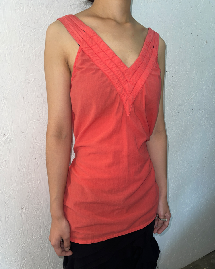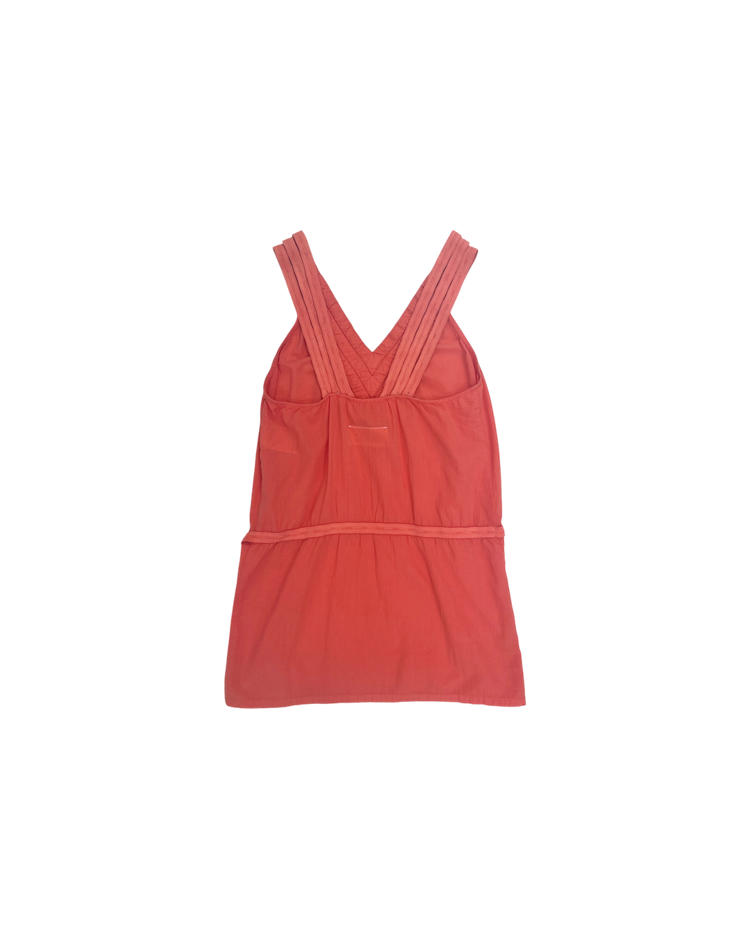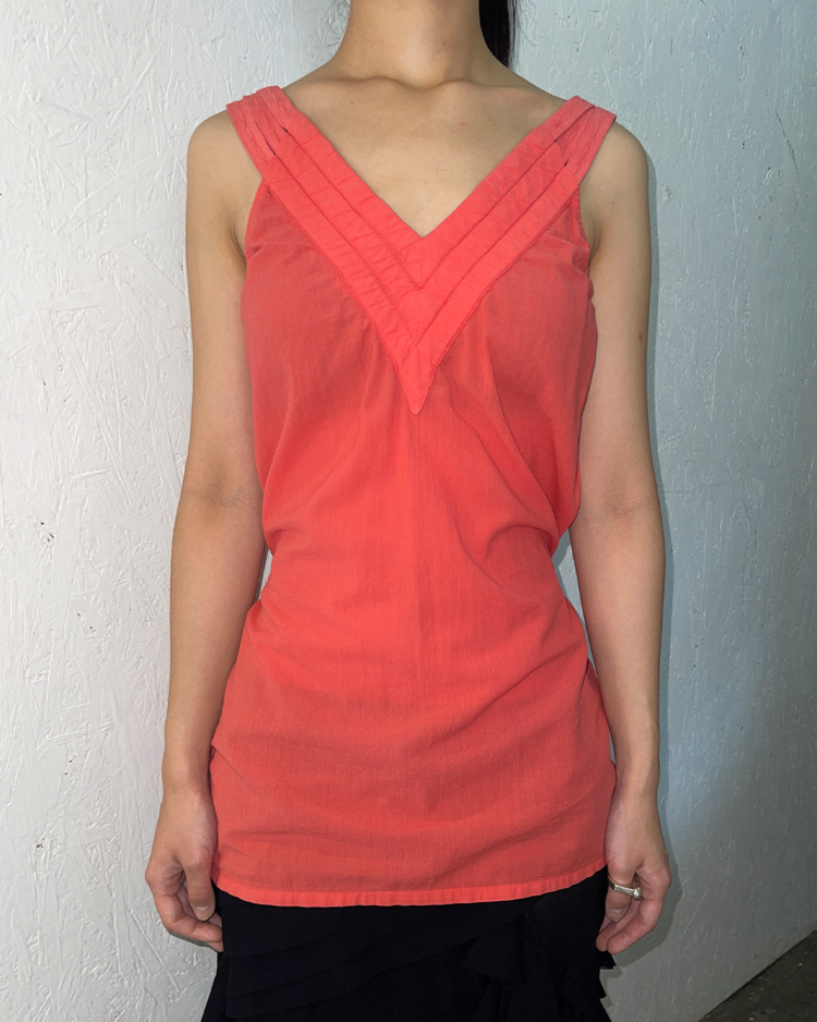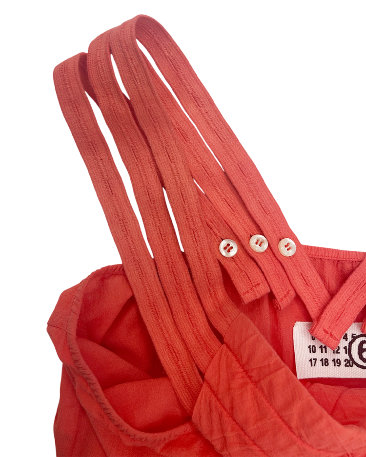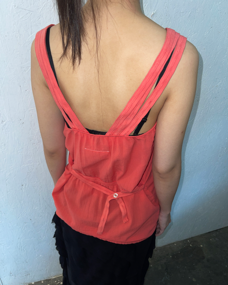 실험적인 디테일과 일상적인 착용감을 결합한 디자인을 선보이는 마르지엘라의 컨템포러리 여성복 6번 라인의 제품입니다. 트리플 스트랩 슬리브리스 블라우스로, 깊은 V넥과 세 줄 어깨끈, 버튼 디테일이 특징이며 뒷면 벨트로 실루엣 조절이 가능합니다.