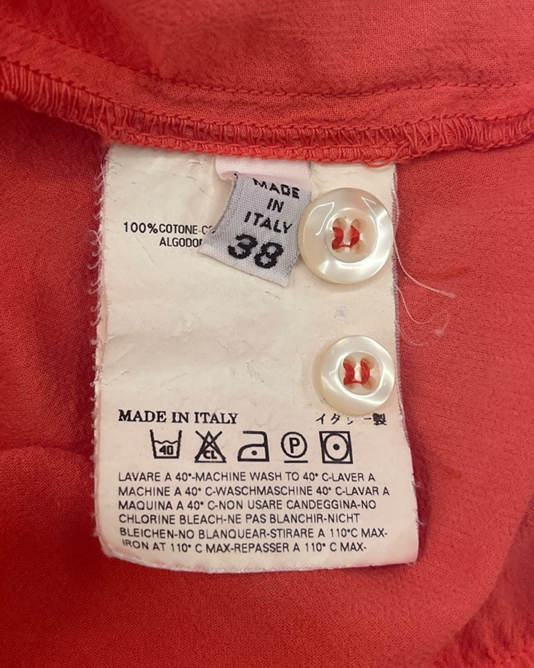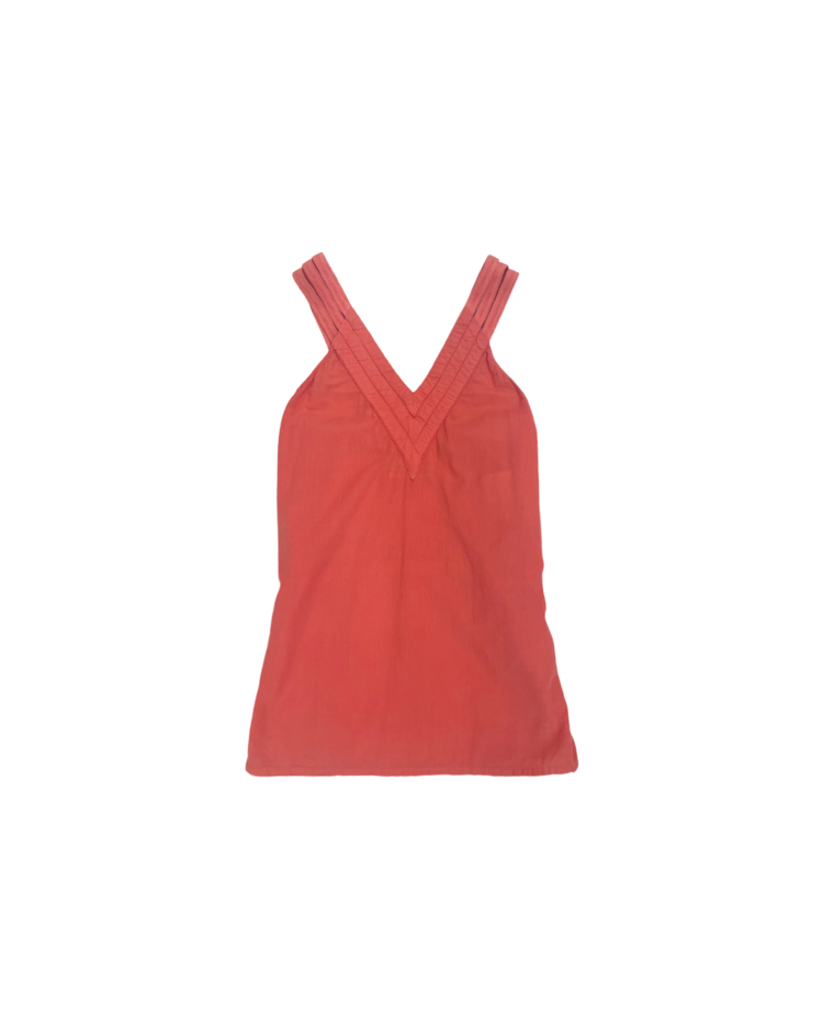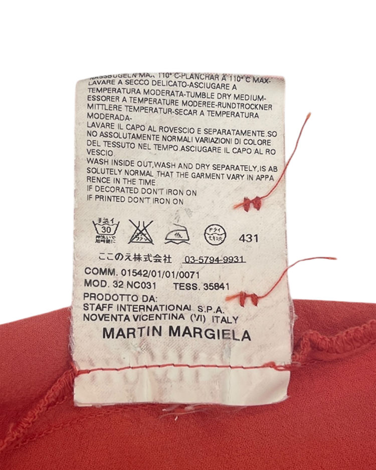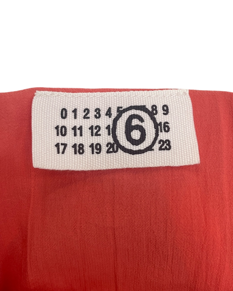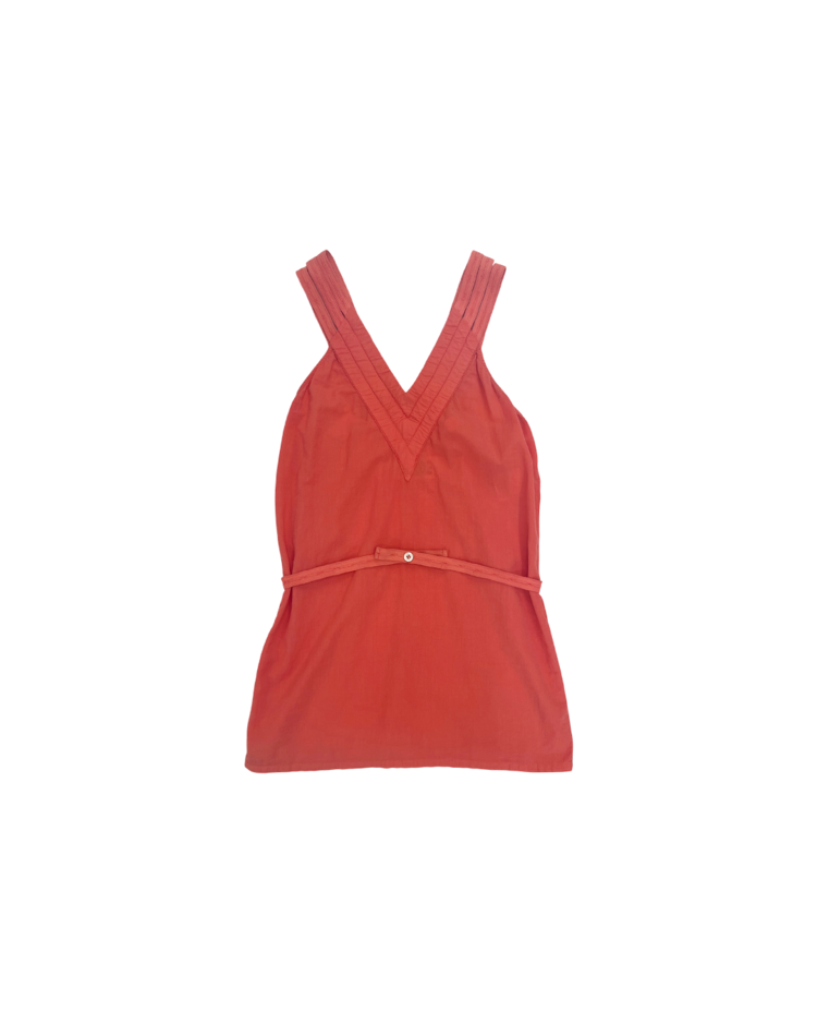 실험적인 디테일과 일상적인 착용감을 결합한 디자인을 선보이는 마르지엘라의 컨템포러리 여성복 6번 라인의 제품입니다. 트리플 스트랩 슬리브리스 블라우스로, 깊은 V넥과 세 줄 어깨끈, 버튼 디테일이 특징이며 뒷면 벨트로 실루엣 조절이 가능합니다.
