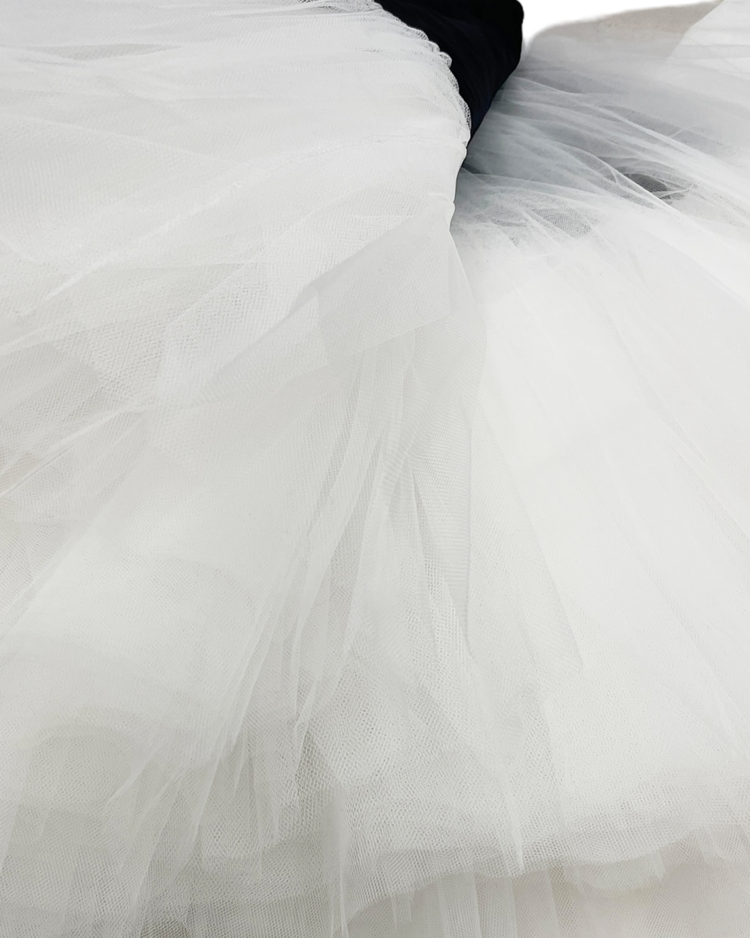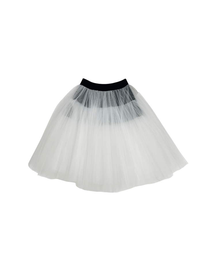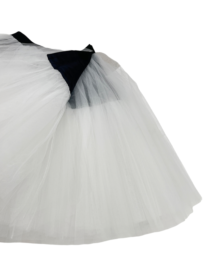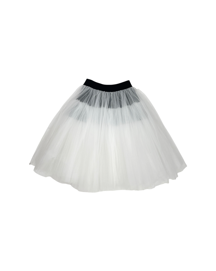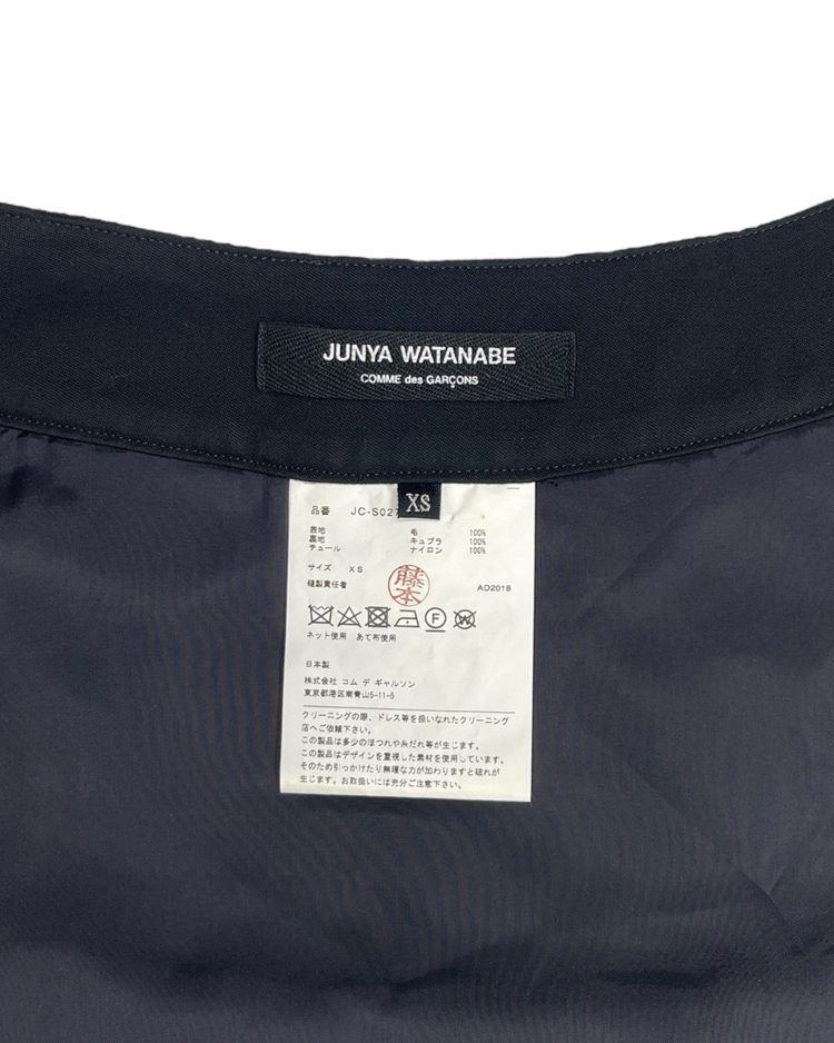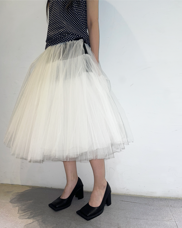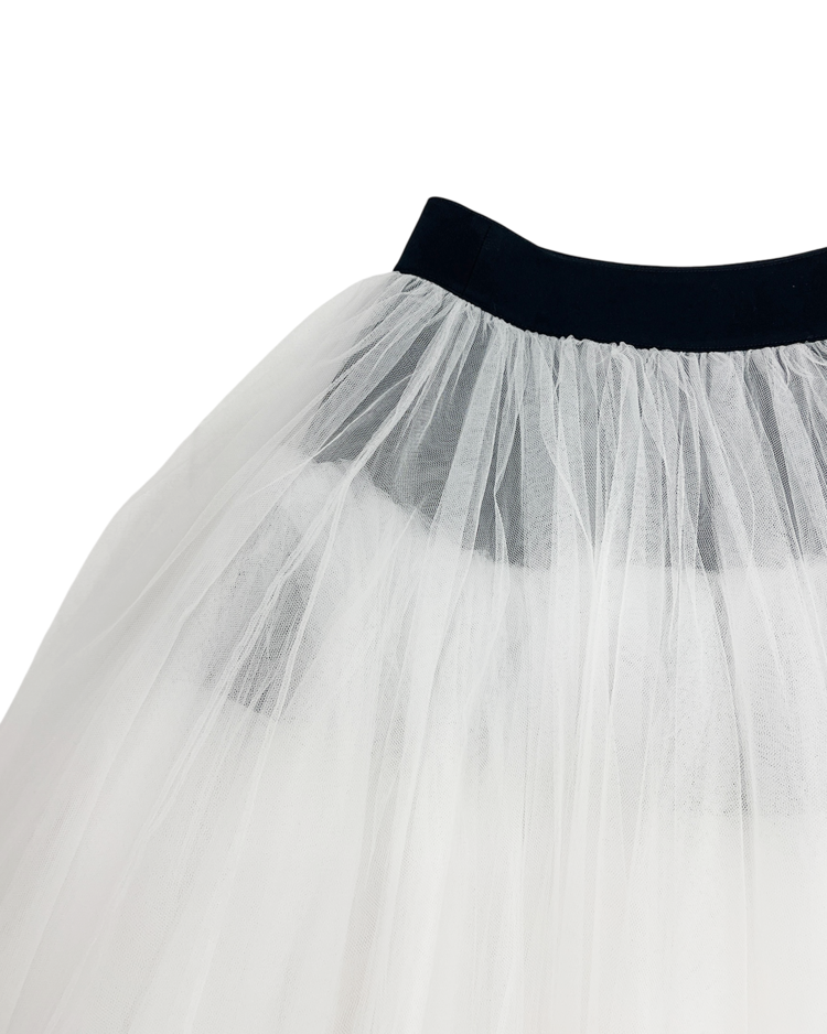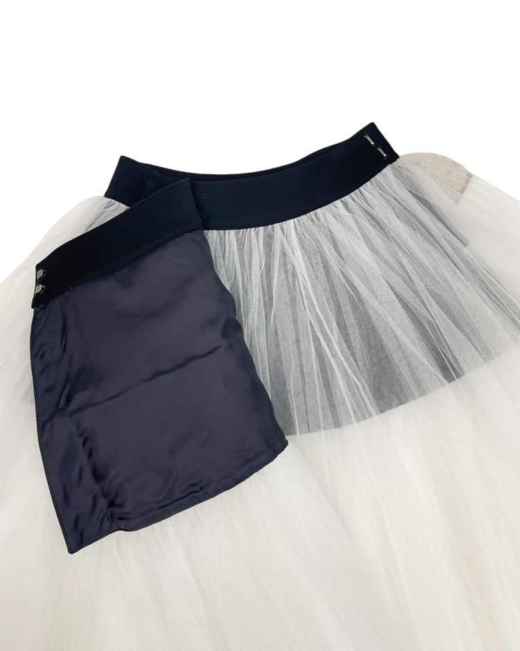 패션의 고전적 원형을 재구성하고 재해석하는 준야 와타나베의 19SS 시즌 스커트로 수집 가치가 높은 제품입니다. 턱시도 스타일의 허리 밴드와 다층 튤로 풍성한 볼륨감이 연출됩니다.