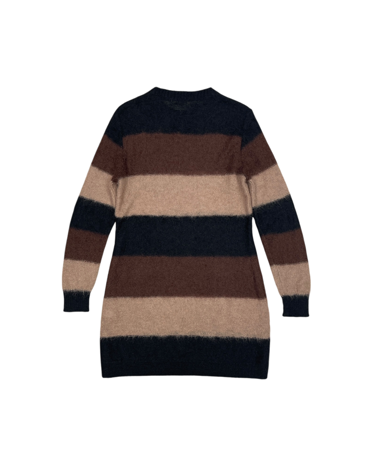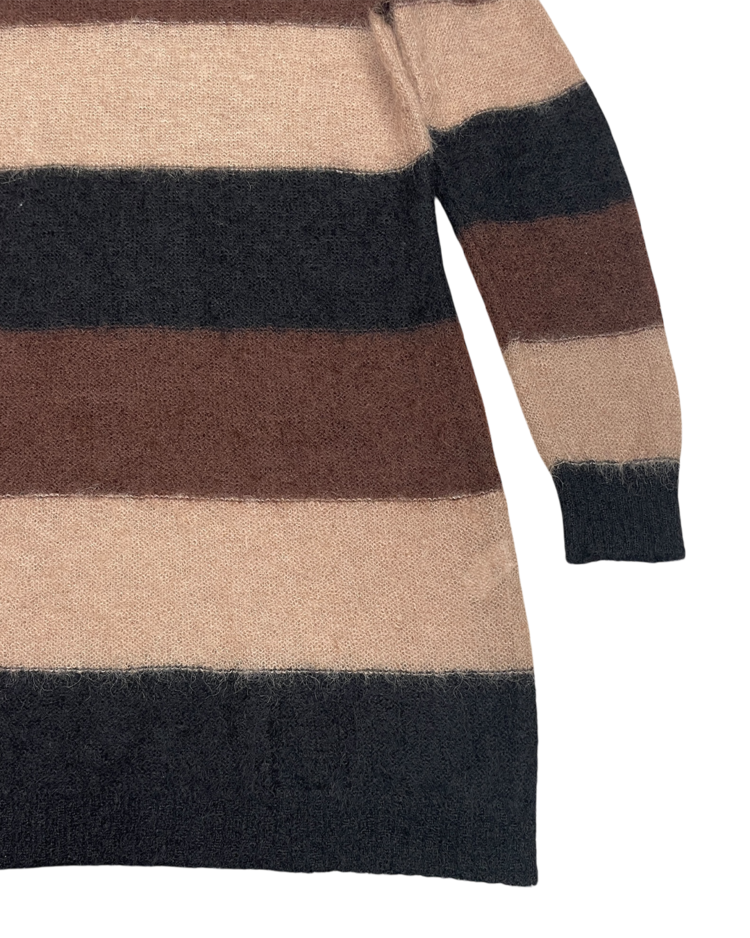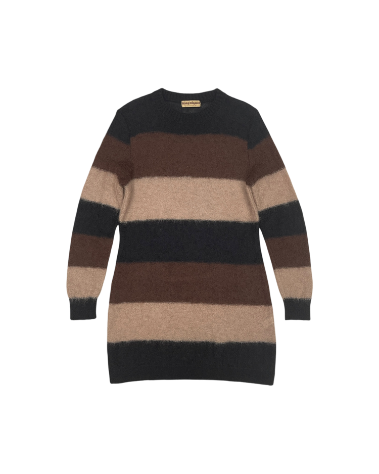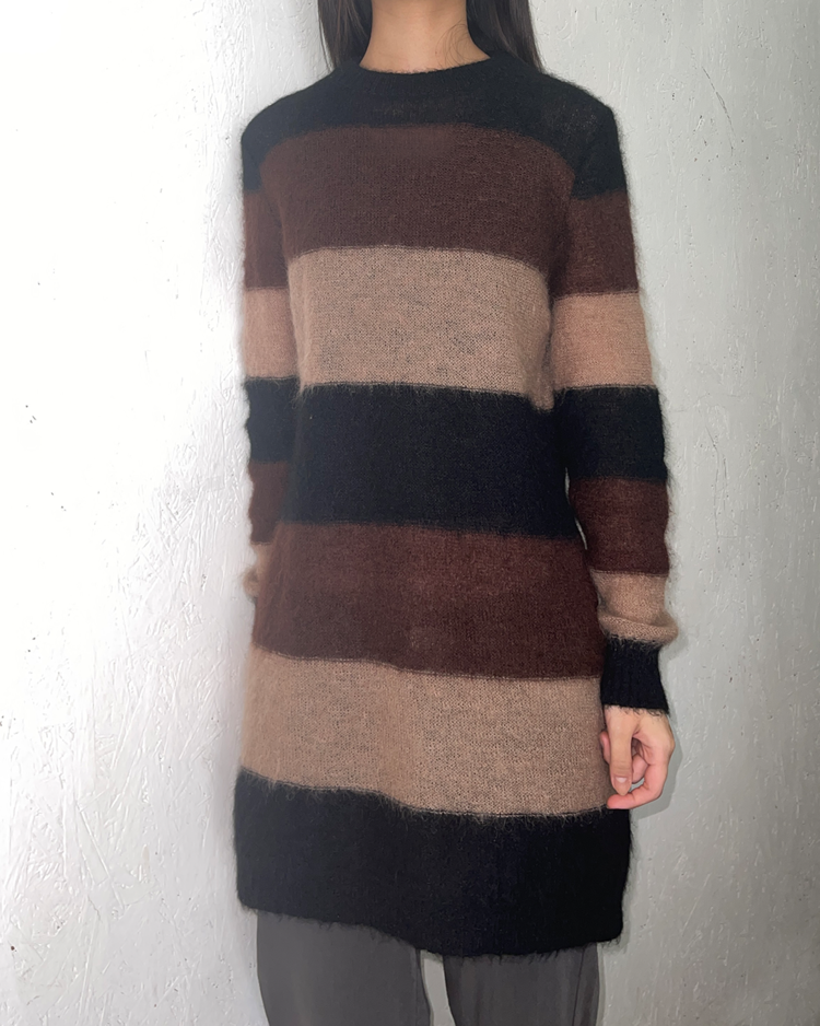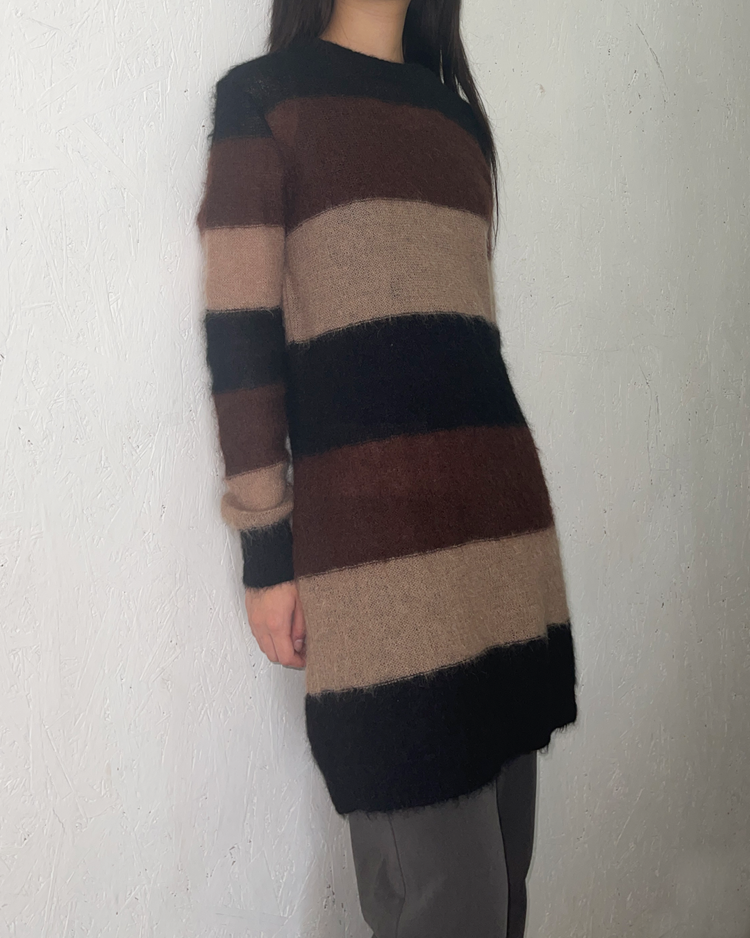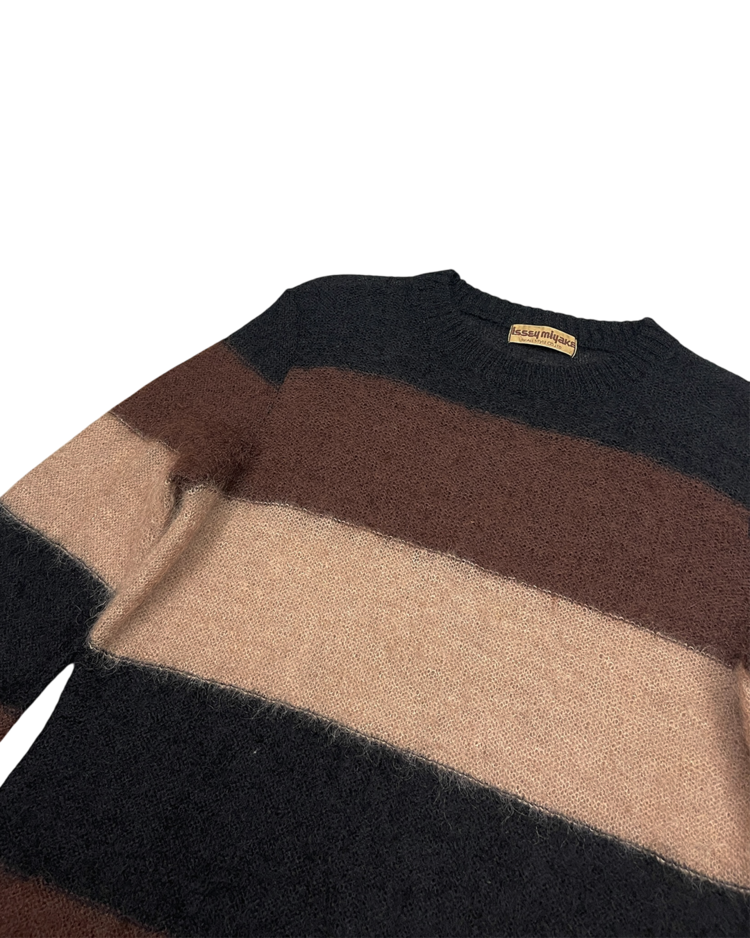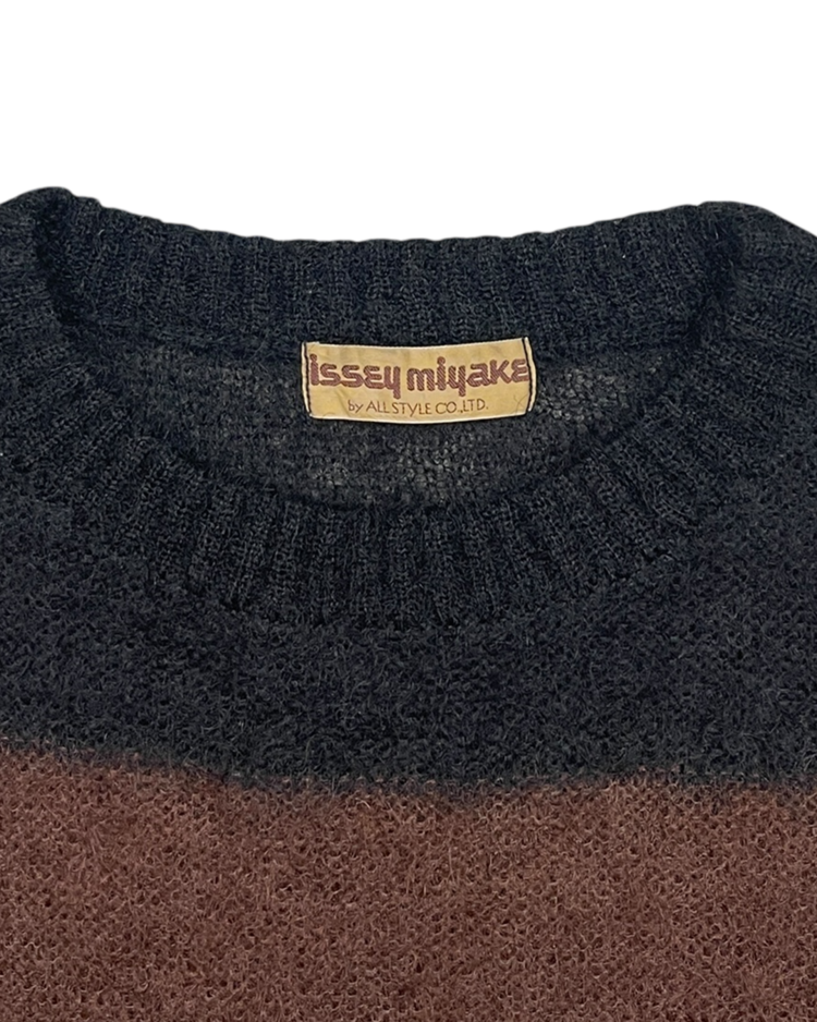 이세이 미야케의 1970년대 스트라이프 니트입니다. 루즈한 실루엣에 니트의 따뜻한 질감을 살렸으며, 원사 특유의 헤어리한 터치감이 매력적입니다. 크루넥 구조로 단정함을 연출하며, 올스타일 제작 시기의 아카이브 아이템입니다.