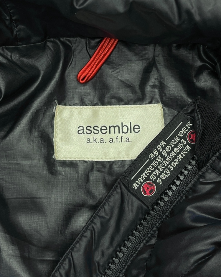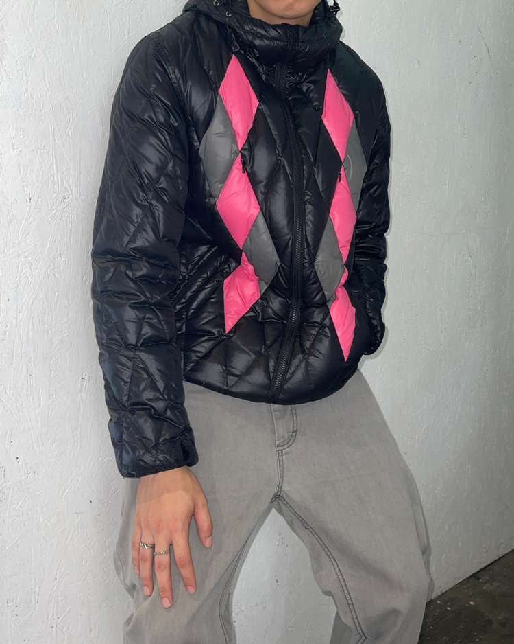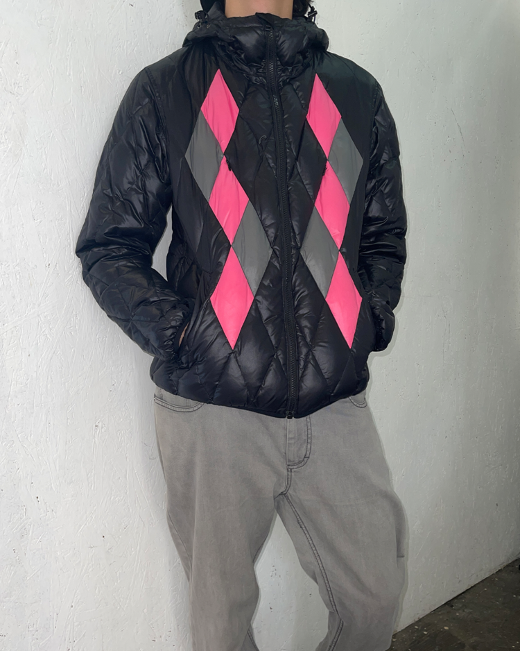 후지와라 히로시와 타카하시 준이 전개한 전설적 프로젝트 AFFA (Anarchy Forever Forever Anarchy) 의 연장선으로, 펑크와 아나키즘 정신을 계승한 아카이브 성격의 레이블 assemble a.k.a AFFA의 아이템입니다. 블랙 바탕의 다이아몬드 퀼팅 위에 핑크와 그레이 아가일 패턴을 배치한 11AW 다운 재킷으로, 스트리트적 위트와 실험적 감각을 동시에 담아낸 피스입니다.