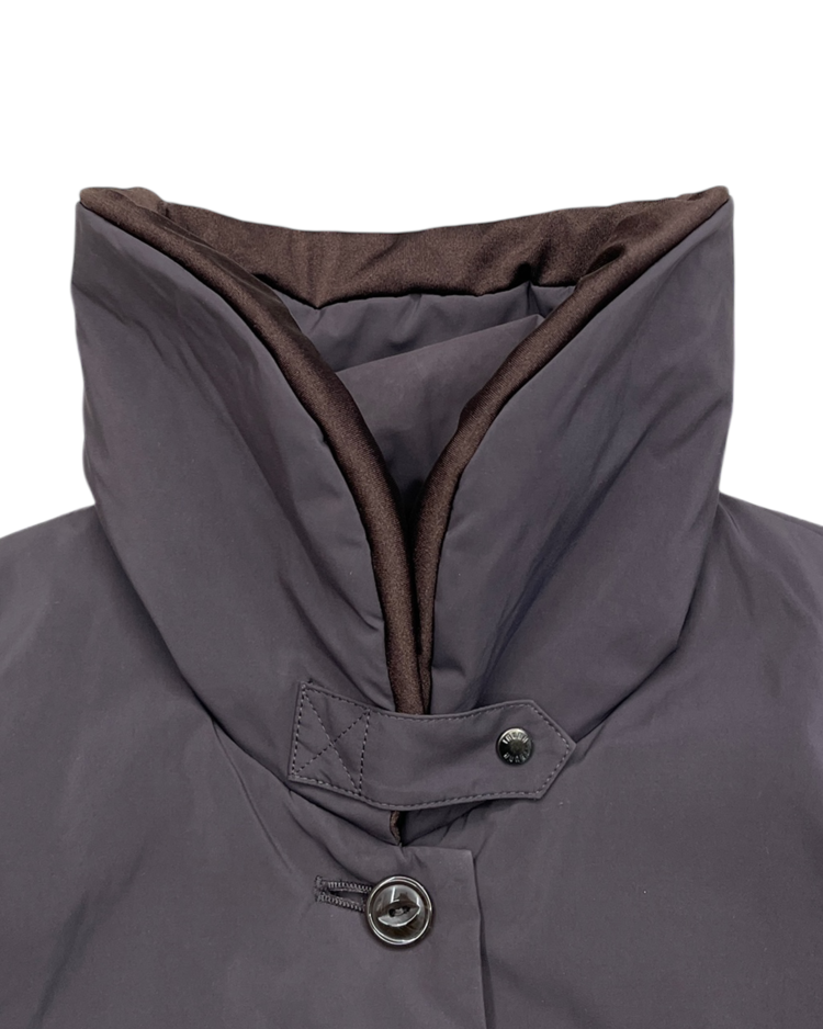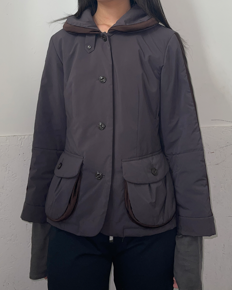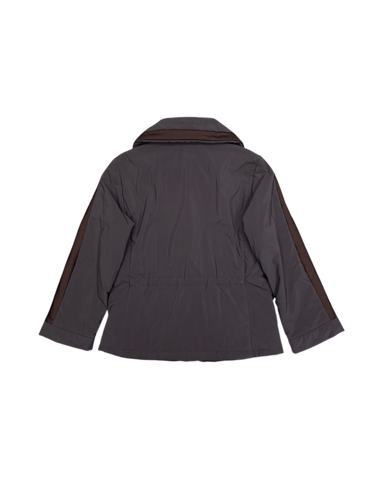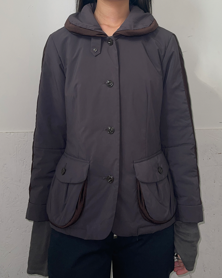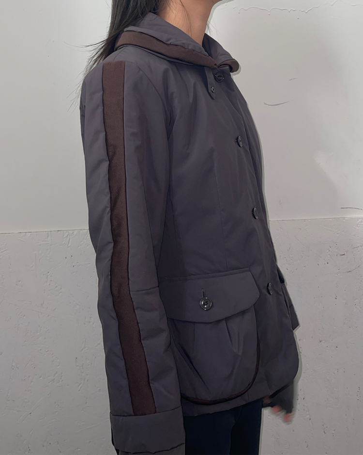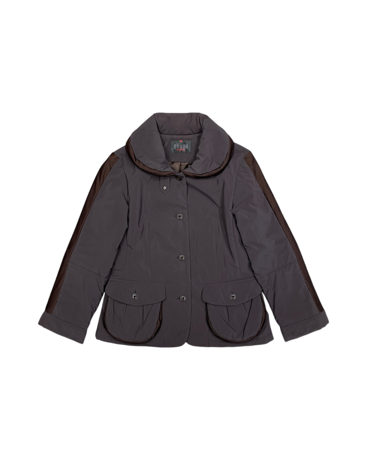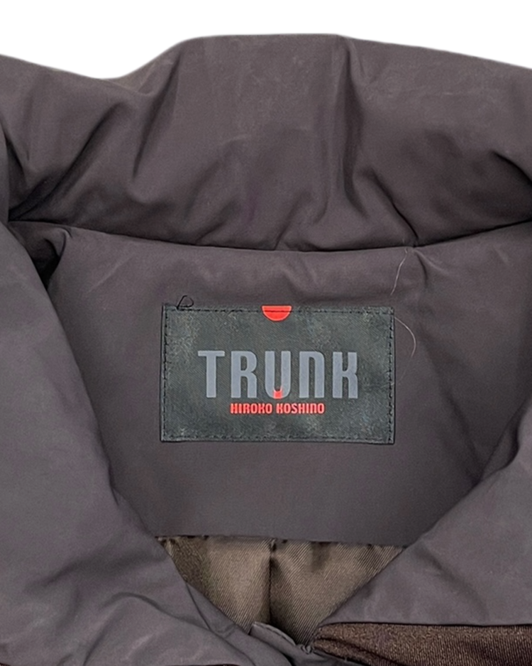 여성 기성복에 큰 영향을 주었던 브랜드 히로코 코시노의 세컨드 라인 트렁크 바이 히로코 코시노 제품입니다. 라운드 칼라와 버튼 여밈으로 단정한 무드를 연출하며, 소매 라인과 포켓 플랩에 배색 파이핑 디테일이 매력적입니다.
