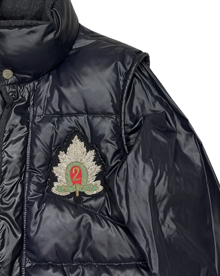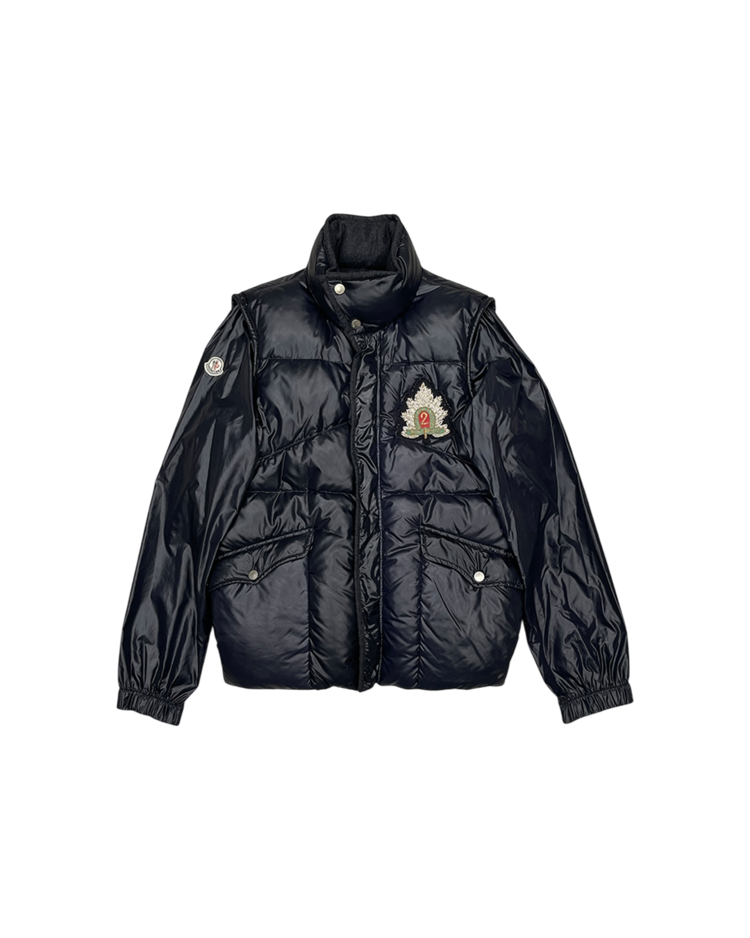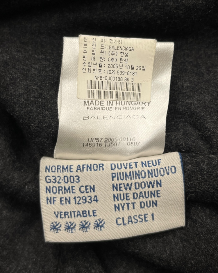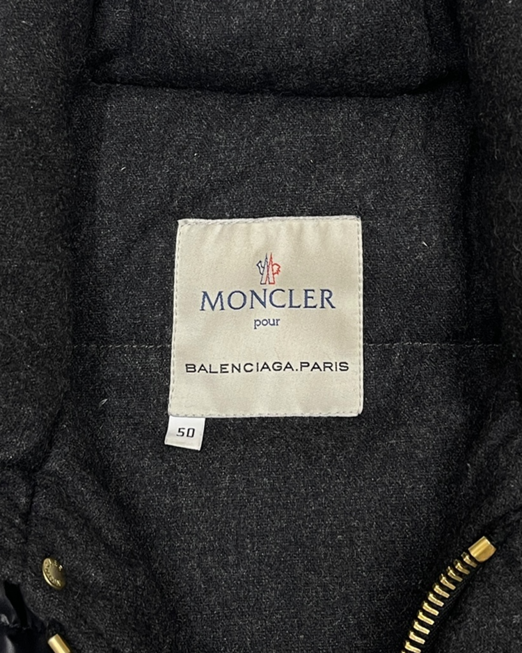 몽클레어와 니콜라스 제스키에르 시기 발렌시아가의 2005년 가을/겨울 협업 컬렉션에서 선보인 제품입니다. 광택감 있는 블랙 나일론 셸과 풍성한 다운이 조화를 이루며, 소매를 분리해 베스트 형태로도 착용할 수 있는 구조적 디자인이 특징입니다. 전면의 자수 엠블럼과 금장 로고 지퍼, 울 라이닝 디테일은 당시 제스키에르 특유의 실험적인 테일러링을 보여줍니다. 전면 지퍼 슬라이더 결함이 존재합니다.
