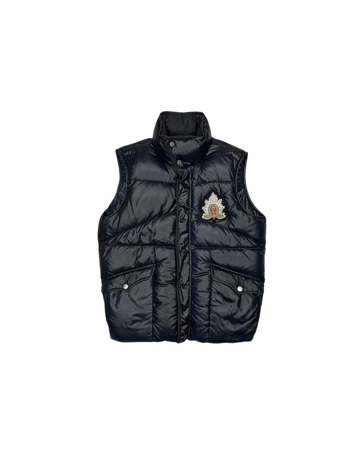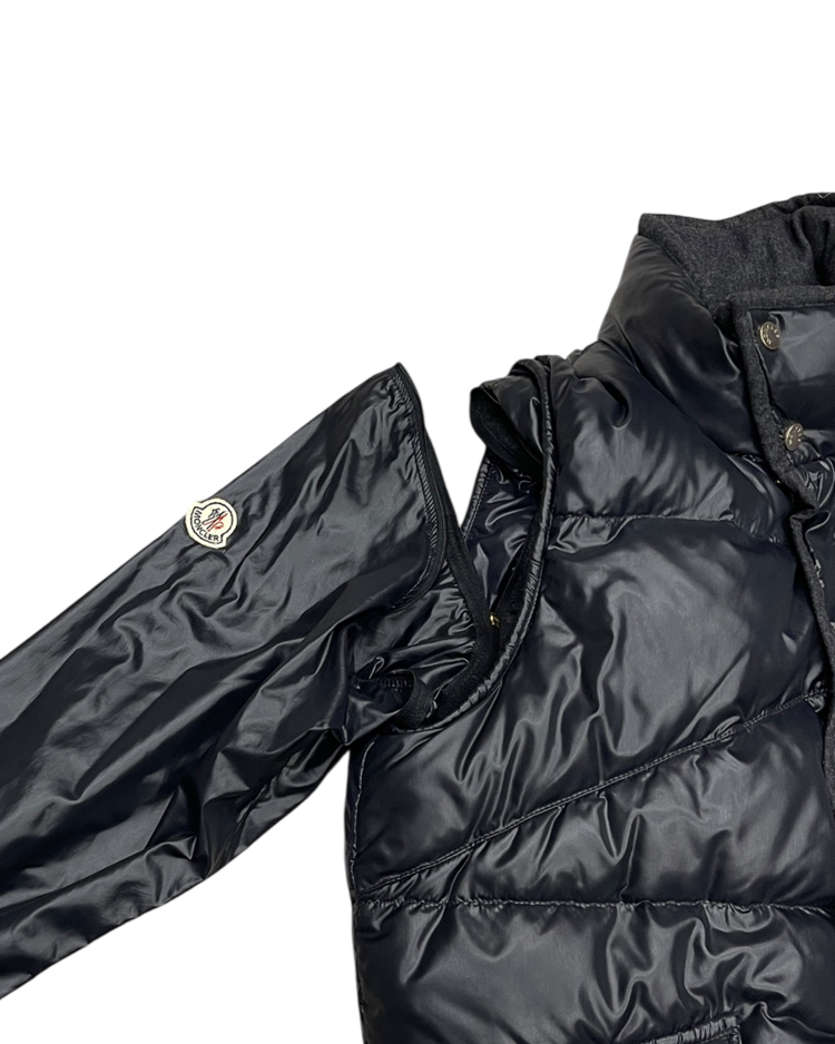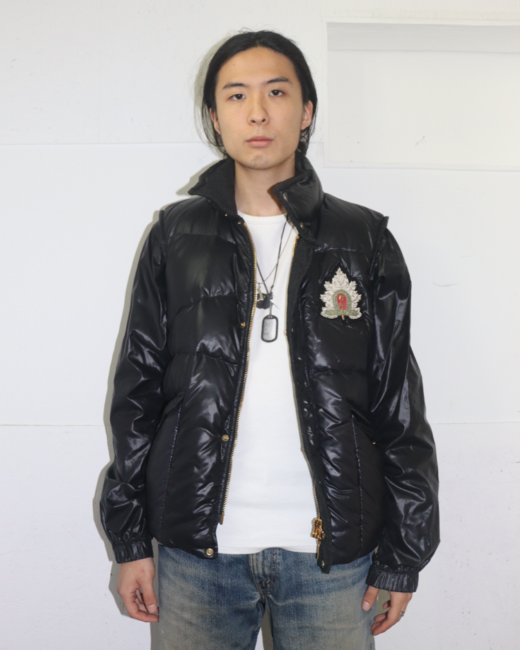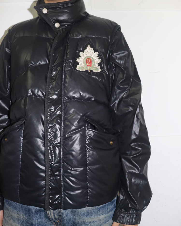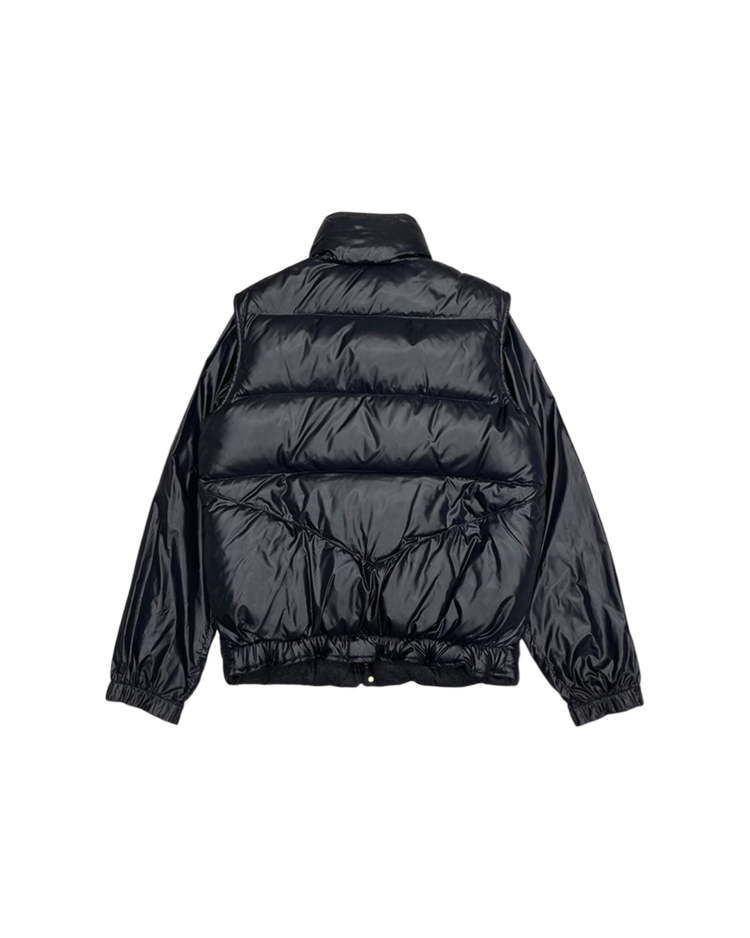 몽클레어와 니콜라스 제스키에르 시기 발렌시아가의 2005년 가을/겨울 협업 컬렉션에서 선보인 제품입니다. 광택감 있는 블랙 나일론 셸과 풍성한 다운이 조화를 이루며, 소매를 분리해 베스트 형태로도 착용할 수 있는 구조적 디자인이 특징입니다. 전면의 자수 엠블럼과 금장 로고 지퍼, 울 라이닝 디테일은 당시 제스키에르 특유의 실험적인 테일러링을 보여줍니다. 전면 지퍼 슬라이더 결함이 존재합니다.