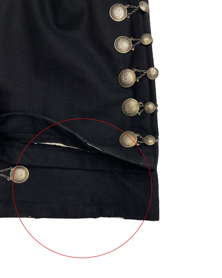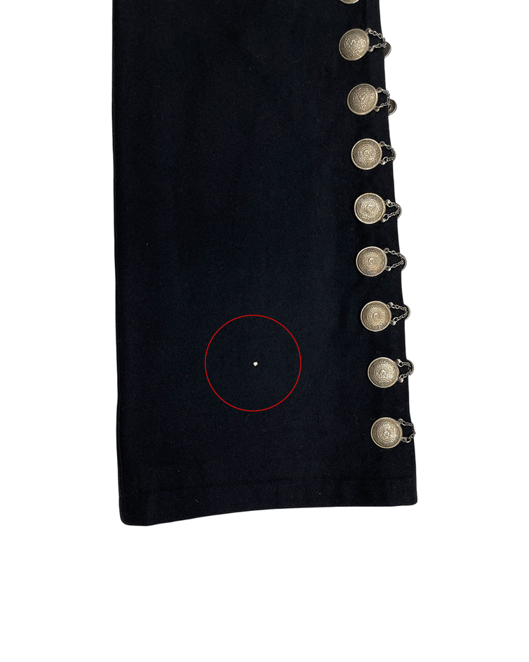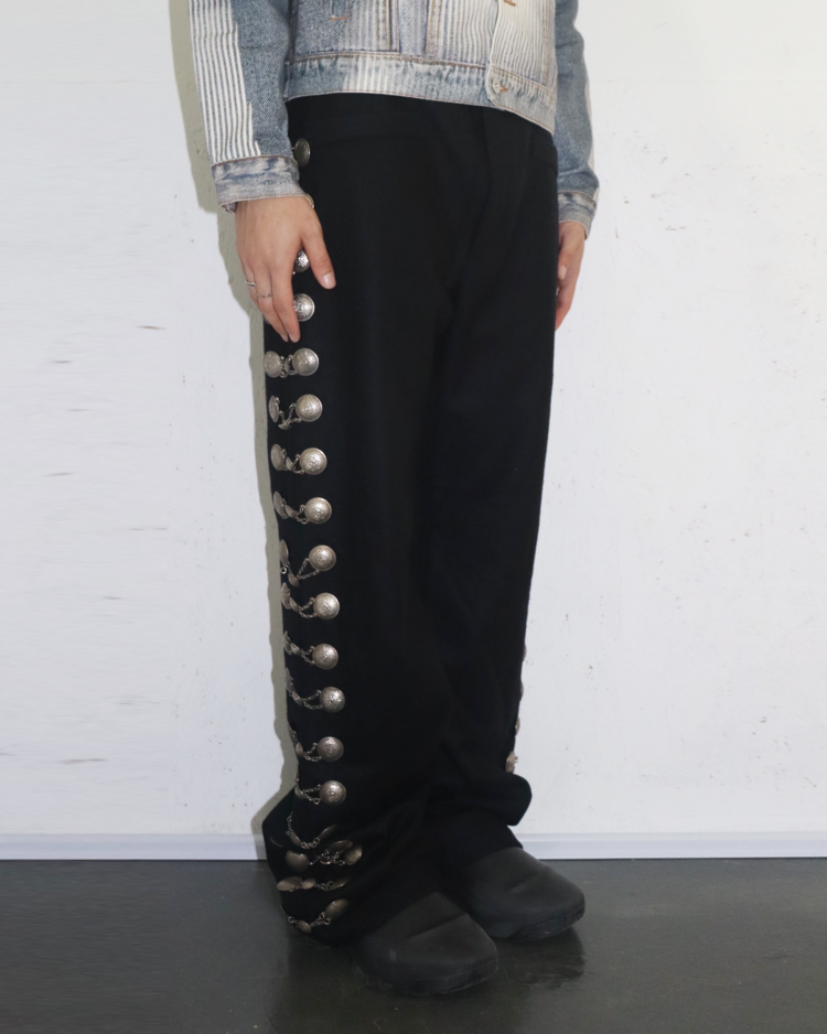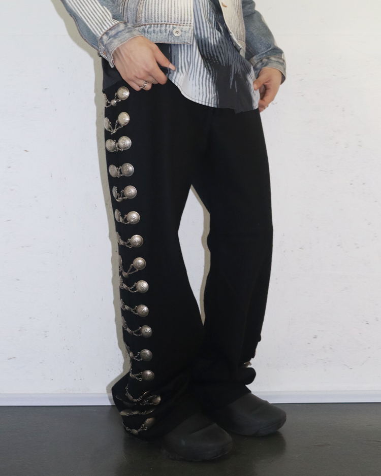 사이드라인을 따라 연결된 체인 디테일에 멕시칸 마야 코인 모티프의 장식이 더해진 아이템입니다. 체인이 움직일 때마다 은은한 빛을 반사해 강렬하면서도 예술적인 분위기를 연출합니다. 전통적 요소와 현대적인 테일러링이 결합된 디자인으로, 스타일링에 포인트를 더해줍니다. 밑단 부근에 사용감 존재합니다.