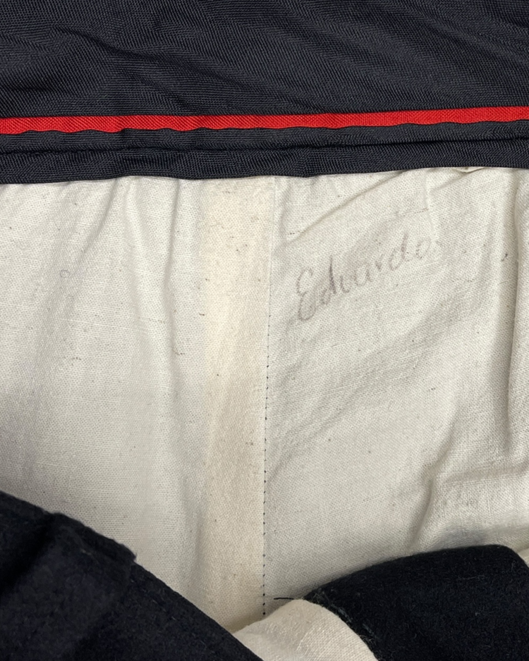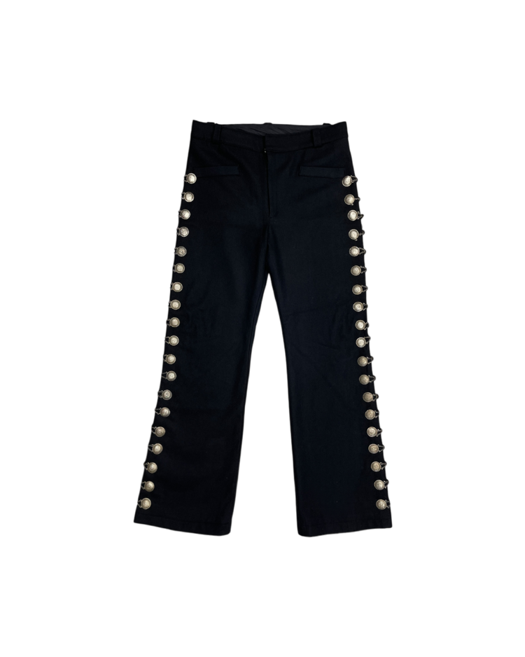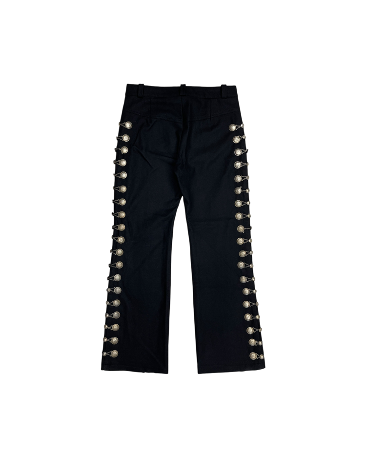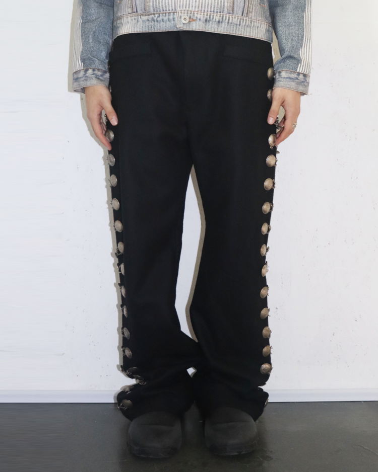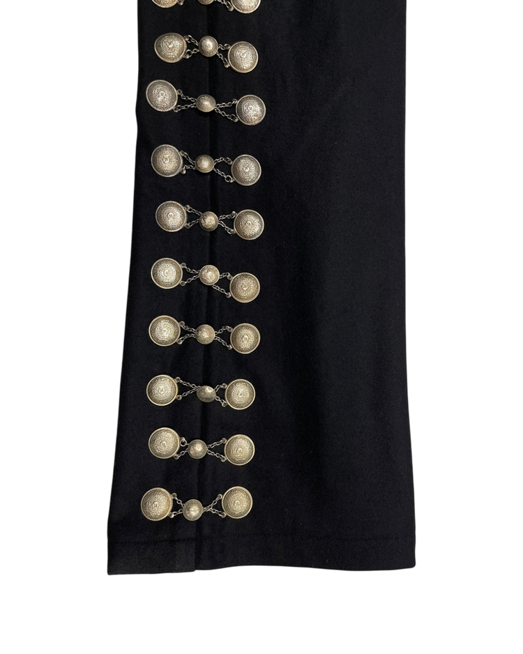 사이드라인을 따라 연결된 체인 디테일에 멕시칸 마야 코인 모티프의 장식이 더해진 아이템입니다. 체인이 움직일 때마다 은은한 빛을 반사해 강렬하면서도 예술적인 분위기를 연출합니다. 전통적 요소와 현대적인 테일러링이 결합된 디자인으로, 스타일링에 포인트를 더해줍니다. 밑단 부근에 사용감 존재합니다.