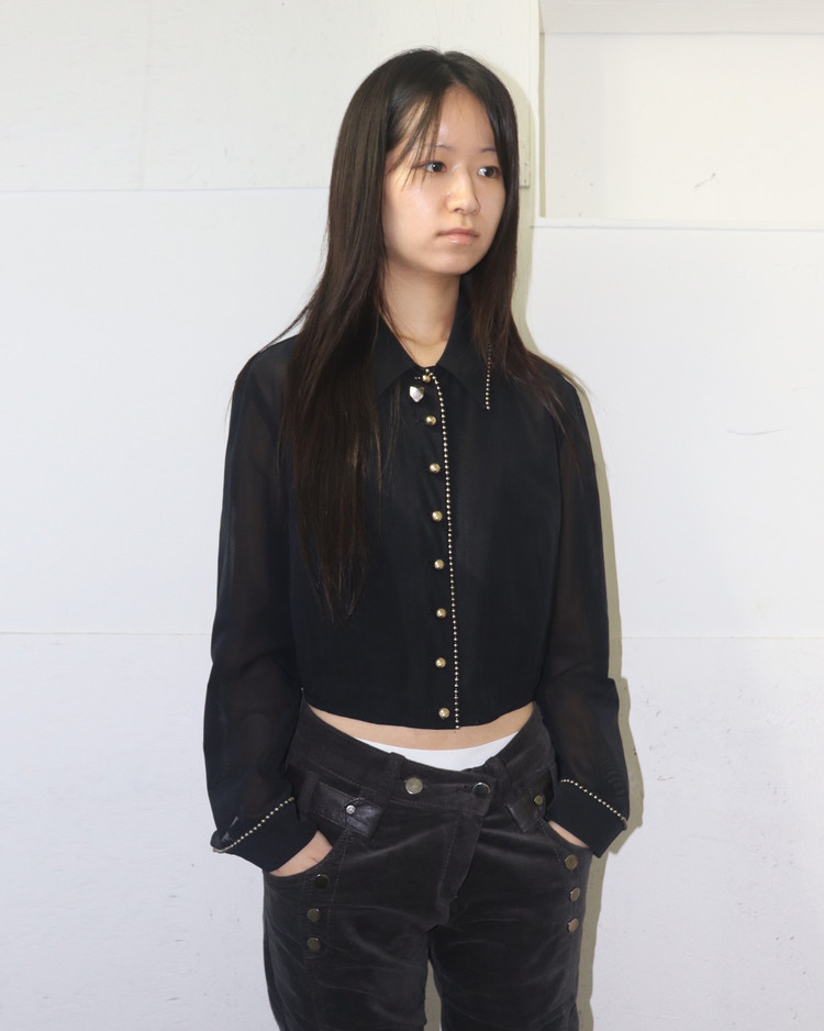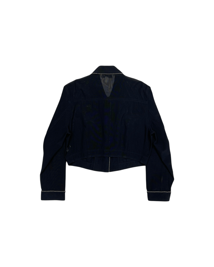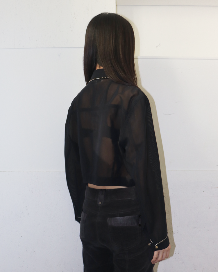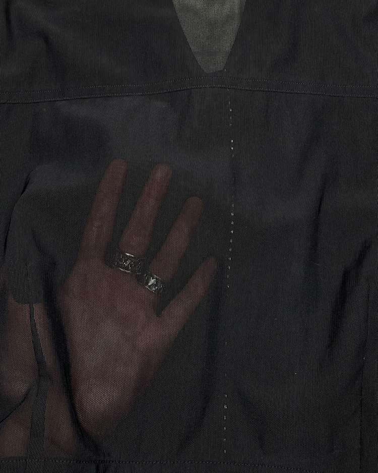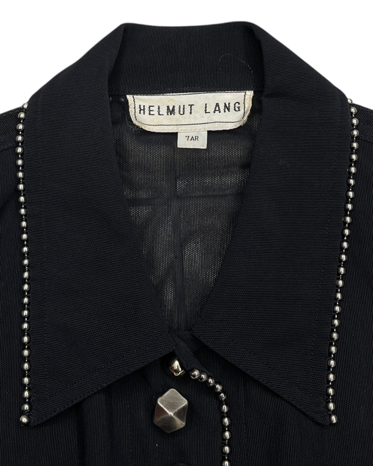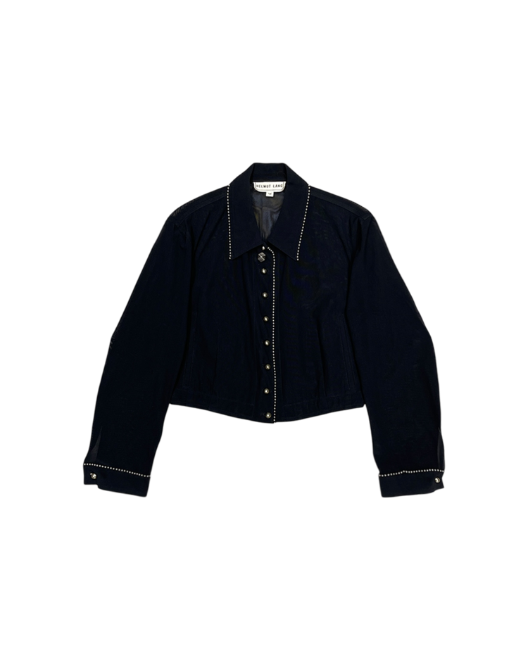 1990년대 초기에 제작된 시스루 재킷으로, 당시 브랜드 특유의 미니멀리즘과 인더스트리얼 감성을 모두 담은 아카이브 피스입니다. 전면 버튼 라인과 카라, 커프스에 더해진 스터드 장식이 절제미를 드러냅니다. 구조적 재단과 크롭 기장이 헬무트 랭의 초기 실험적 디자인을 잘 보여줍니다.