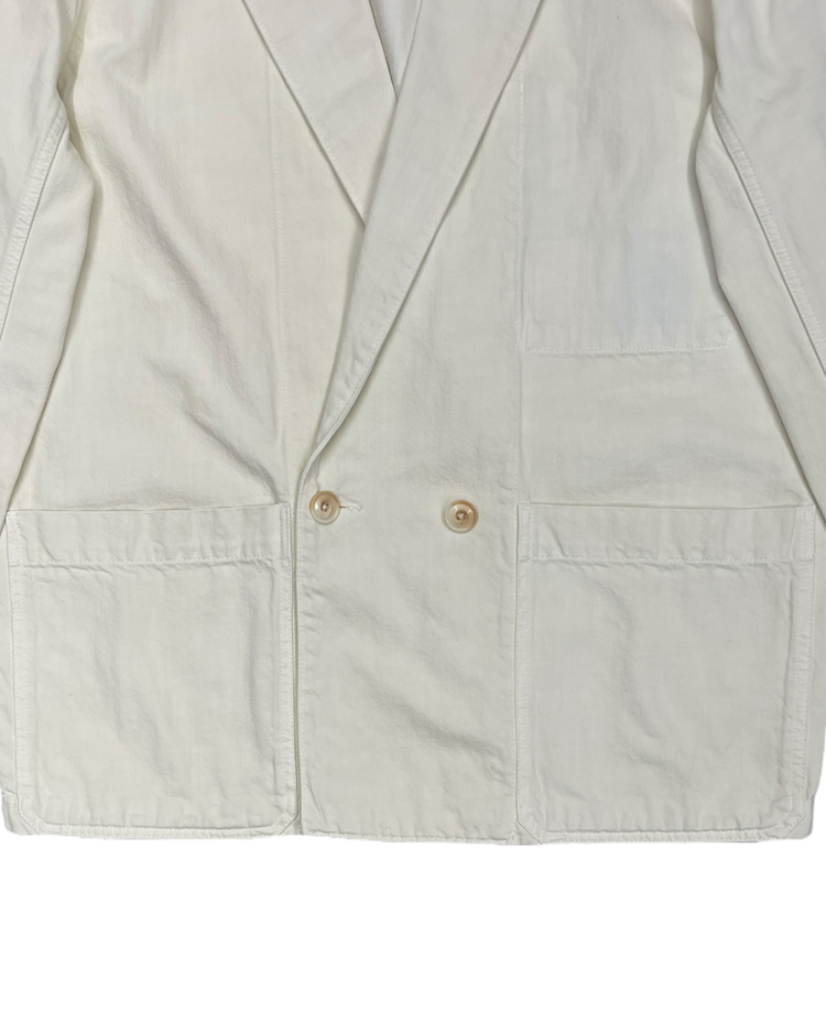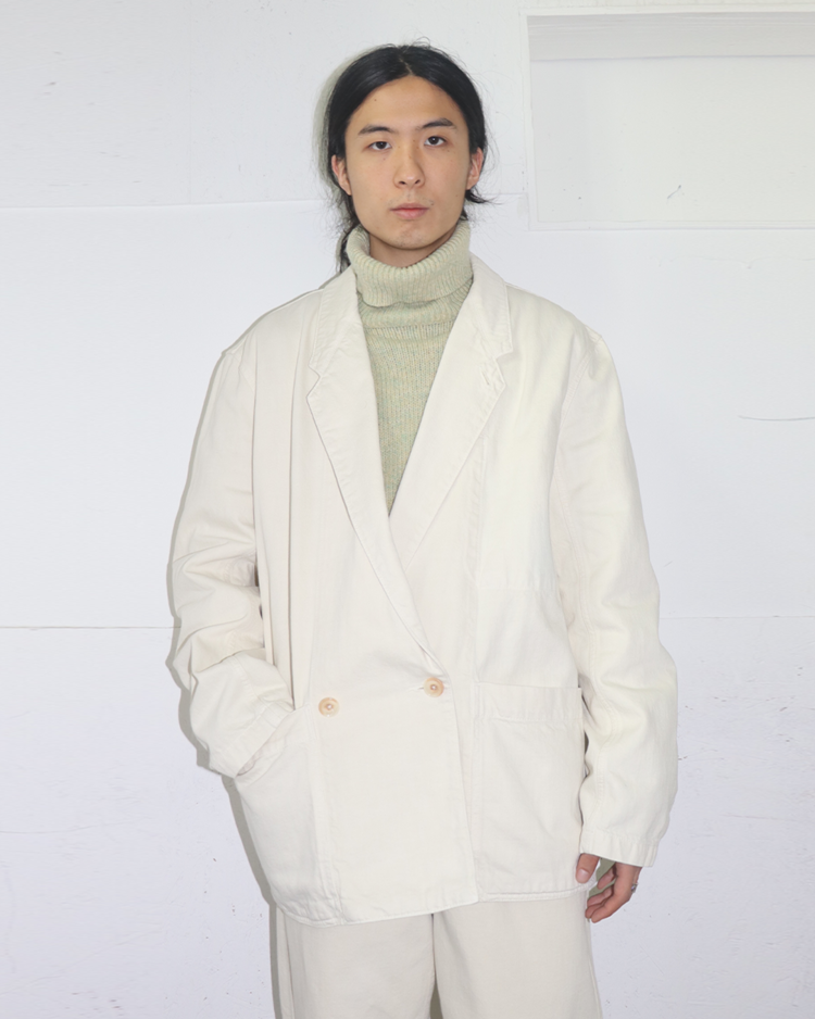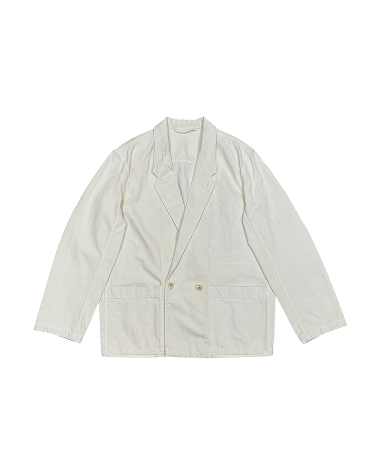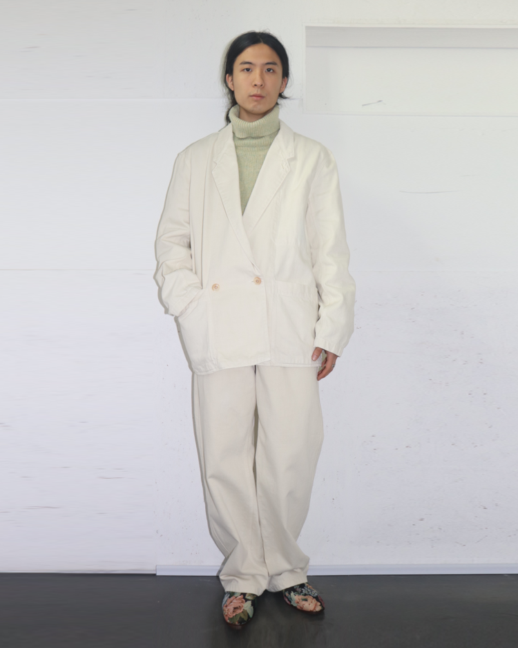 시간의 흐름에 구애받지 않는 실용성과 절제된 우아함을 추구하는 프랑스 브랜드 르메르의 제품입니다. 내추럴 톤의 코튼 원단으로 제작된 셋업으로, 여유로운 더블 재킷과 스트레이트 팬츠가 편안한 균형미를 완성합니다.