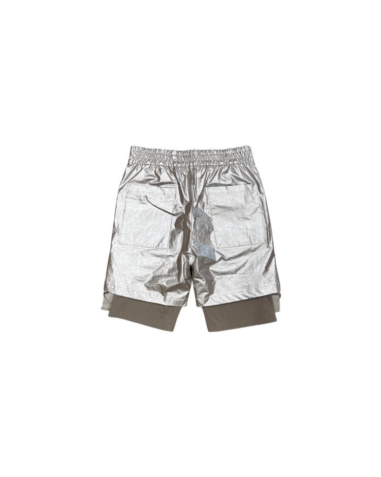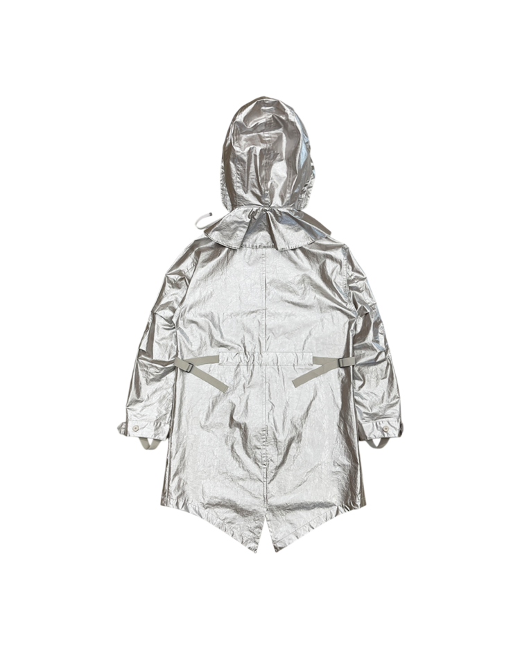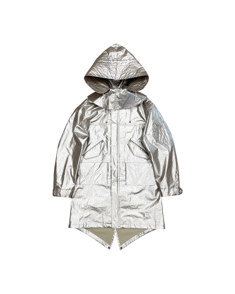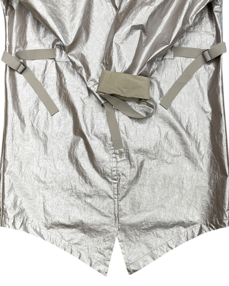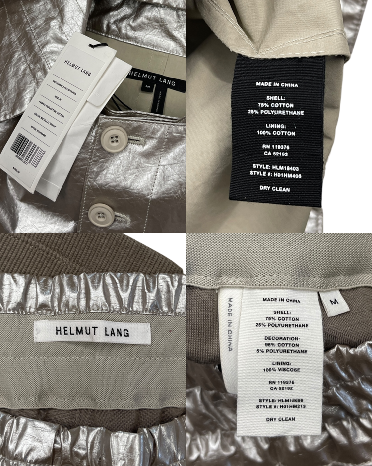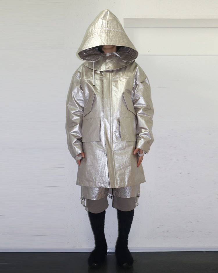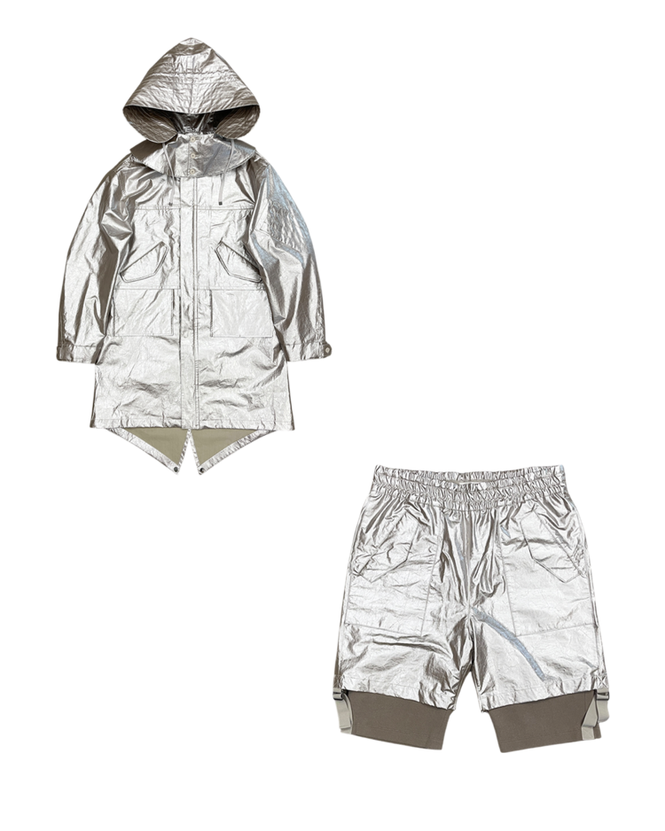 헬무트 랭 특유의 미니멀리즘과 밀리터리 감각을 현대적으로 해석해, 뉴욕 리뉴얼 이후 선보인 제품입니다. 메탈릭한 특수 코팅 나일론 소재로 제작되어 미래적인 질감과 형태감을 연출합니다. 파카는 오버사이즈 실루엣과 입체적인 포켓 디테일이 돋보이며, 하프 팬츠는 밑단의 니트 밴딩 처리로 기능성과 조형미를 동시에 구현했습니다. 헬무트 랭 특유의 미니멀리즘과 실험적인 소재 활용이 잘 드러나는 아이템입니다.