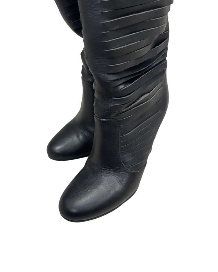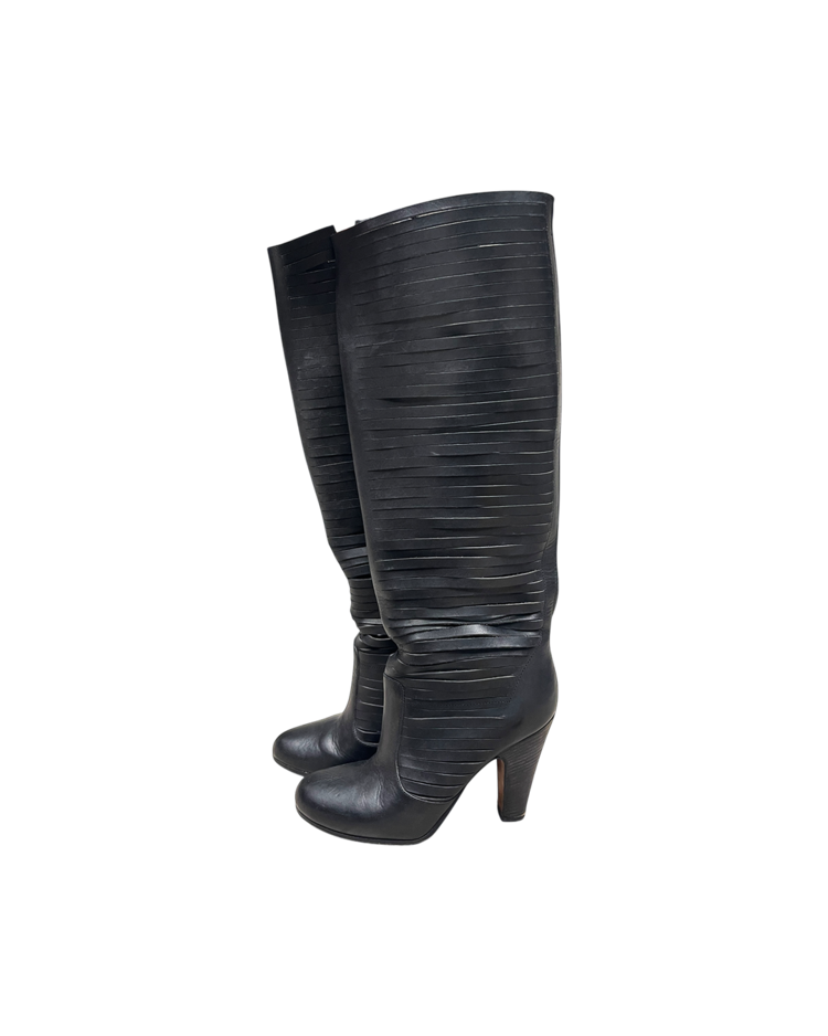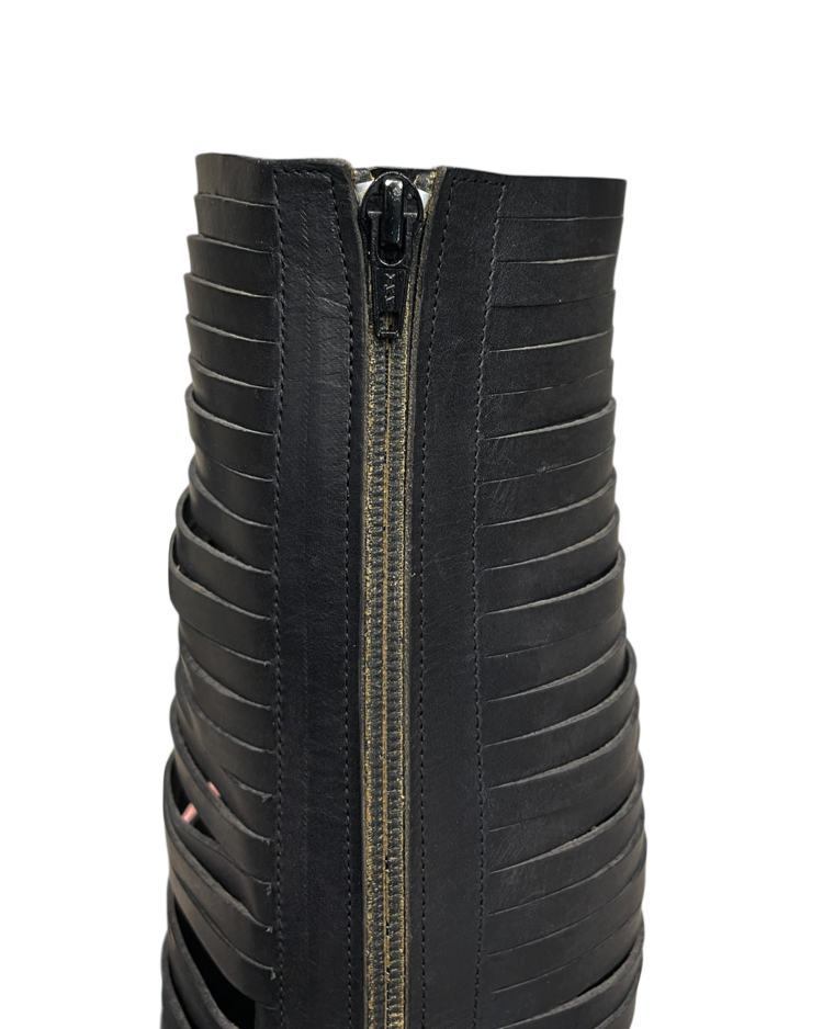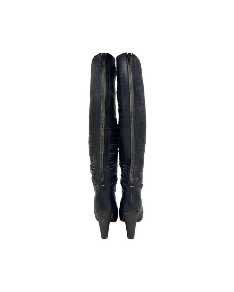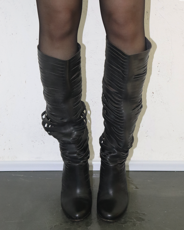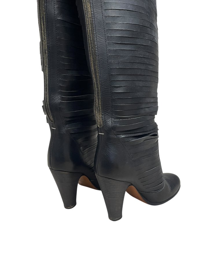 마틴 마르지엘라 08SS 시즌의 상징적인 슬래쉬드 디테일 롱 부츠입니다. 가죽을 얇게 절개하여 스타일링에 따라 미묘하게 형태가 변하는 독특한 질감을 연출합니다. 하이힐 구조와 유려한 실루엣이 결합되어 조형적이면서도 실험적인 매력을 보여주는 아카이브 피스입니다. 지퍼에 사용감 존재합니다.