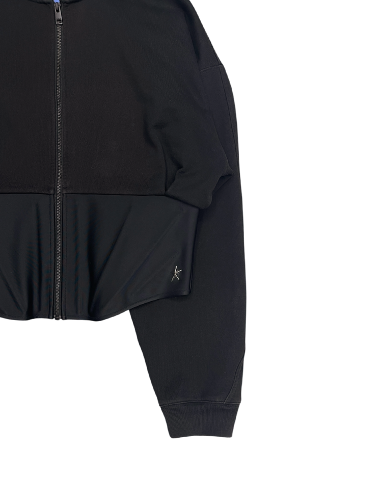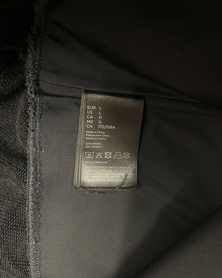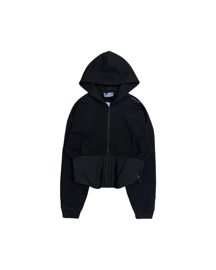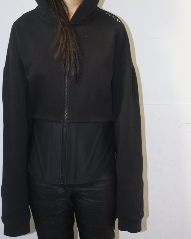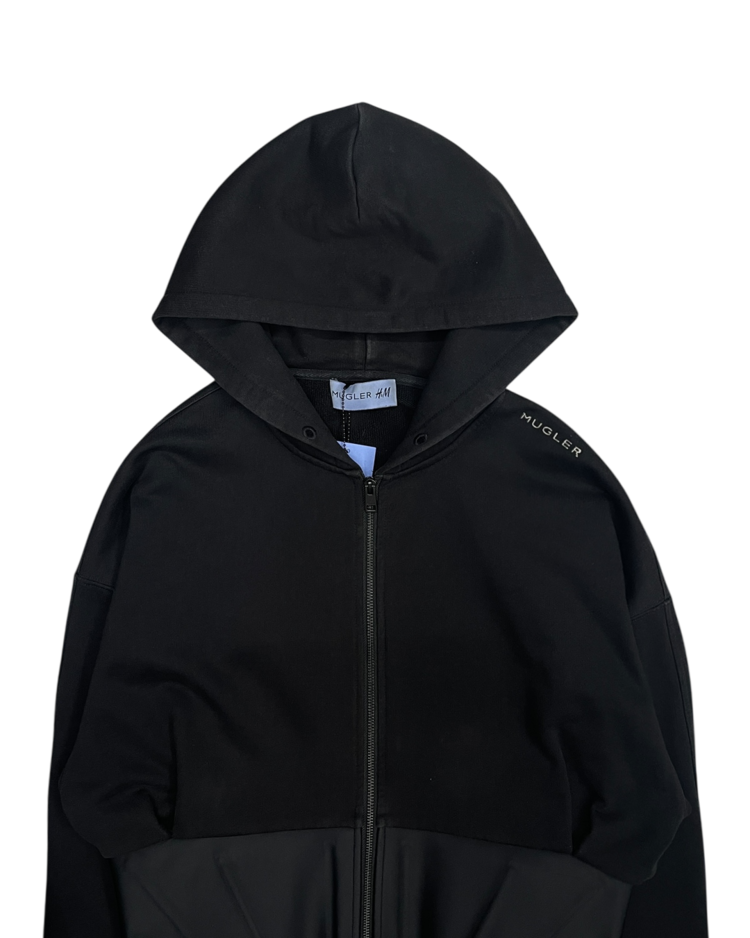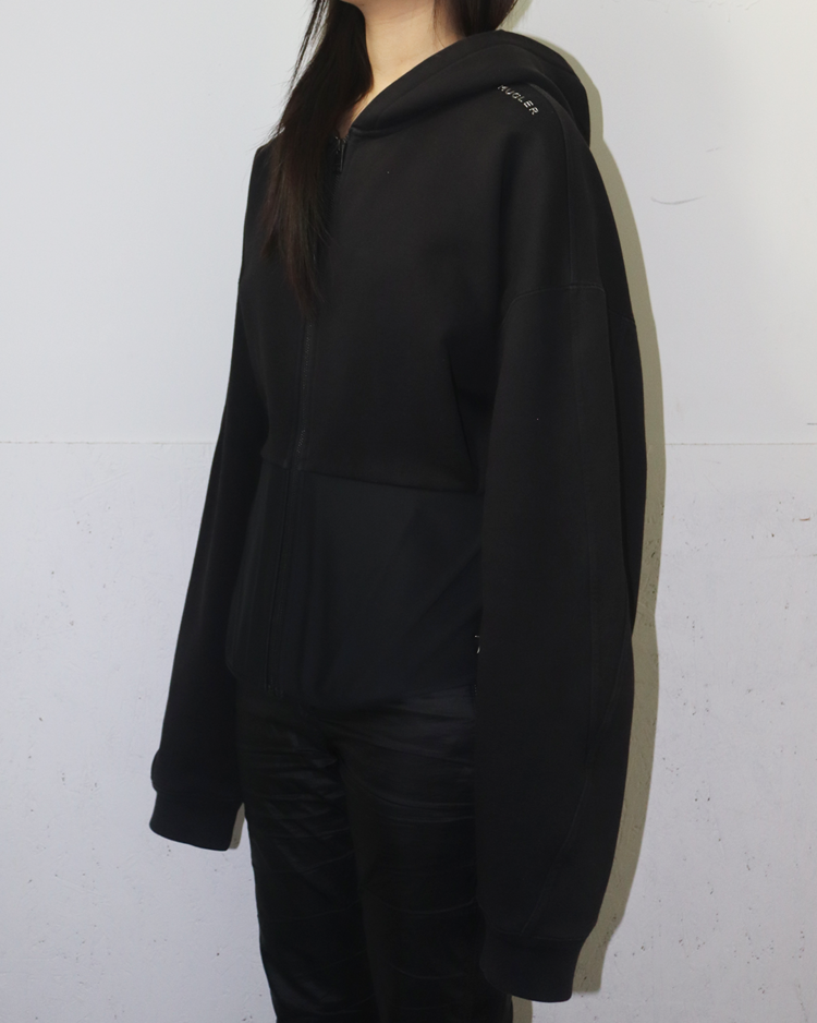 2023년 Mugler와 H&M의 콜라보레이션 제품으로, 젠더리스하고 실루엣을 강조하는 컬렉션입니다. 후드와 허리의 코르셋 디테일이 결합되어 뮈글러의 테일러드 디자인과 실루엣이 더욱 돋보이는 제품입니다. 전면부에 연한 오염 존재합니다.