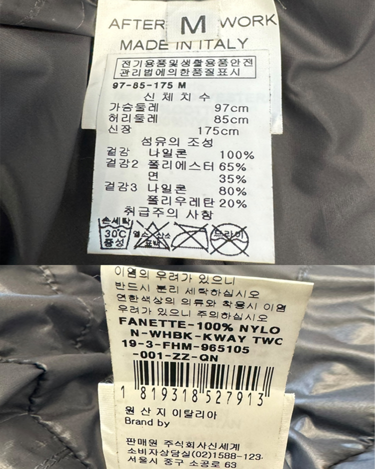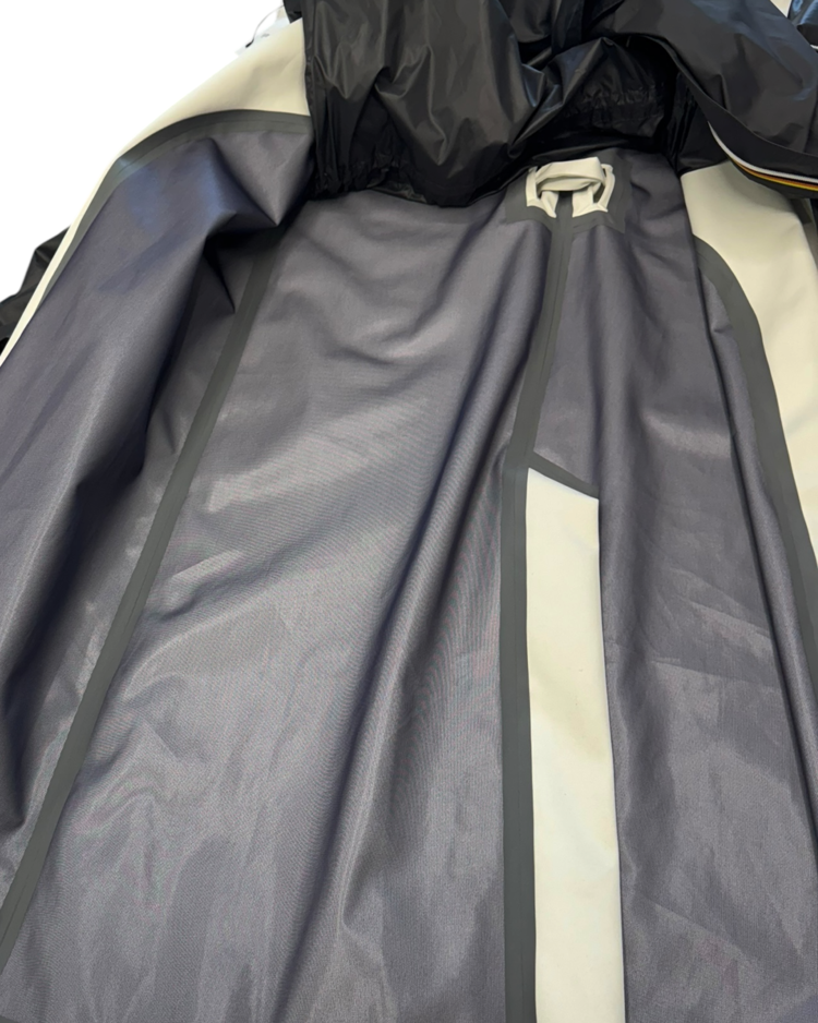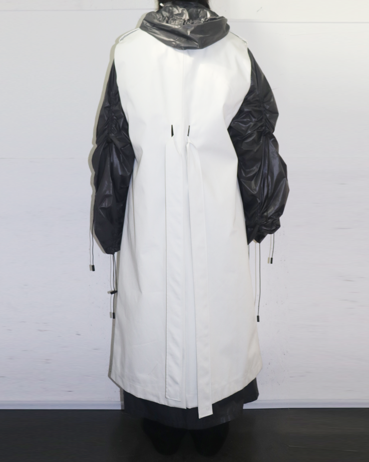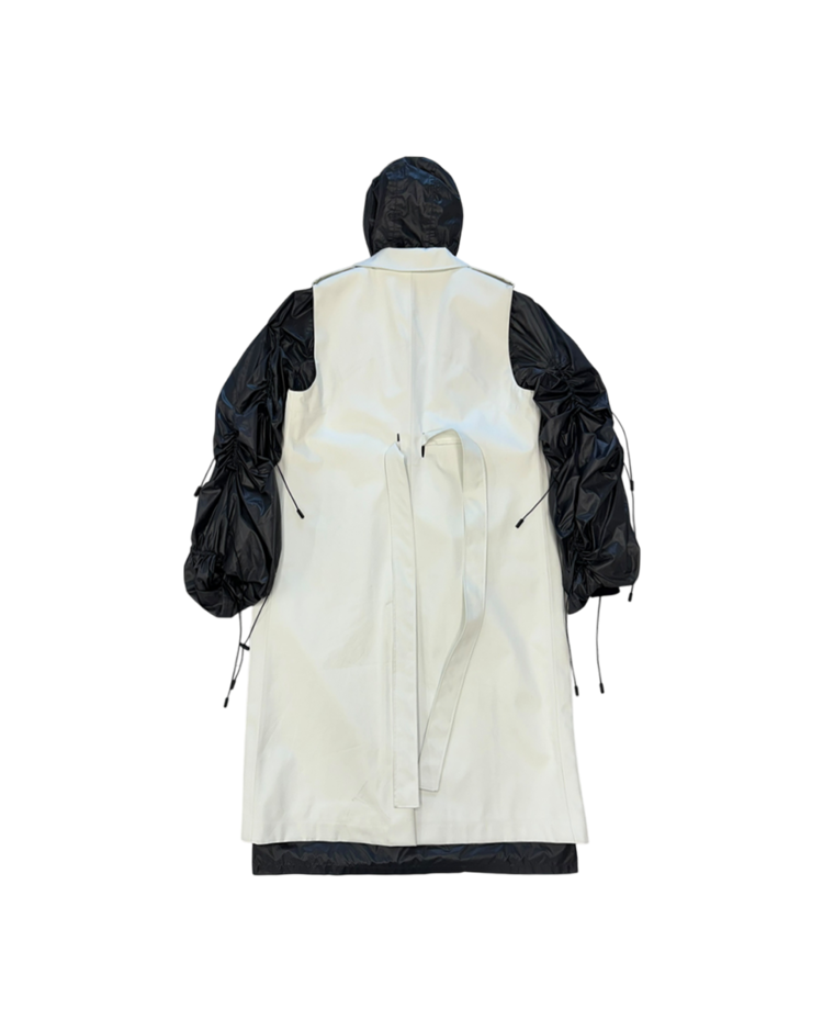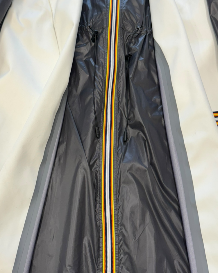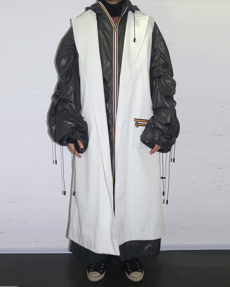 파리 기반의 실험적 레이블 Afterhomework이 프랑스 아웃도어 브랜드 K-Way와 협업해 선보인 19AW 컬렉션의 제품입니다. 트렌치 실루엣 위에 K-Way 특유의 경량·방수 나일론 파카를 결합한 구조로, 두 브랜드의 세계관이 동시에 드러나는 하이브리드 디자인이 특징입니다. 외부는 미니멀한 화이트 코튼 바디, 내부는 레이어드된 다크 그레이 나일론 파카로 구성되며, 볼륨감 있게 셔링된 슬리브, 멀티 드로스트링 디테일, K-Way 시그니처 스트라이프 지퍼, 콜라보레이션 로고 패치 등 기능성과 패션적 요소가 모두 강조되어 있습니다.