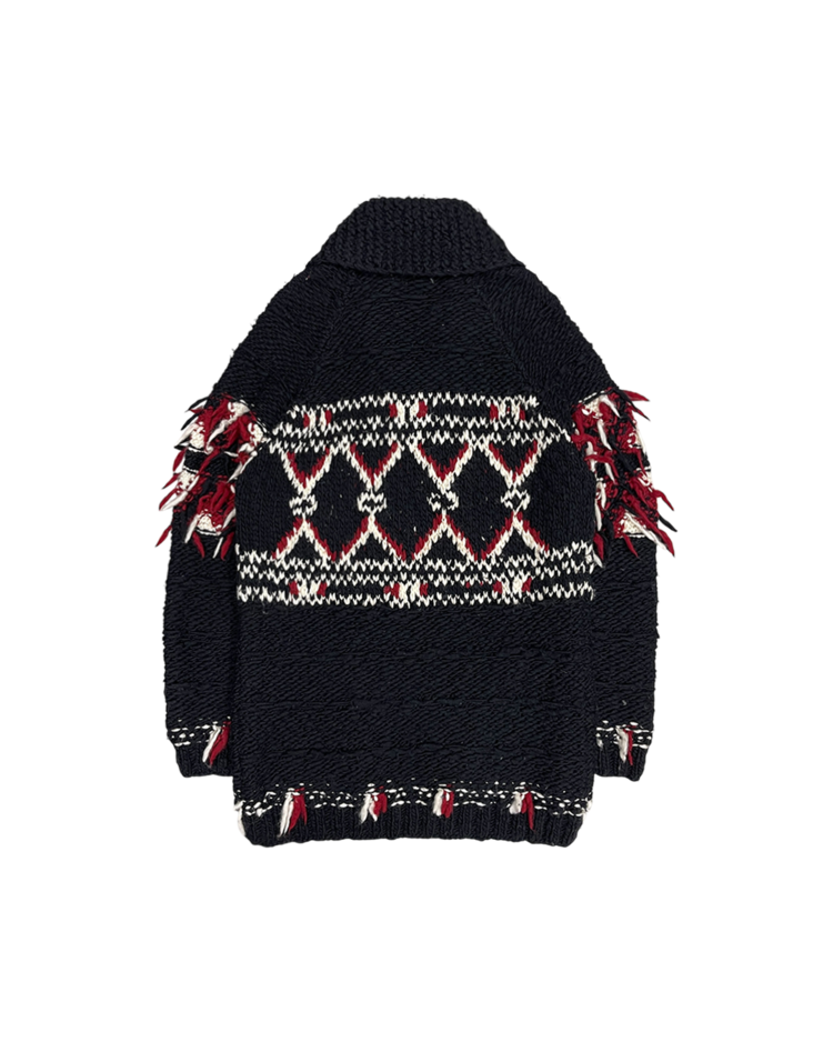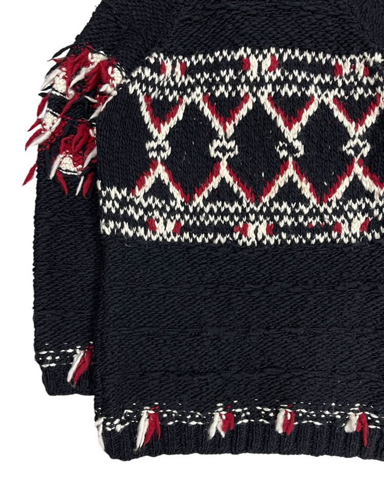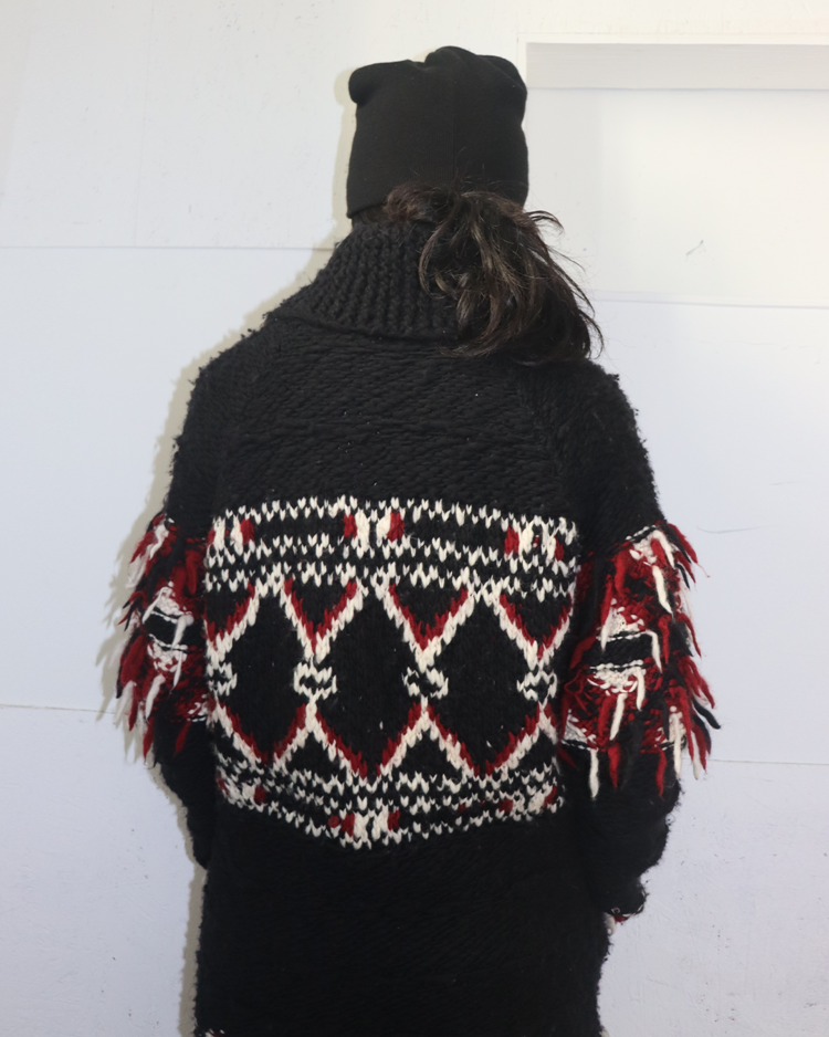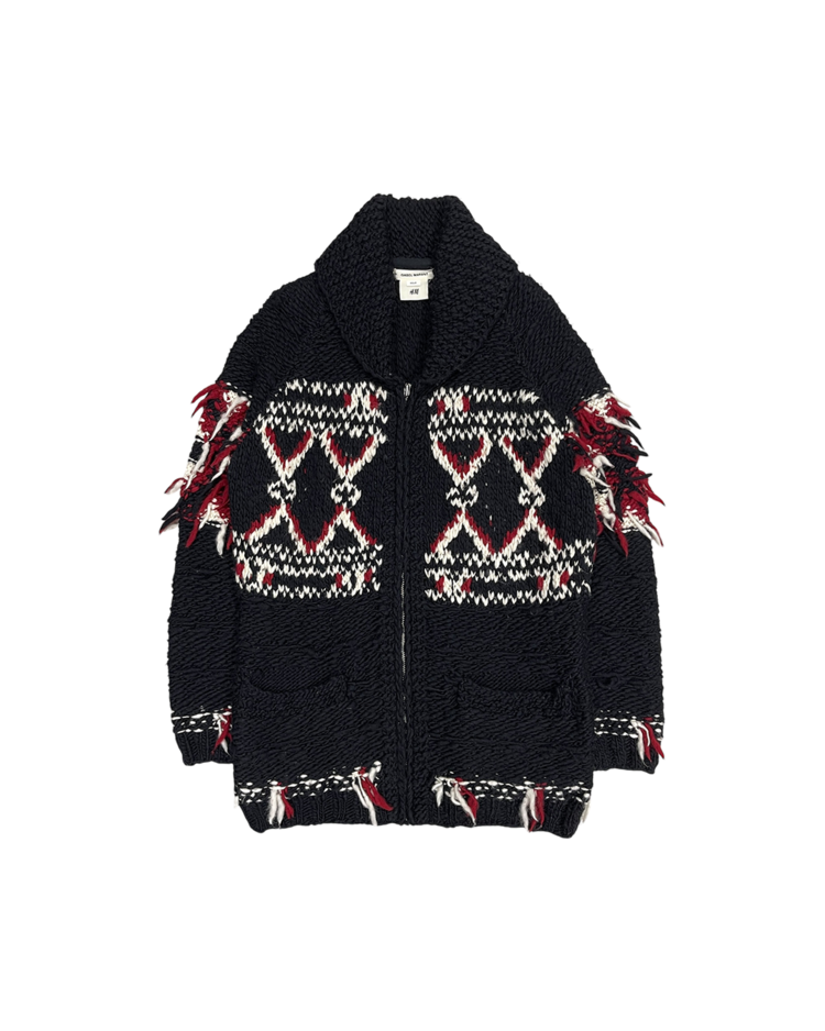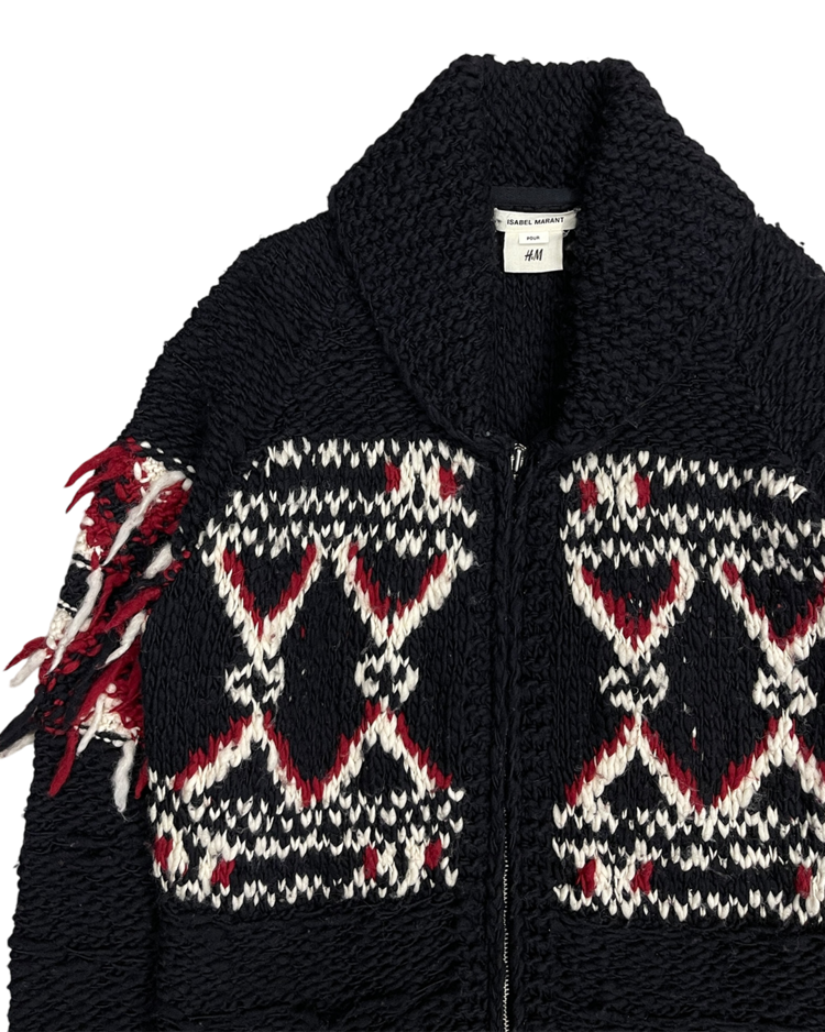 이자벨 마랑의 보헤미안 감성과 H&M의 대중적 접근성이 결합된 협업 컬렉션의 제품입니다. 전통적인 코위찬을 기반으로 어깨와 밑단에 러프하게 흩어진 실 장식을 더해 특유의 자유로운 무드를 강조했으며, 오버사이즈 실루엣으로 자연스럽게 스타일링이 가능합니다.