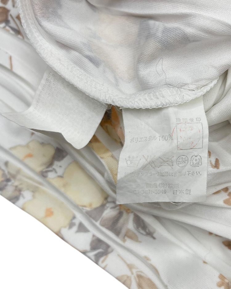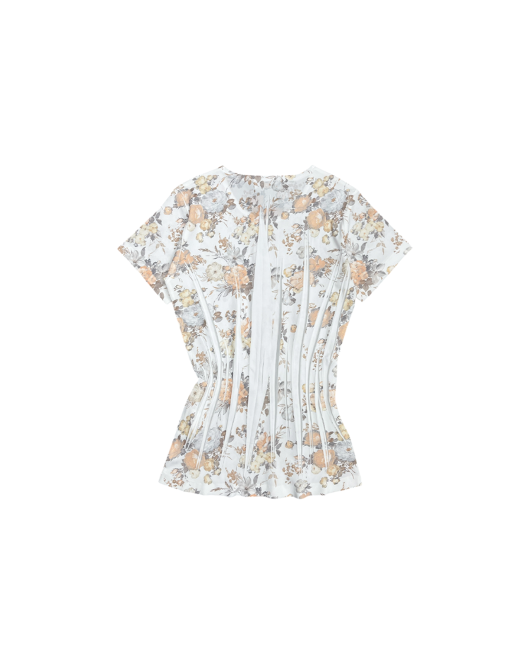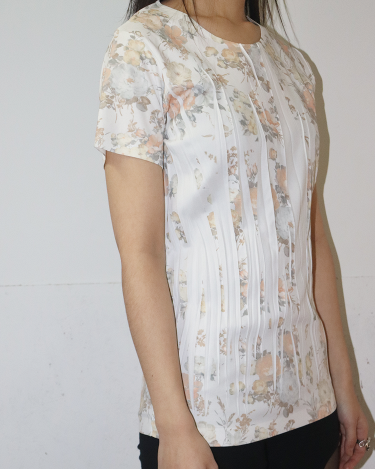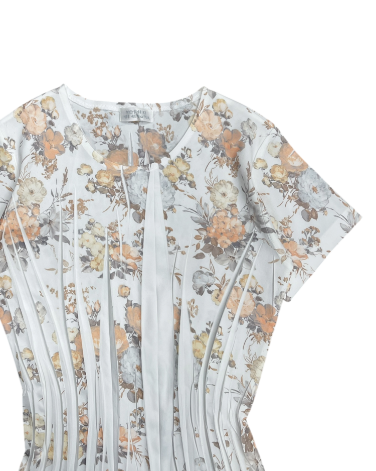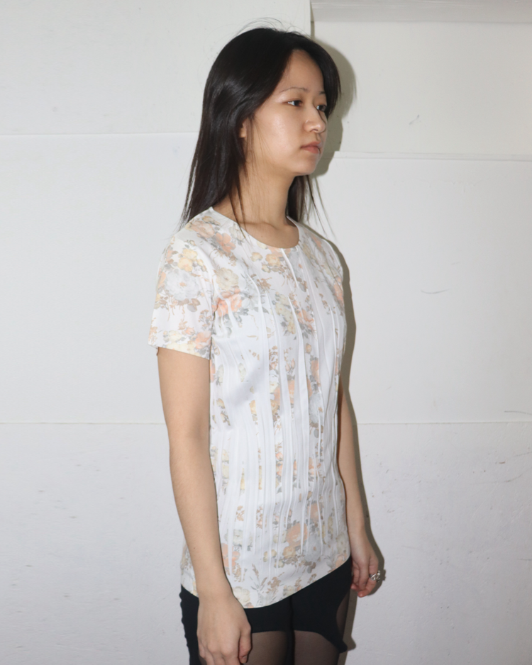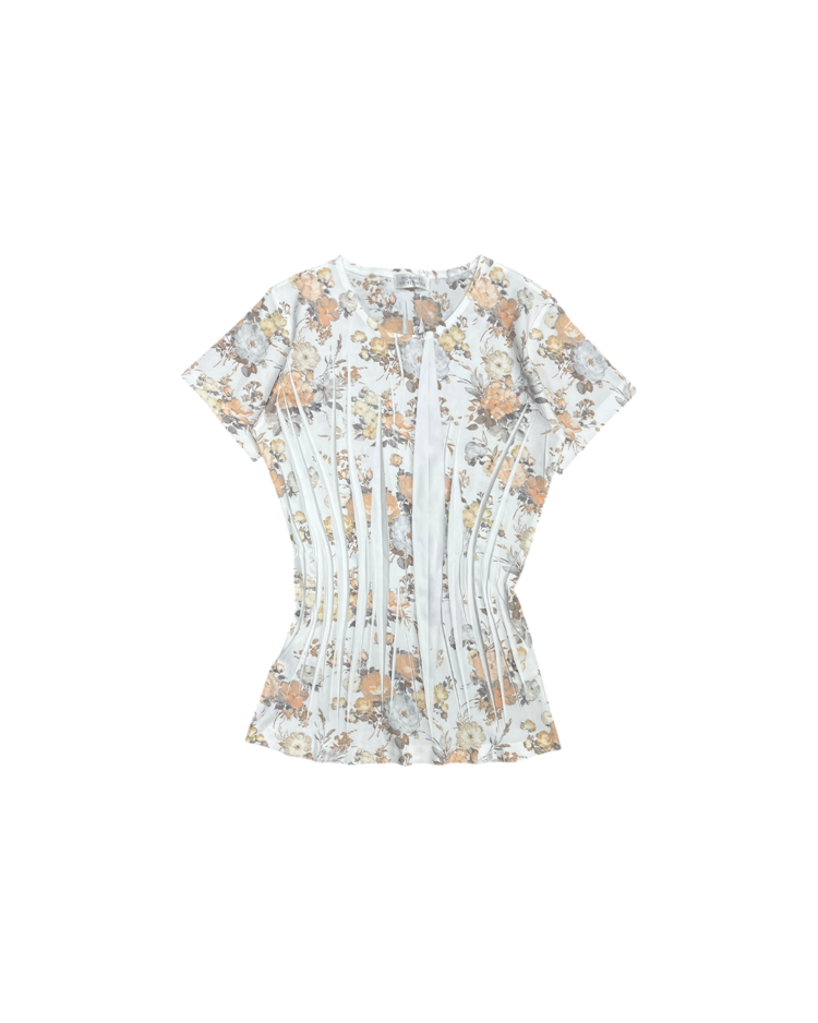 이세이 미야케 출신 디자이너로 움직임을 활용한 실험적인 실루엣을 현대적으로 해석하는 히시누마 요시키의 제품입니다. 플라워 프린트 위에 세로 방향으로 흐르는 플리츠가 더해져, 상체 라인을 따라 유려한 실루엣을 연출합니다. 은은한 파스텔 톤의 꽃 패턴과 입체적인 플리츠가 조화를 이루며, 단독으로 착용해도 완성도가 높은 아트피스 같은 티셔츠입니다.