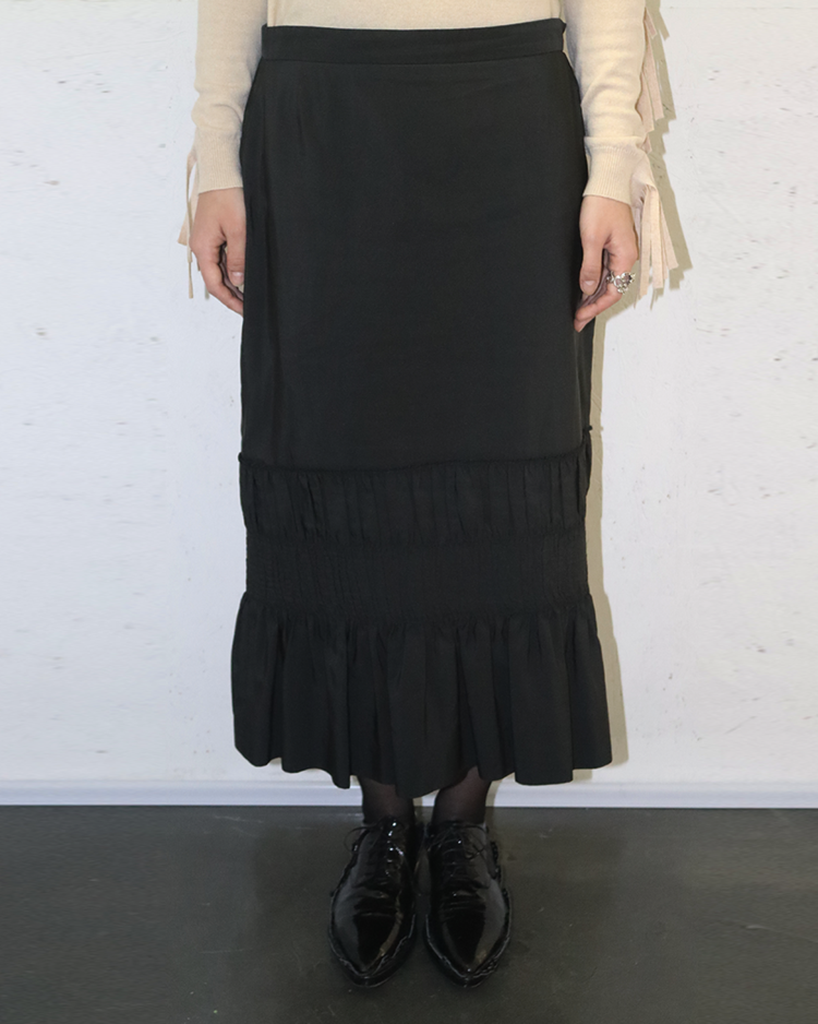 앤트워프 식스 중 한 명인 드리스 반 노튼의 제품입니다. 허리 아래부터 이어지는 스모킹 패널과 프릴 트리밍이 더해져 단정한 H라인 속에서도 유연한 움직임을 연출한 스커트로, 심플한 니트, 구조적 셔츠 등 자연스러운 스타일링이 가능한 아이템입니다.