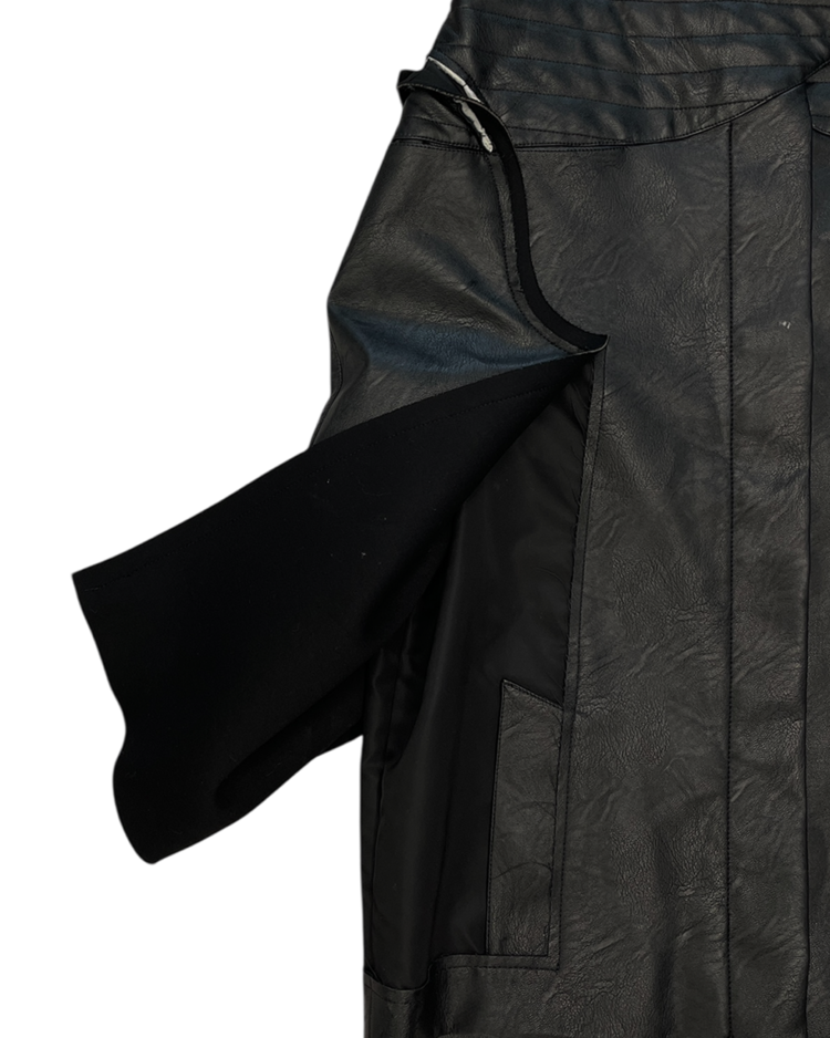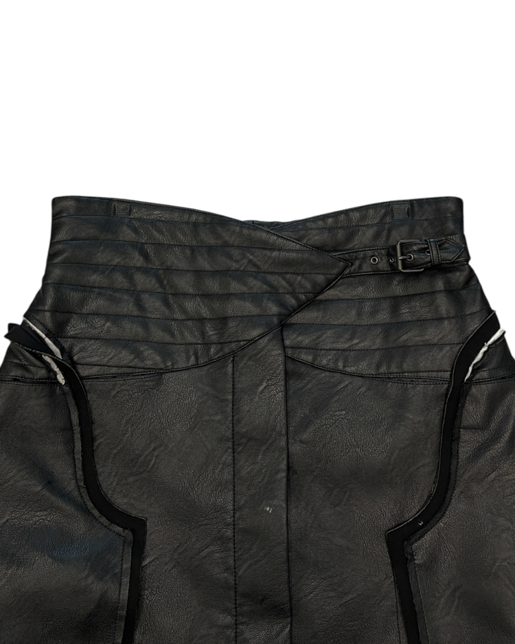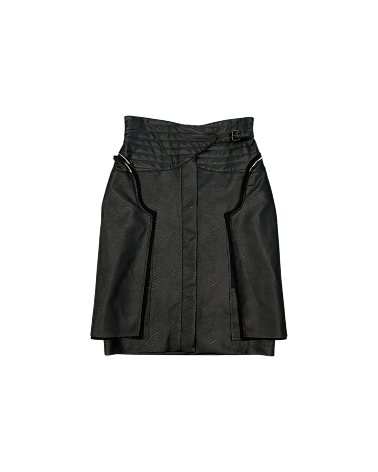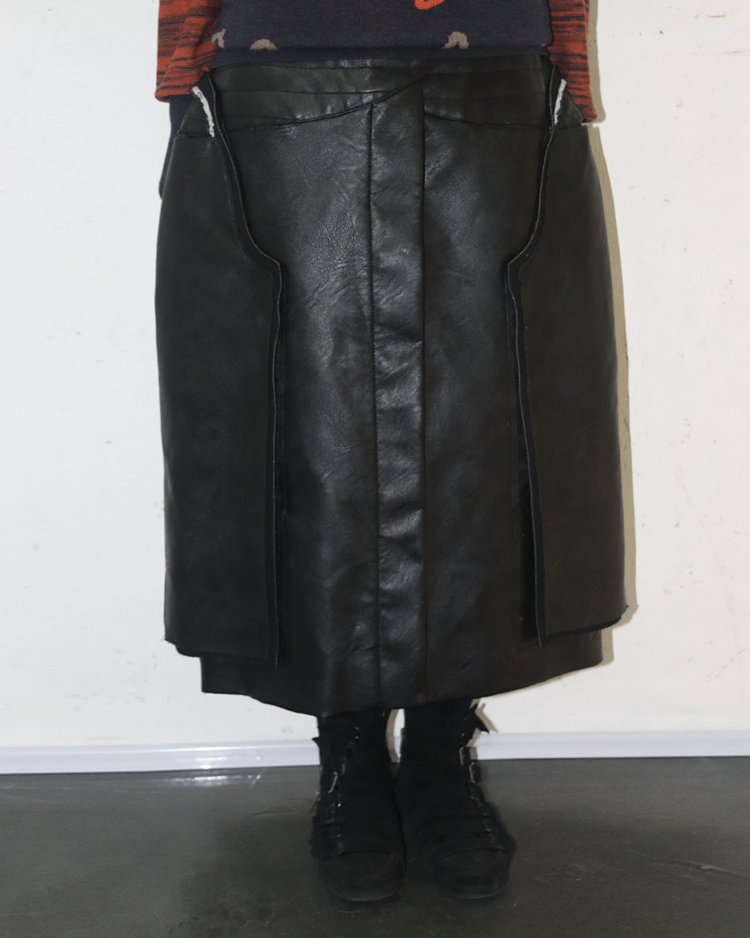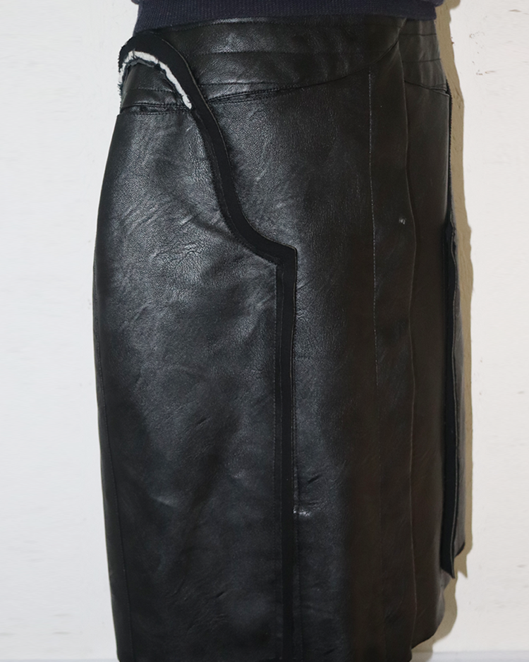 존 갈리아노가 이끌었던 마르지엘라의 제품입니다. 19AW 시즌 화이트 라벨 스커트로, 양가죽에 가까운 텍스처의 합성 레더를 사용해 19AW 시즌 특유의 산업적 분위기를 담아냈습니다. 패널을 열고 닫는 방식에 따라 실루엣이 확장되거나 좁아지는 구조가 특징이며, 곡선형 패널 라인, 비대칭 허리 벨트가 입체감을 연출합니다.