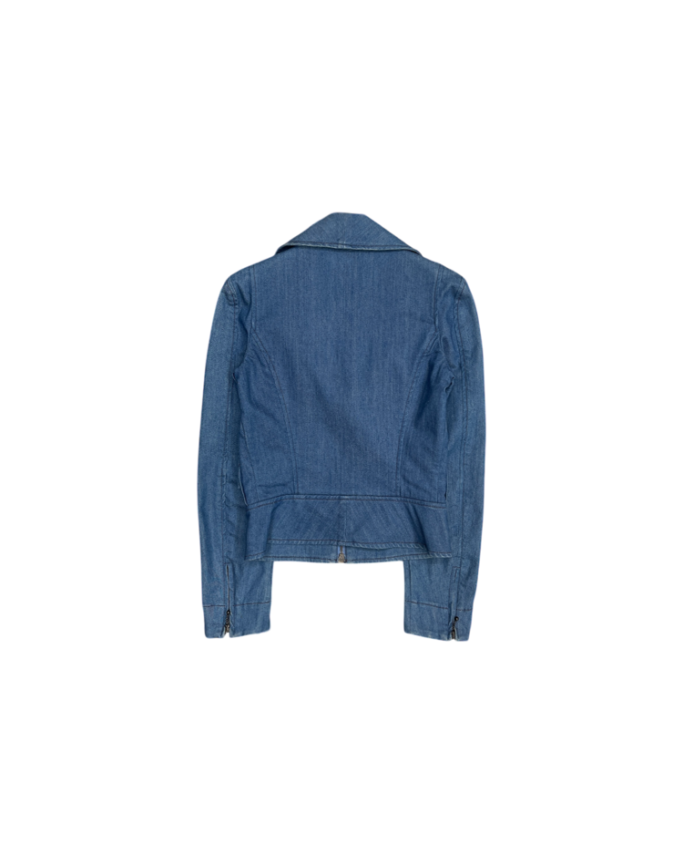 영국의 락 펑크 기반 브랜드 비비안 웨스트우드의 데님 자켓입니다. 09AW 시즌 제품이며 투웨이 지퍼 디테일과 하이넥으로 다양한 실루엣을 연출할 수 있습니다. 팔 후면부에 미세한 오염 존재합니다.