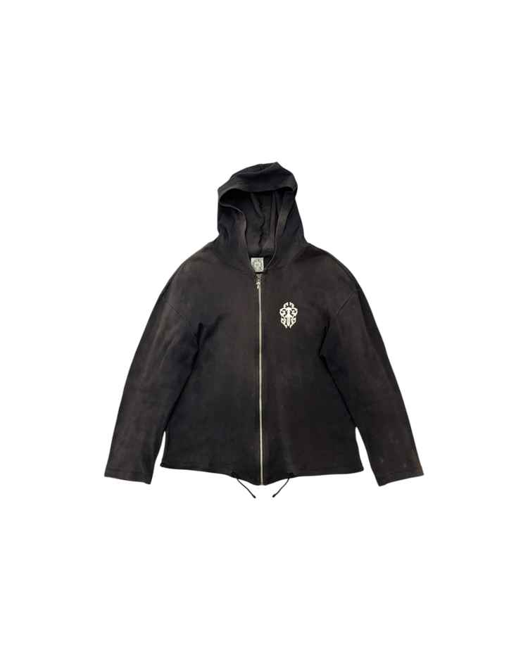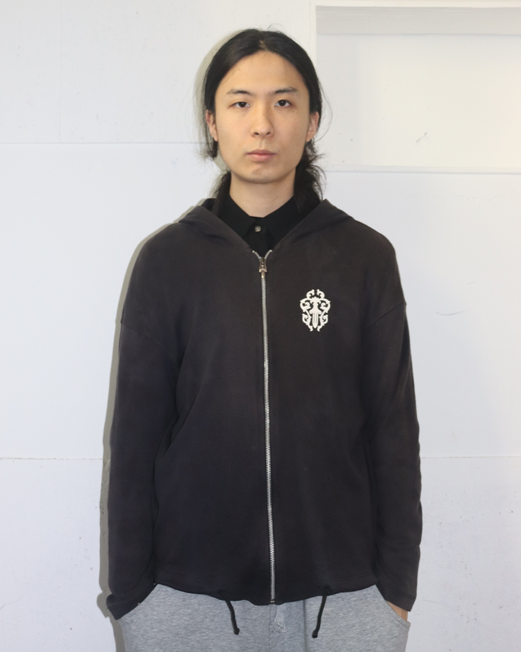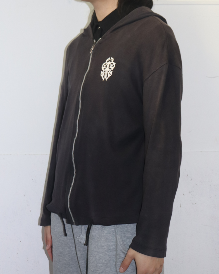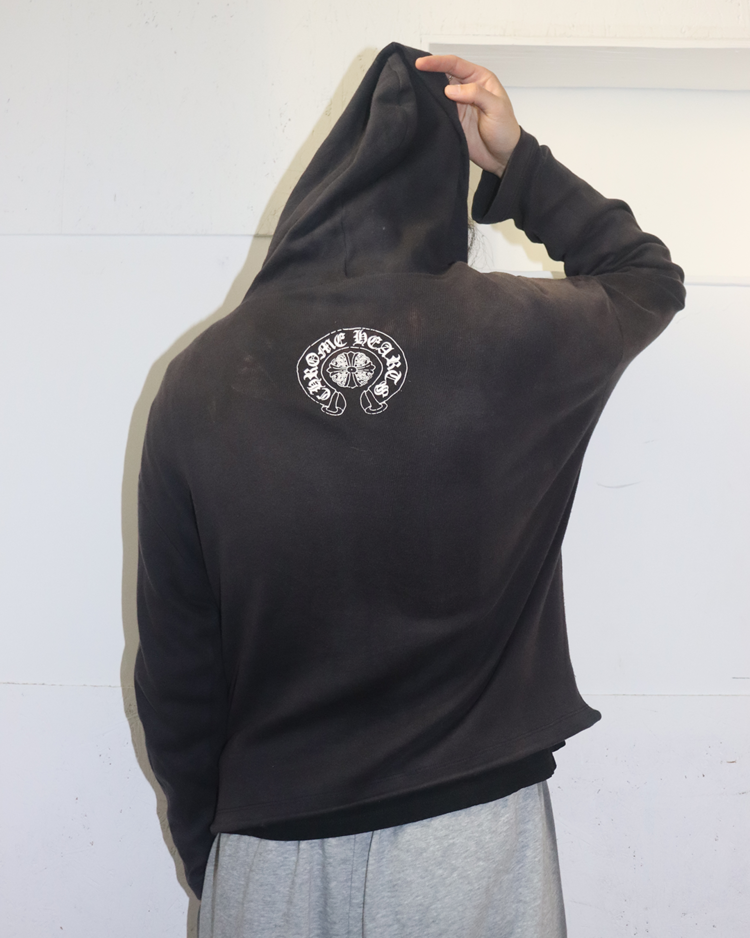 1989년 미국 캘리포니아에서 설립된 브랜드 크롬하츠의 제품입니다. 스트릿 패션 문화에 있어 셀럽들에게 인기를 끌었으며 실버 액세서리 또한 수공예로 제작되어 가치가 높습니다. 전면에는 대거, 후면에는 홀스슈 로고를 배치한 크롭 후드 집업으로, 자연스러운 워싱과 대거 지퍼가 빈티지 무드를 더했습니다. 간결한 실루엣 속에 브랜드 특유의 상징성이 선명하게 드러나는 아이템입니다.