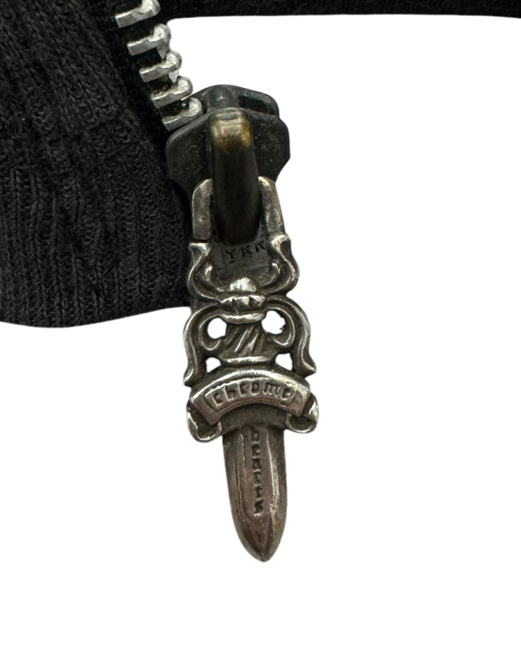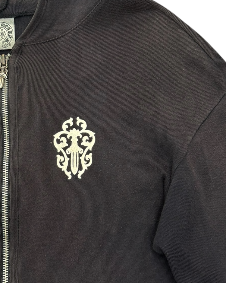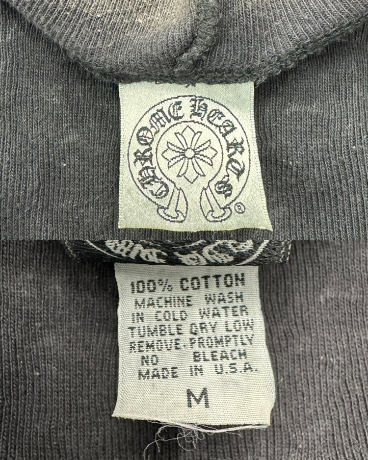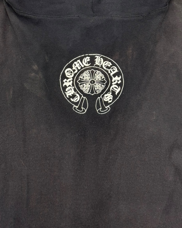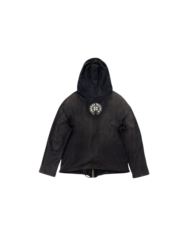 1989년 미국 캘리포니아에서 설립된 브랜드 크롬하츠의 제품입니다. 스트릿 패션 문화에 있어 셀럽들에게 인기를 끌었으며 실버 액세서리 또한 수공예로 제작되어 가치가 높습니다. 전면에는 대거, 후면에는 홀스슈 로고를 배치한 크롭 후드 집업으로, 자연스러운 워싱과 대거 지퍼가 빈티지 무드를 더했습니다. 간결한 실루엣 속에 브랜드 특유의 상징성이 선명하게 드러나는 아이템입니다.