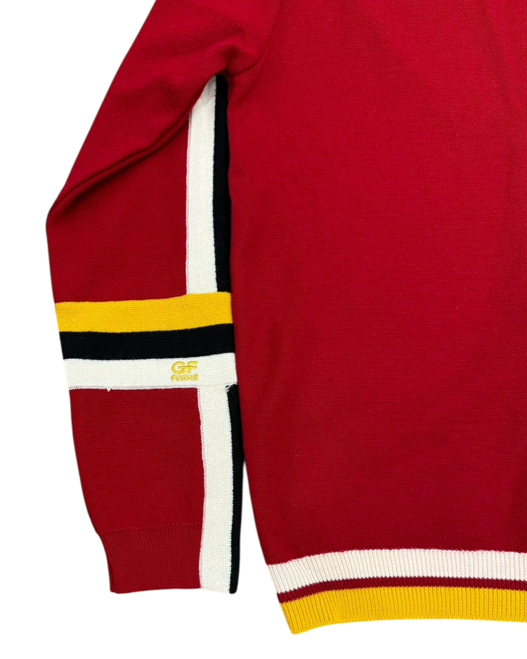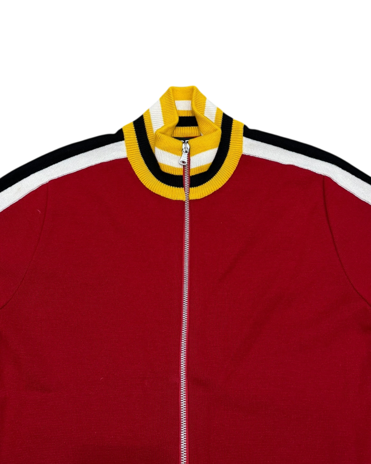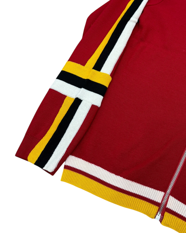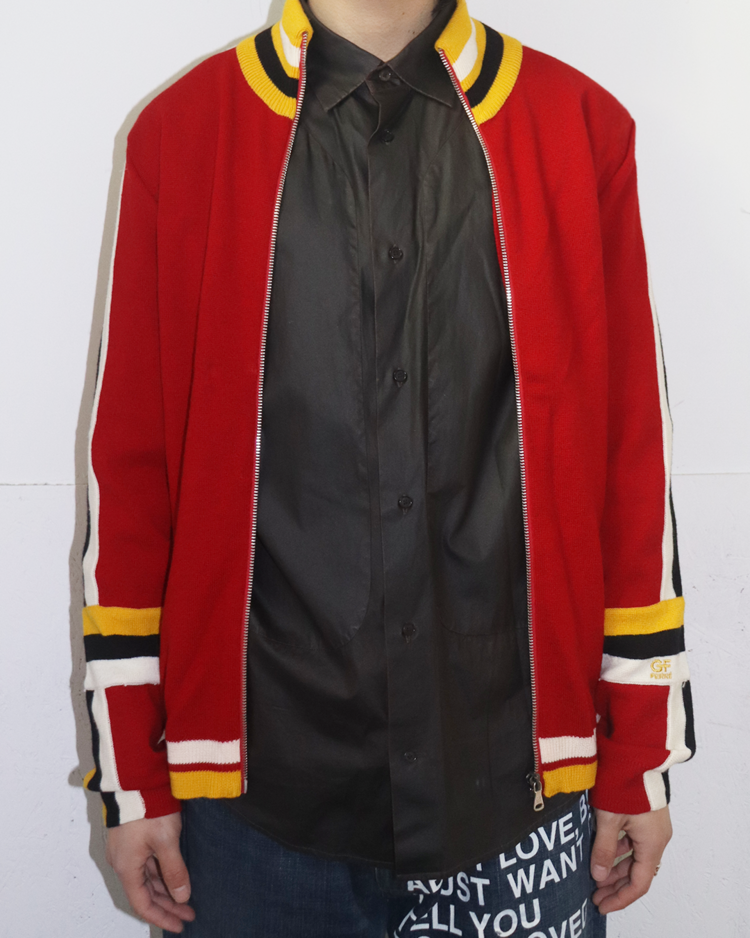 구조적이고 조형적인 접근을 기반으로, 과감한 실루엣과 세련된 장식을 결합해온 건축학도 출신의 이탈리아 디자이너 지안프랑코 페레의 제품입니다. 버건디 바디에 옐로우·화이트·블랙의 라인 블로킹을 더한 니트 집업으로, 그래픽적인 스트라이프 배치를 통해 구조적 아름다움을 가볍고 스포티한 무드로 재해석했습니다.