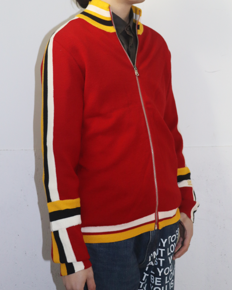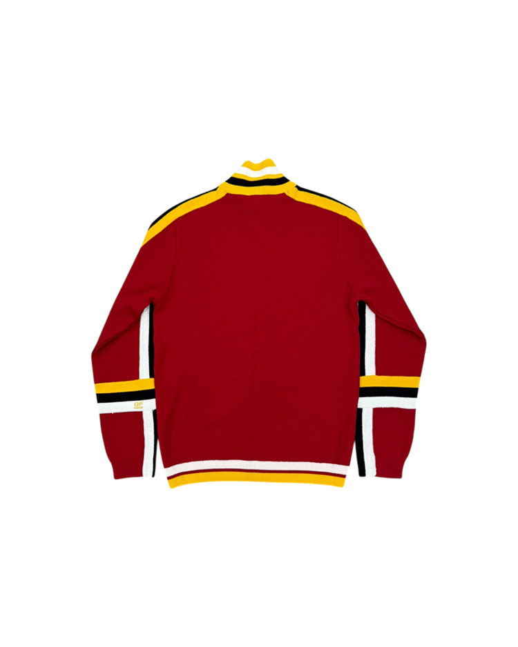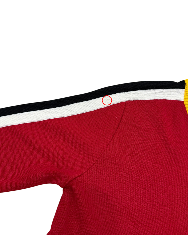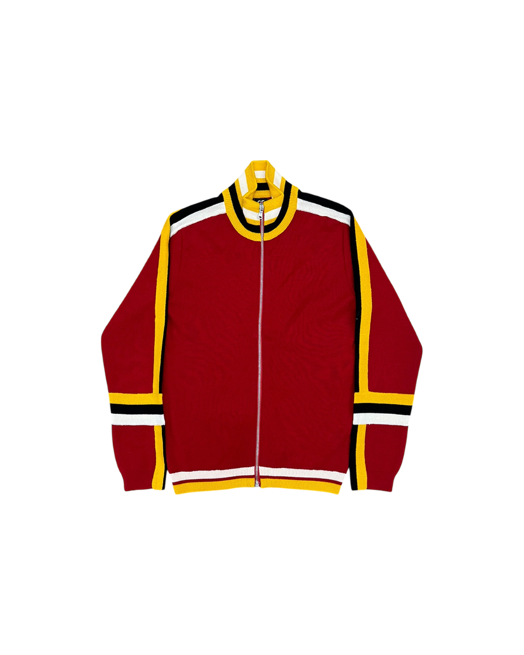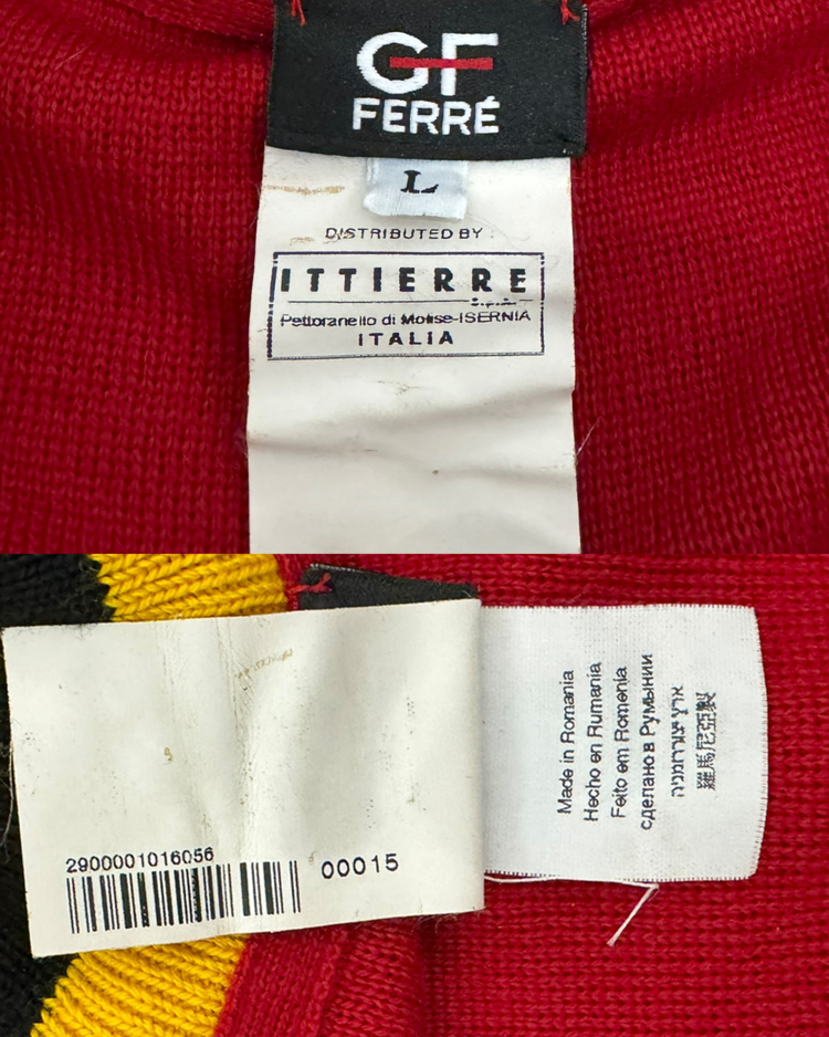 구조적이고 조형적인 접근을 기반으로, 과감한 실루엣과 세련된 장식을 결합해온 건축학도 출신의 이탈리아 디자이너 지안프랑코 페레의 제품입니다. 버건디 바디에 옐로우·화이트·블랙의 라인 블로킹을 더한 니트 집업으로, 그래픽적인 스트라이프 배치를 통해 구조적 아름다움을 가볍고 스포티한 무드로 재해석했습니다.
