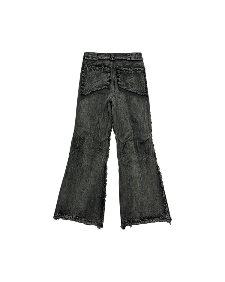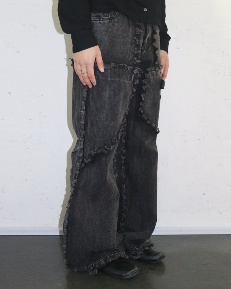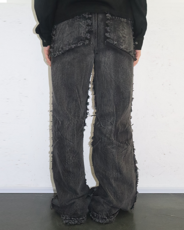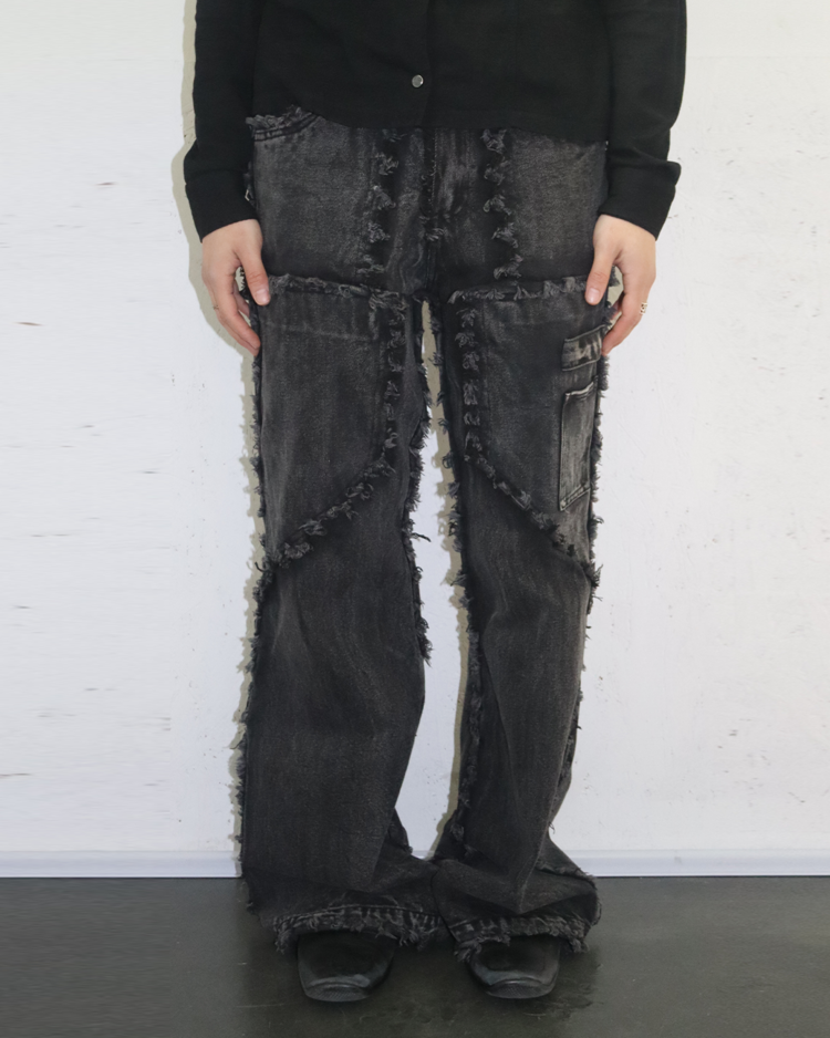 해체주의와 재구성을 통해 ‘불완전함의 미학’을 날카롭게 드러내는 독일의 브랜드 노 페이스 스튜디오의 제품입니다. 조각난 패널을 러프하게 잇는 프레이 라인과 불균일한 워싱 텍스처, 무릎 아래로 자연스럽게 벌어지는 플레어 실루엣이 결합되며 특유의 실험적 구조미를 완성한 아이템입니다.