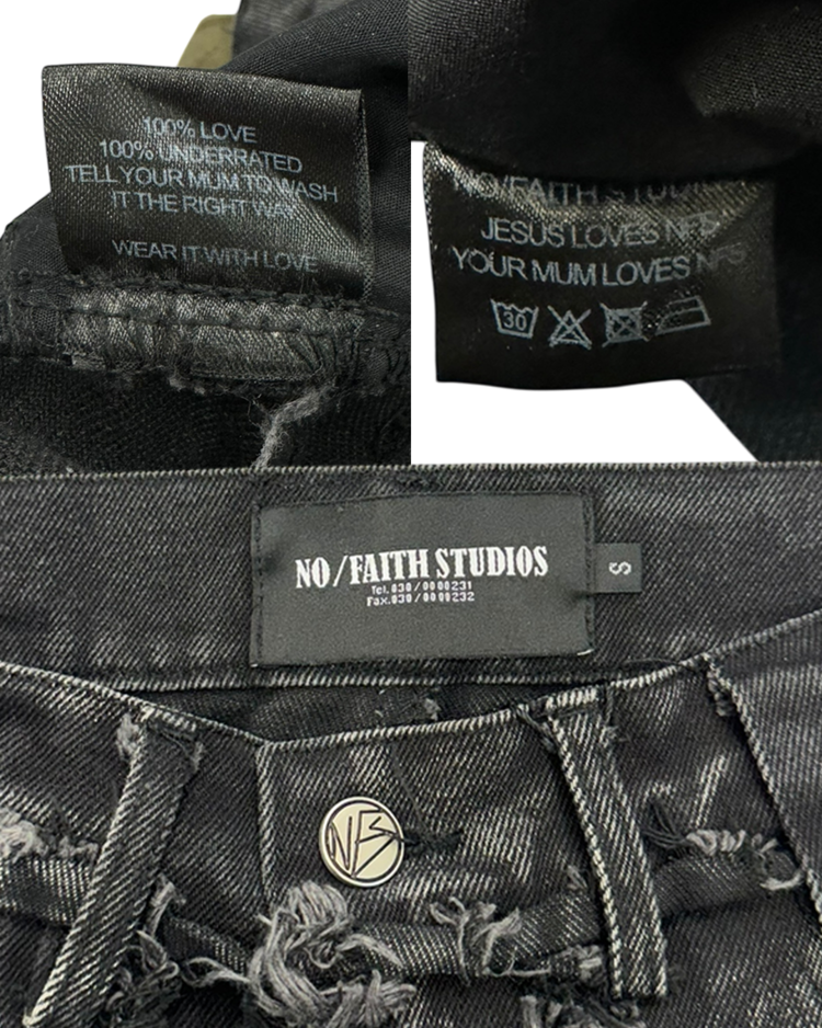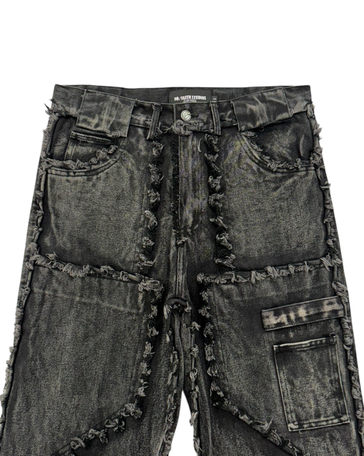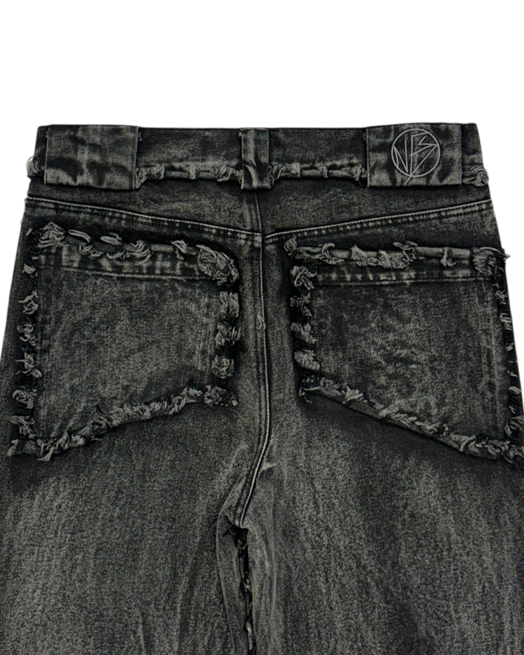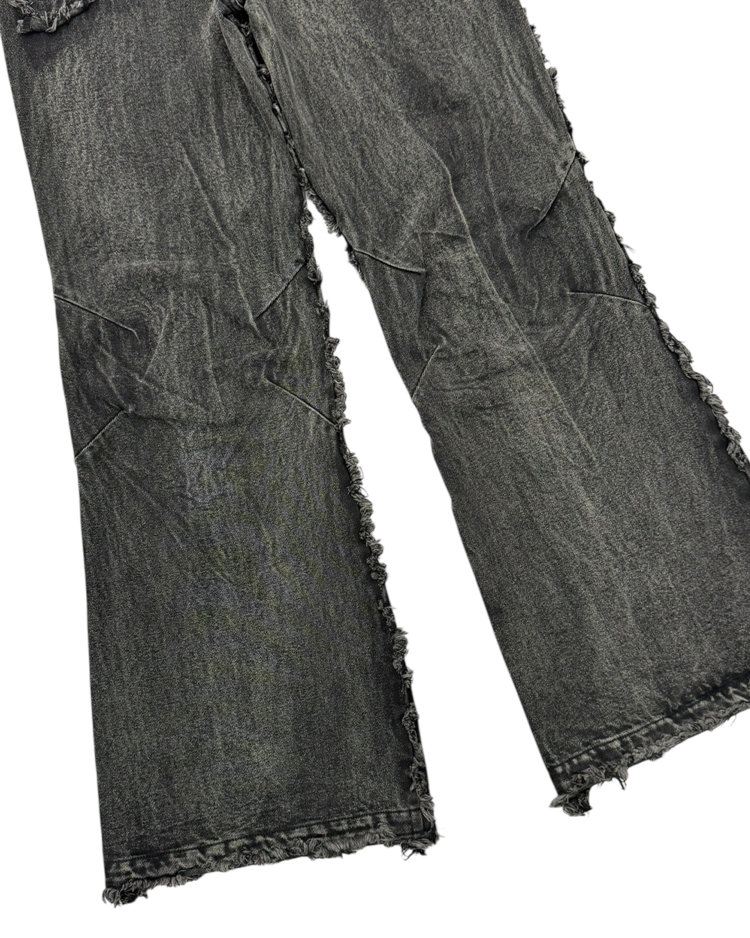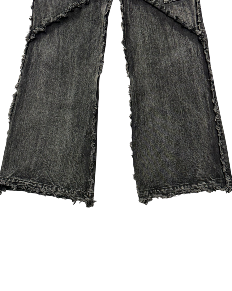 해체주의와 재구성을 통해 ‘불완전함의 미학’을 날카롭게 드러내는 독일의 브랜드 노 페이스 스튜디오의 제품입니다. 조각난 패널을 러프하게 잇는 프레이 라인과 불균일한 워싱 텍스처, 무릎 아래로 자연스럽게 벌어지는 플레어 실루엣이 결합되며 특유의 실험적 구조미를 완성한 아이템입니다.