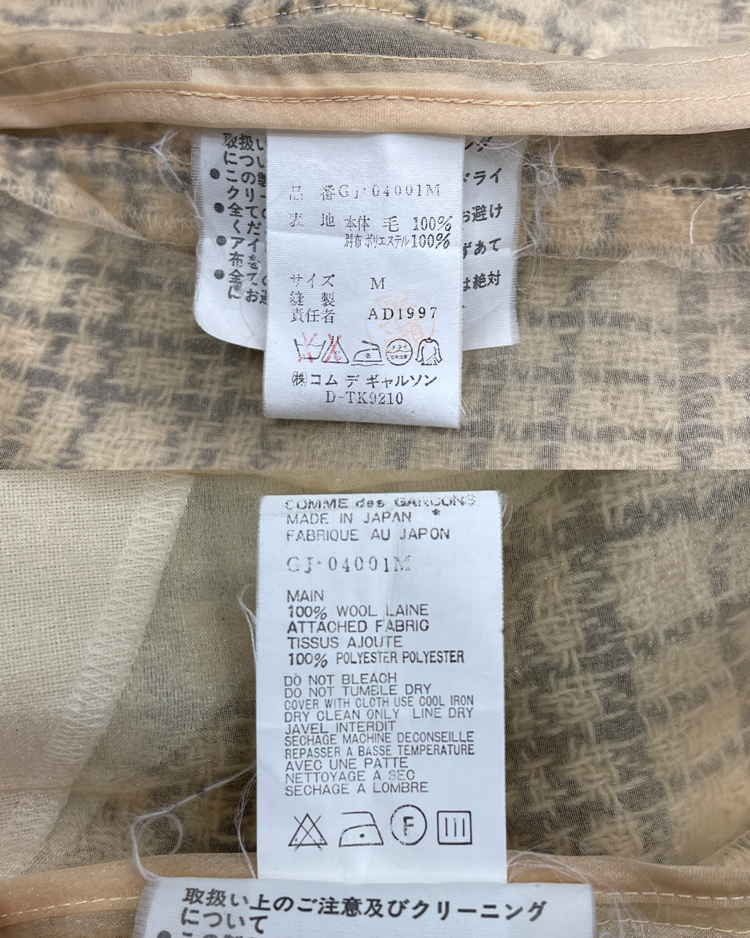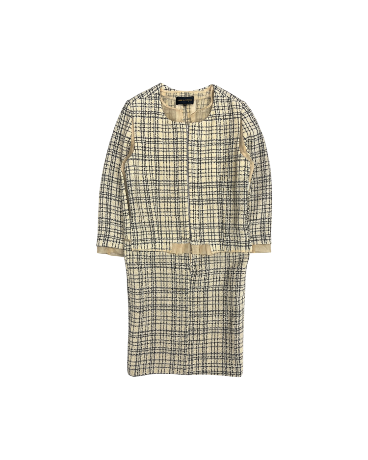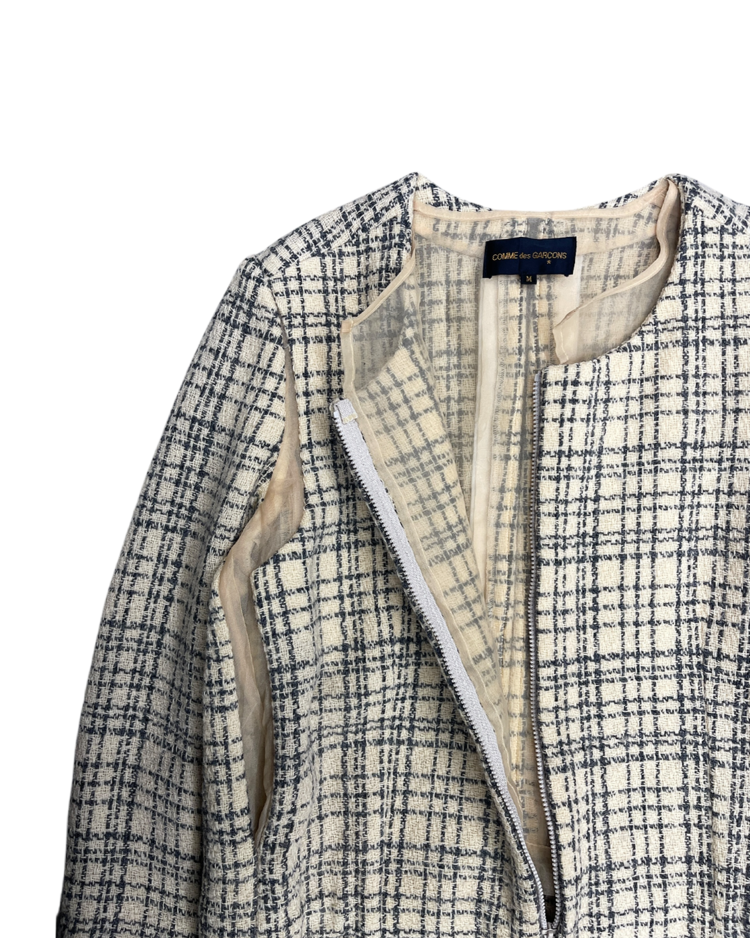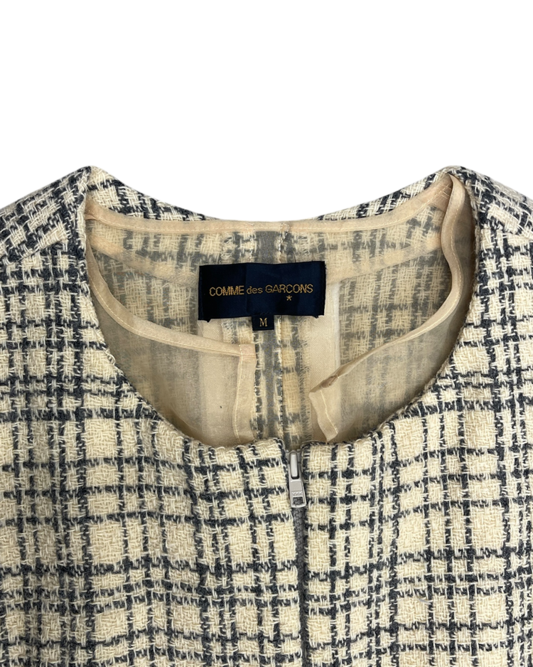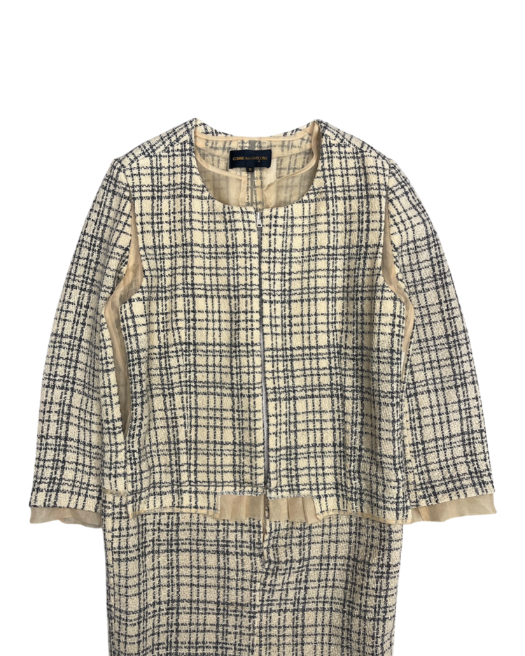 혁신적인 해체주의 미학으로 알려진 일본 브랜드 꼼데가르송의 제품입니다. 작품처럼 재구성되어 브랜드 철학이 그대로 반영된 드레스로, 겹쳐 입은 듯한 레이어드 구성, 트위드의 중량감과 지퍼 디테일의 대비, 미묘하게 어긋난 비율이 만들어내는 비정형적 실루엣이 특징입니다. 차분한 체크 패턴 안에서 구조적 실험이 드러나는, CDG 고유의 ‘단정한 파격’을 느낄 수 있는 아이템입니다.