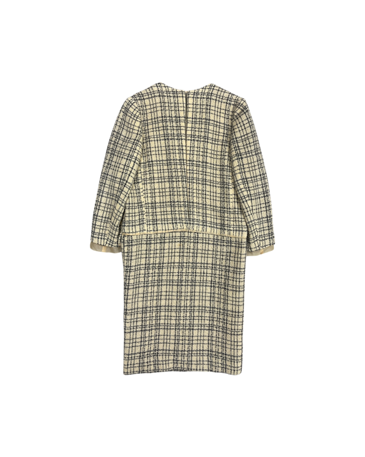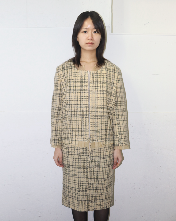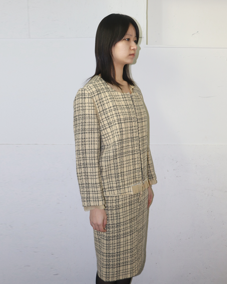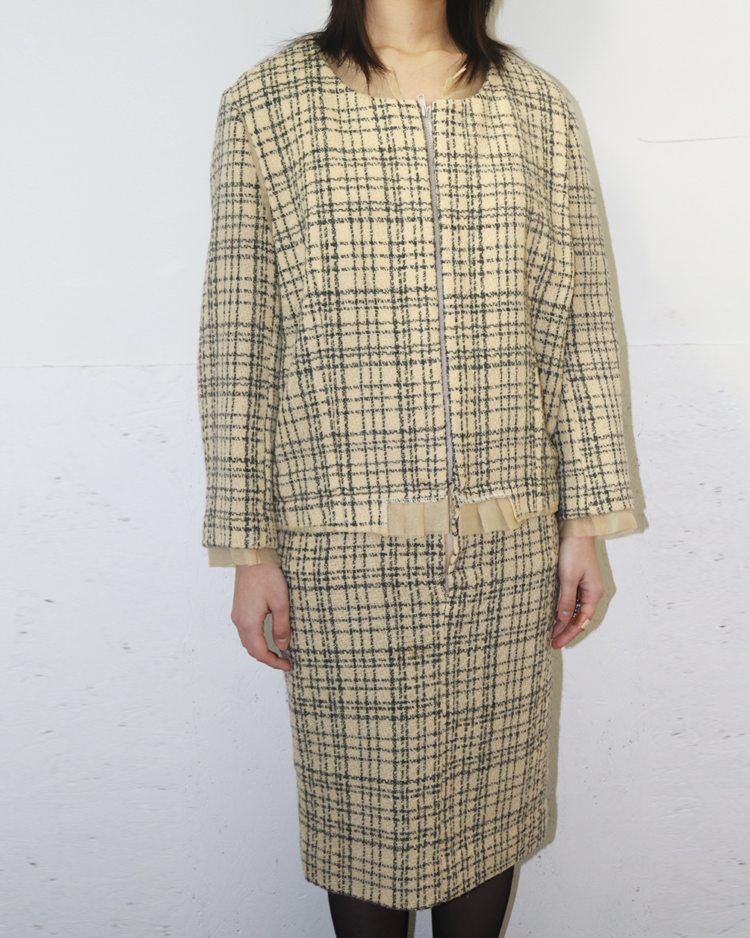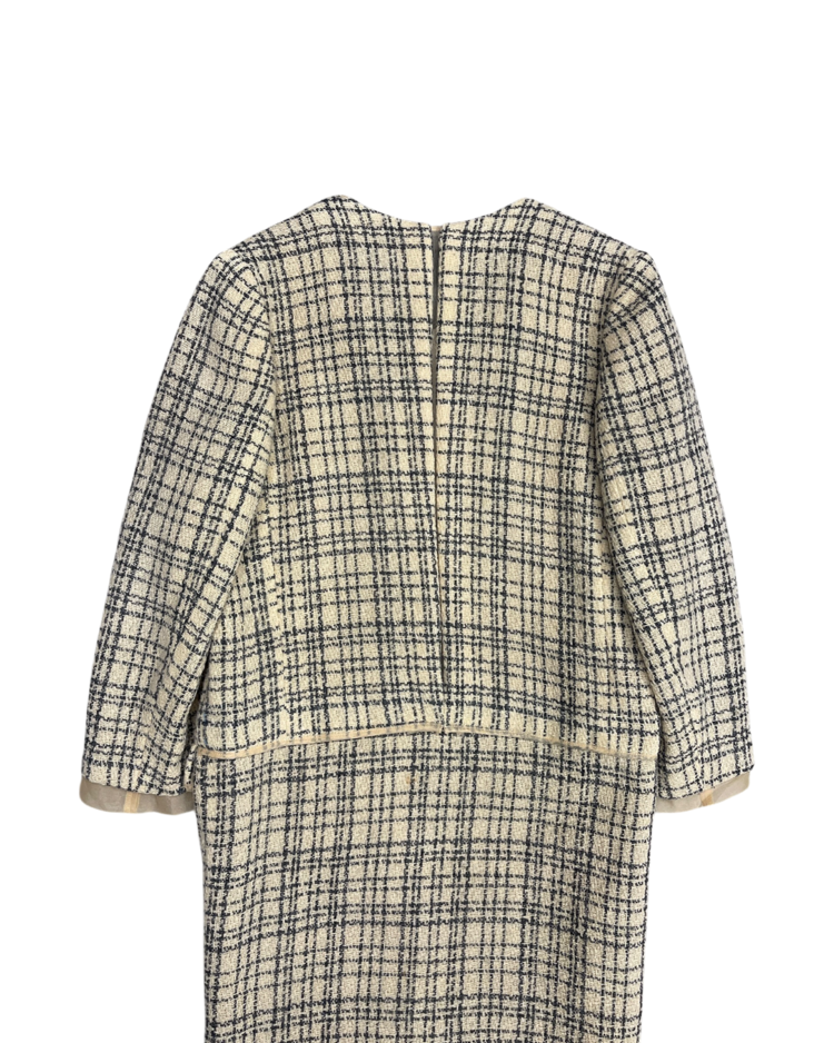 혁신적인 해체주의 미학으로 알려진 일본 브랜드 꼼데가르송의 제품입니다. 작품처럼 재구성되어 브랜드 철학이 그대로 반영된 드레스로, 겹쳐 입은 듯한 레이어드 구성, 트위드의 중량감과 지퍼 디테일의 대비, 미묘하게 어긋난 비율이 만들어내는 비정형적 실루엣이 특징입니다. 차분한 체크 패턴 안에서 구조적 실험이 드러나는, CDG 고유의 ‘단정한 파격’을 느낄 수 있는 아이템입니다.