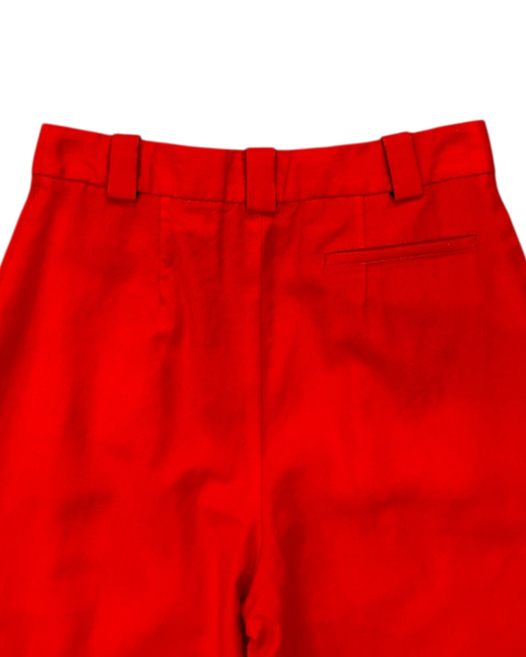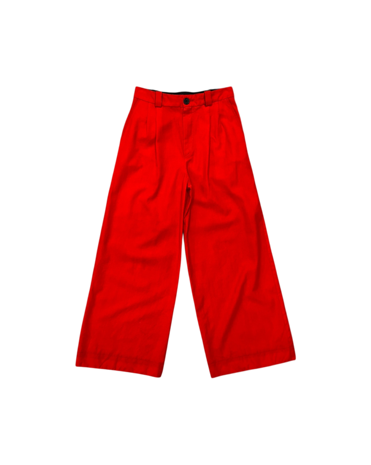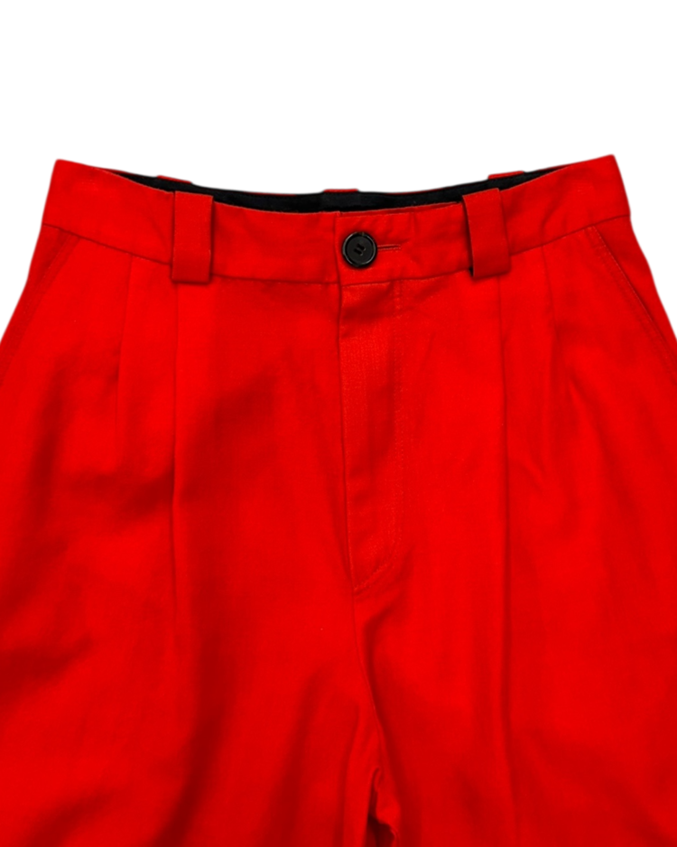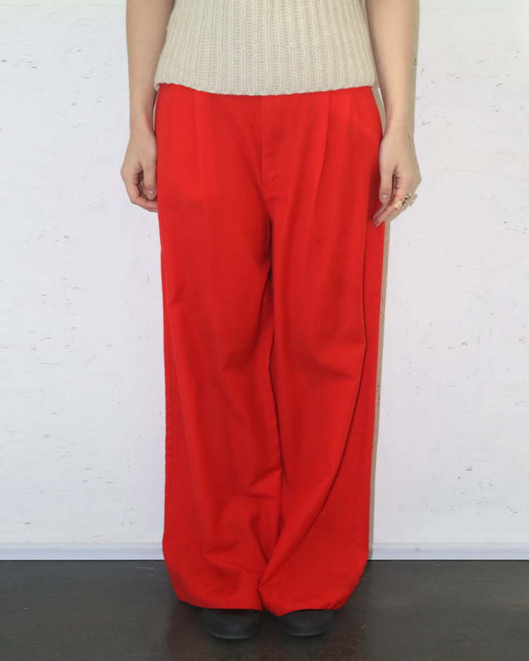 절제·긴장·정적 아름다움을 핵심으로, 장식이나 과한 제스처보다 비율, 여백, 실루엣의 힘에 집중하며, 옷이 몸에서 만들어내는 그림자와 선을 중요하게 다루는 콰이단 에디션의 제품입니다. 19AW 시즌의 팬츠로 하이 웨이스트, 깊은 턱, 길게 떨어지는 레그 라인으로 몸의 실루엣을 드러내기보다 형태를 조형한 것이 특징입니다. 단정하지만 차갑고, 우아하지만 감정이 절제된 아이템입니다.